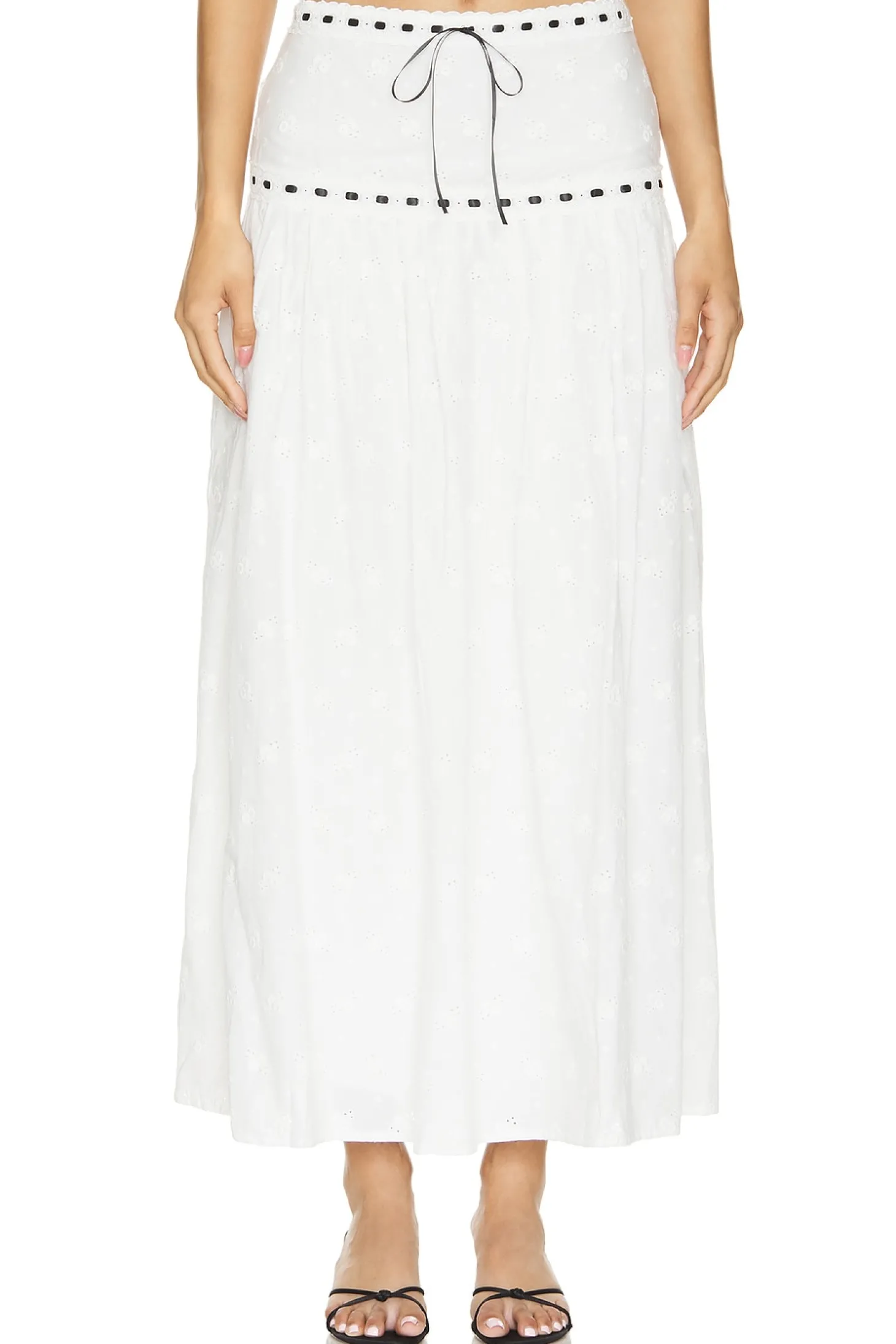 Shell: 100% cotton Lining: 100% viscose.Made in China.Hand wash cold.Fully lined.Hidden side zipper closure.Satin drawstring embellishment.Poplin fabric with floral embroidery.Skirt measures approx 37.5" in length
