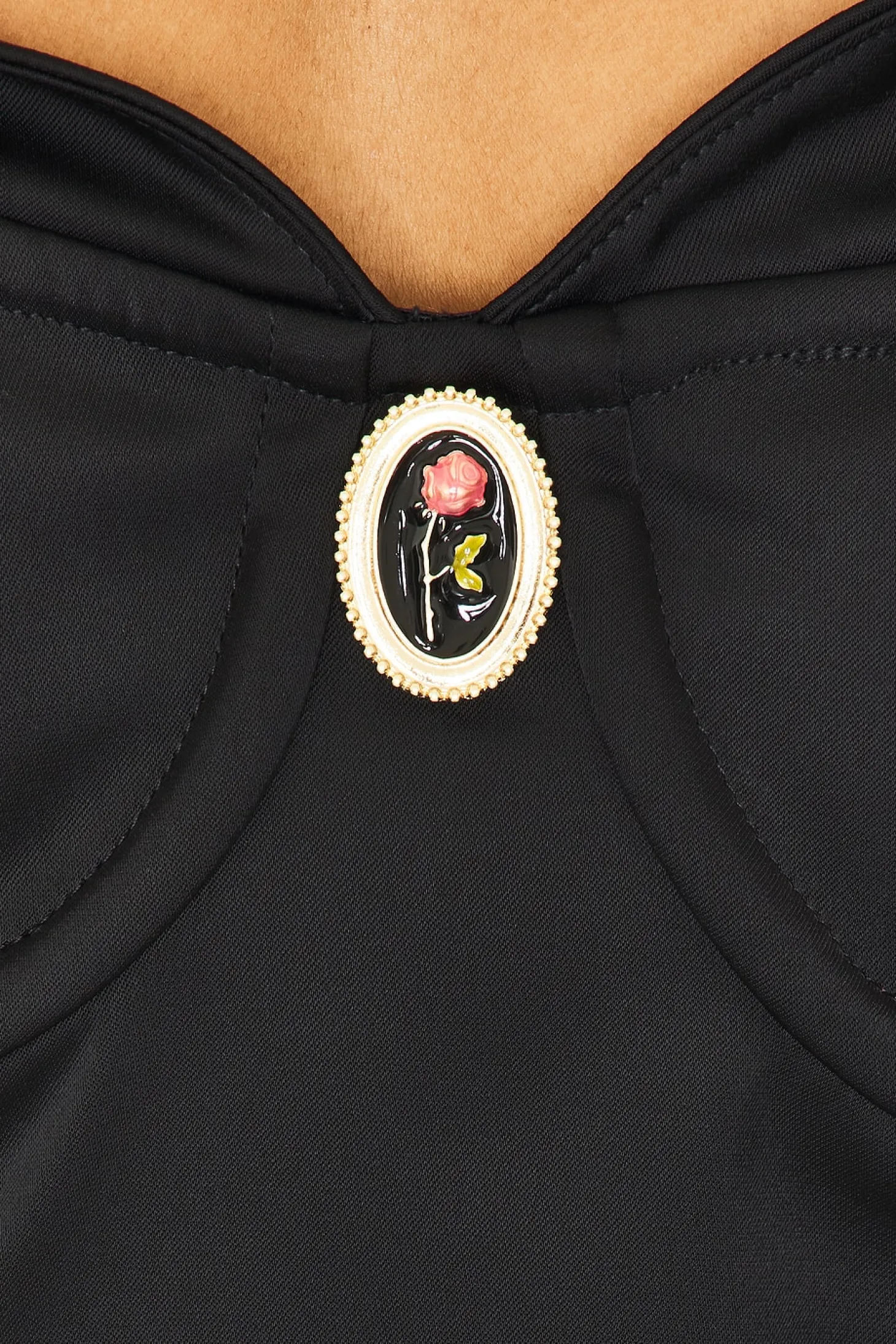 100% polyester.Made in China.Dry clean only.Back hook and eye closure.Underwire cups.Rose pendant at center.Satin fabric.Item not sold as set