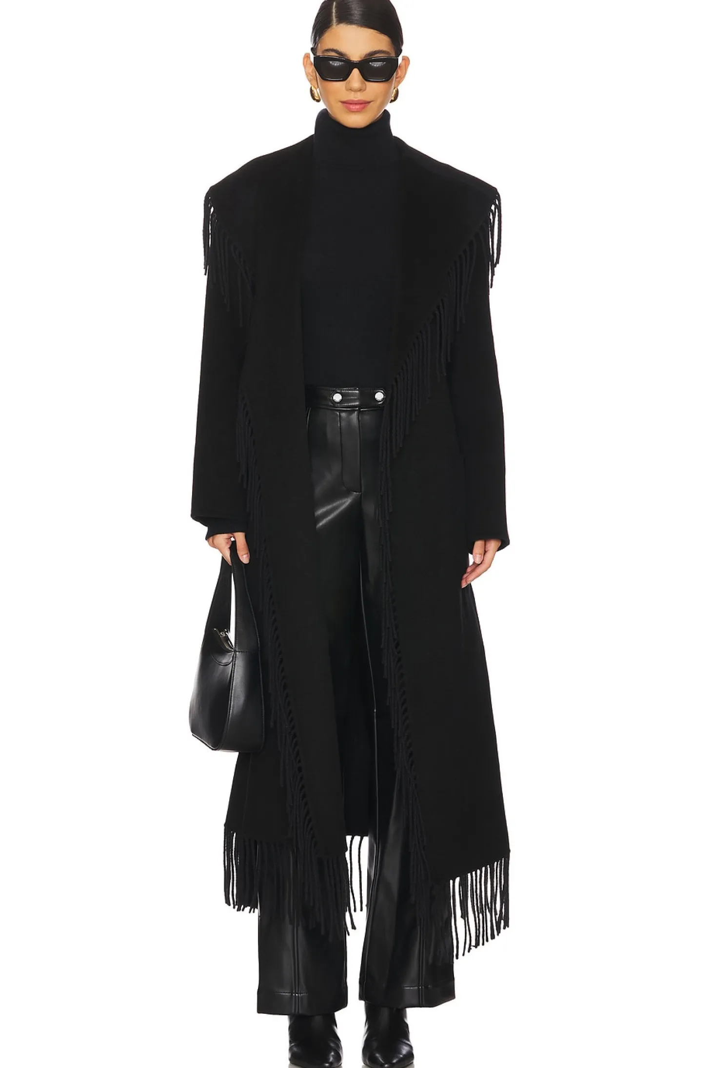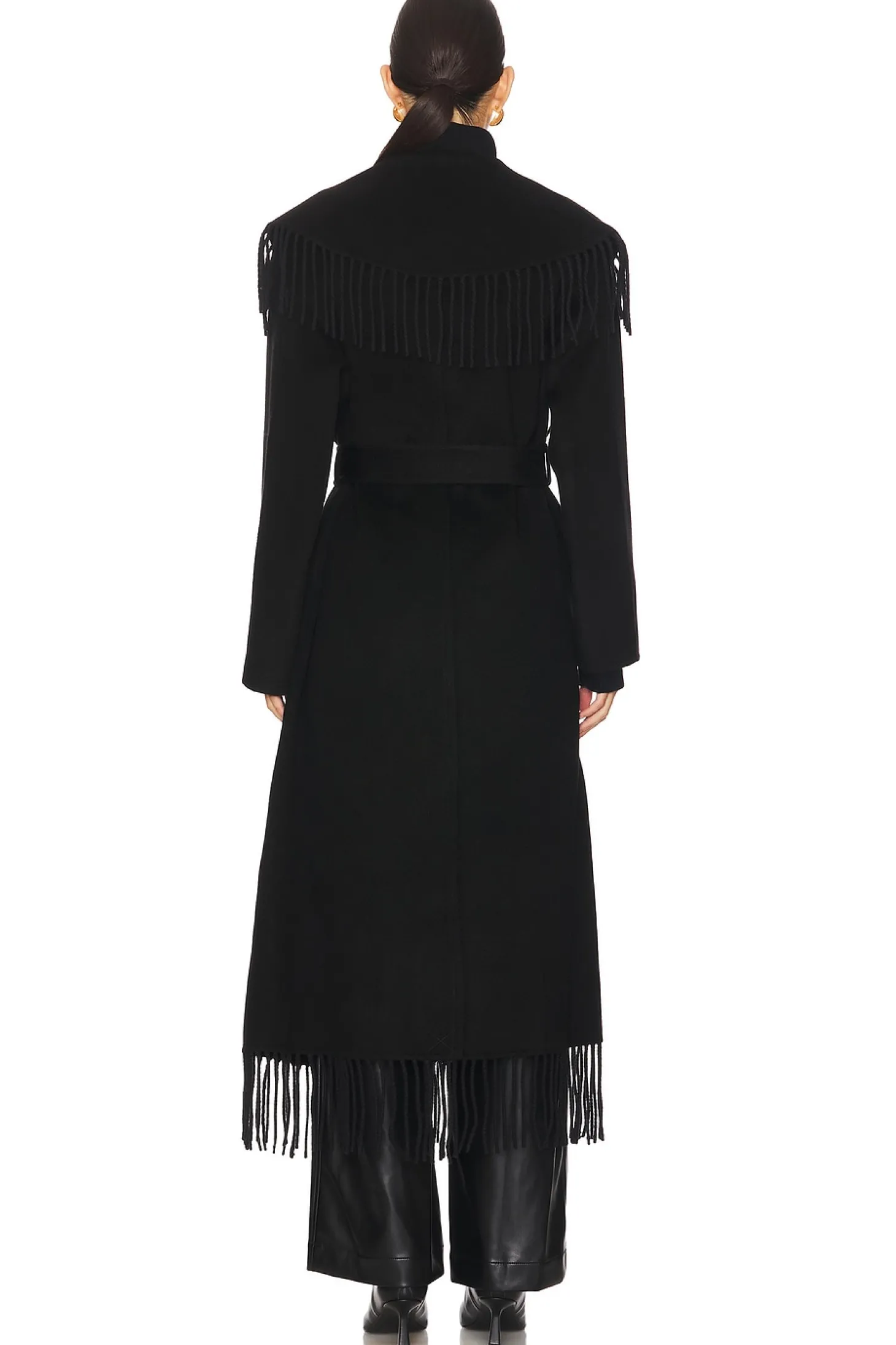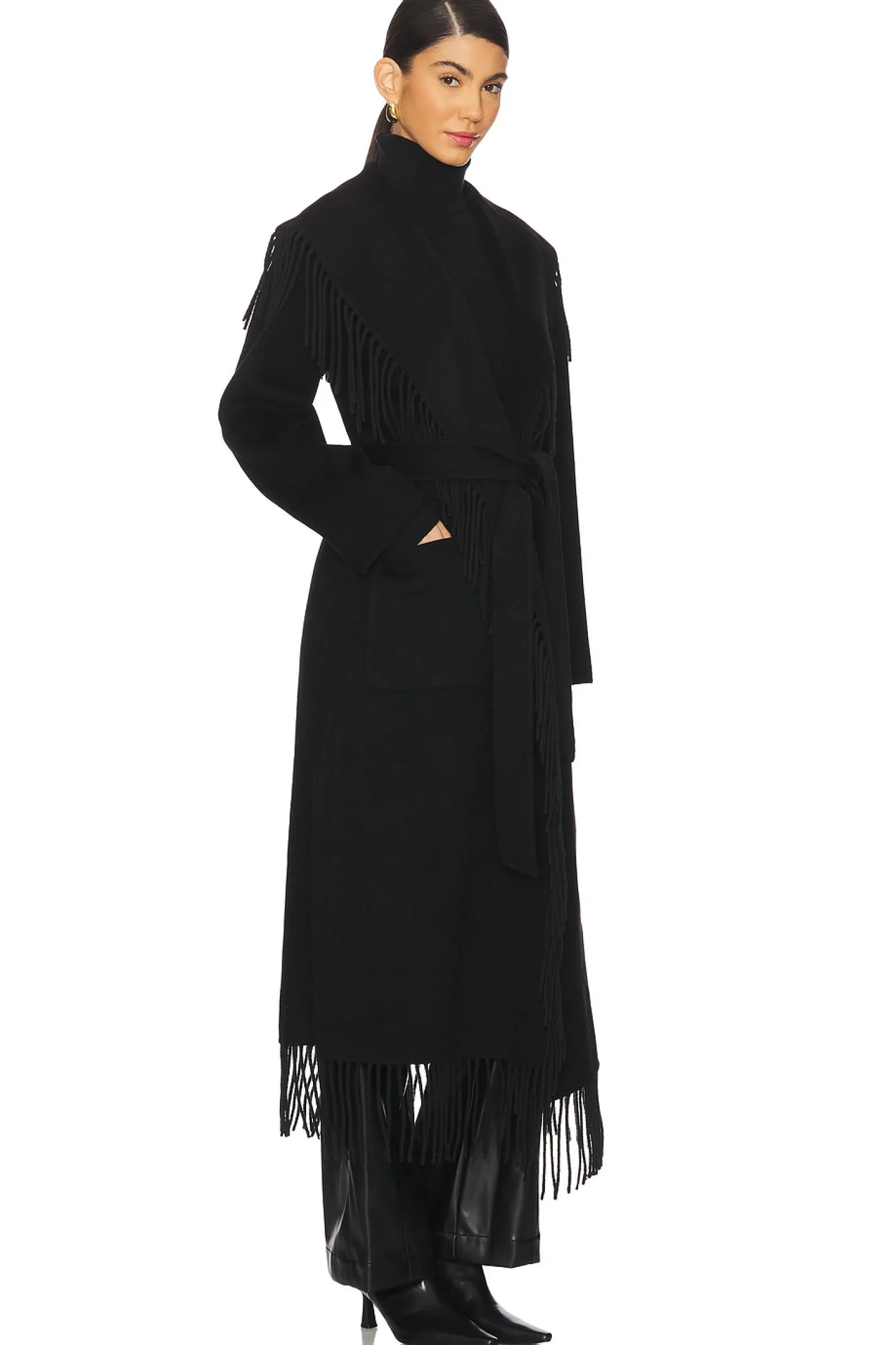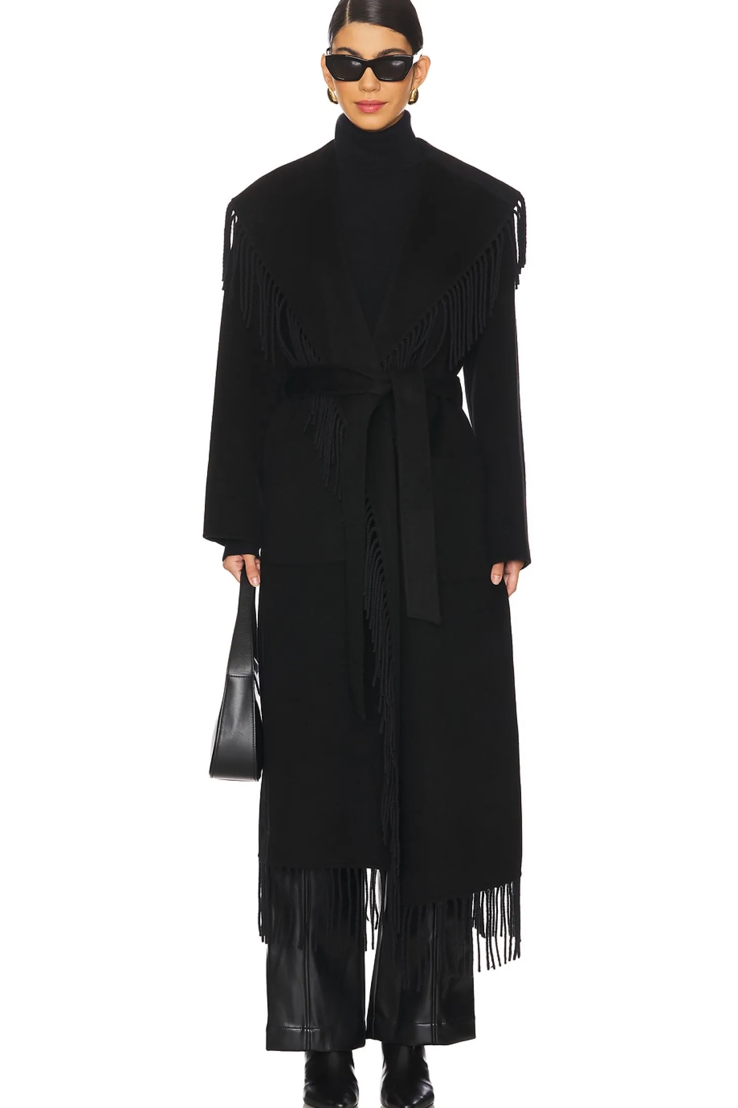 50% wool 50% polyester.Made in China.Dry clean only.Open style with optional waist tie.Slip pockets.Melton fabric with fringed trim