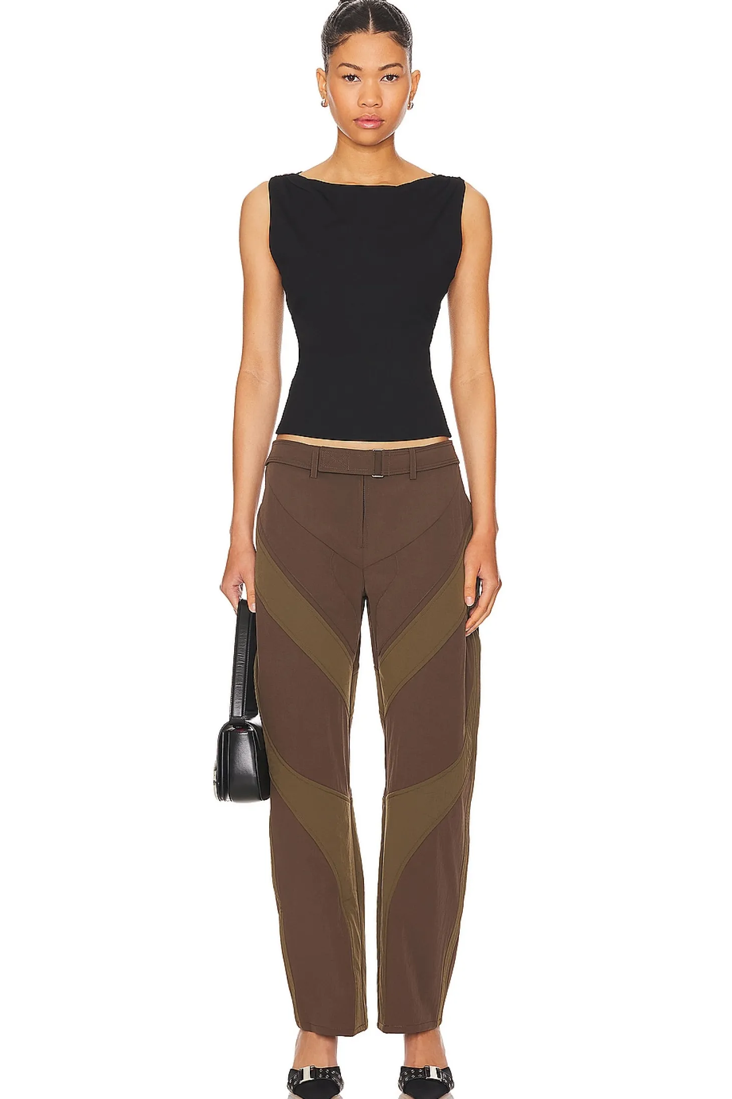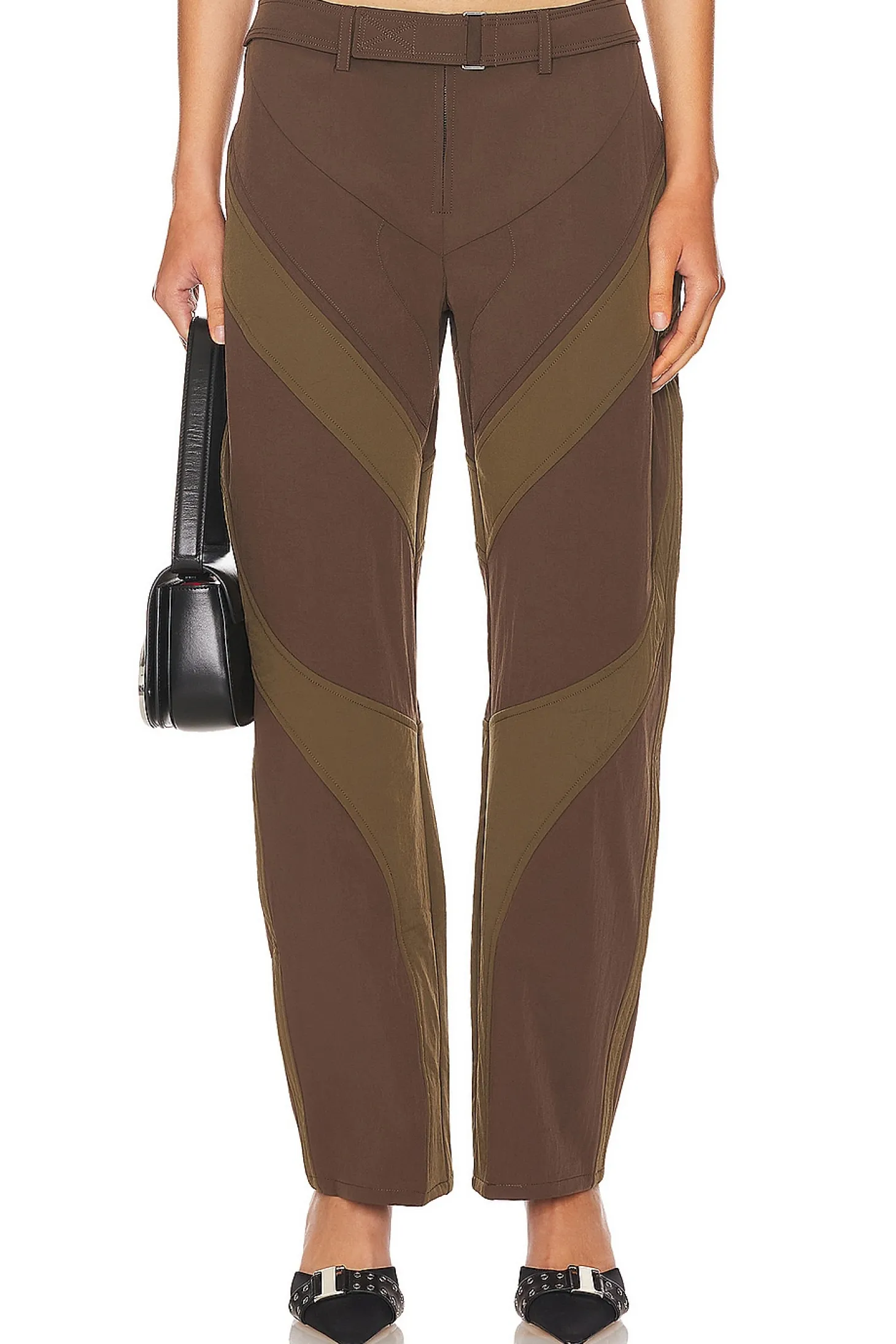 84% nylon 16% spandex.Made in China.Dry clean.Zip fly with attached waist belt.21" at the knee narrows to 16" at the leg opening