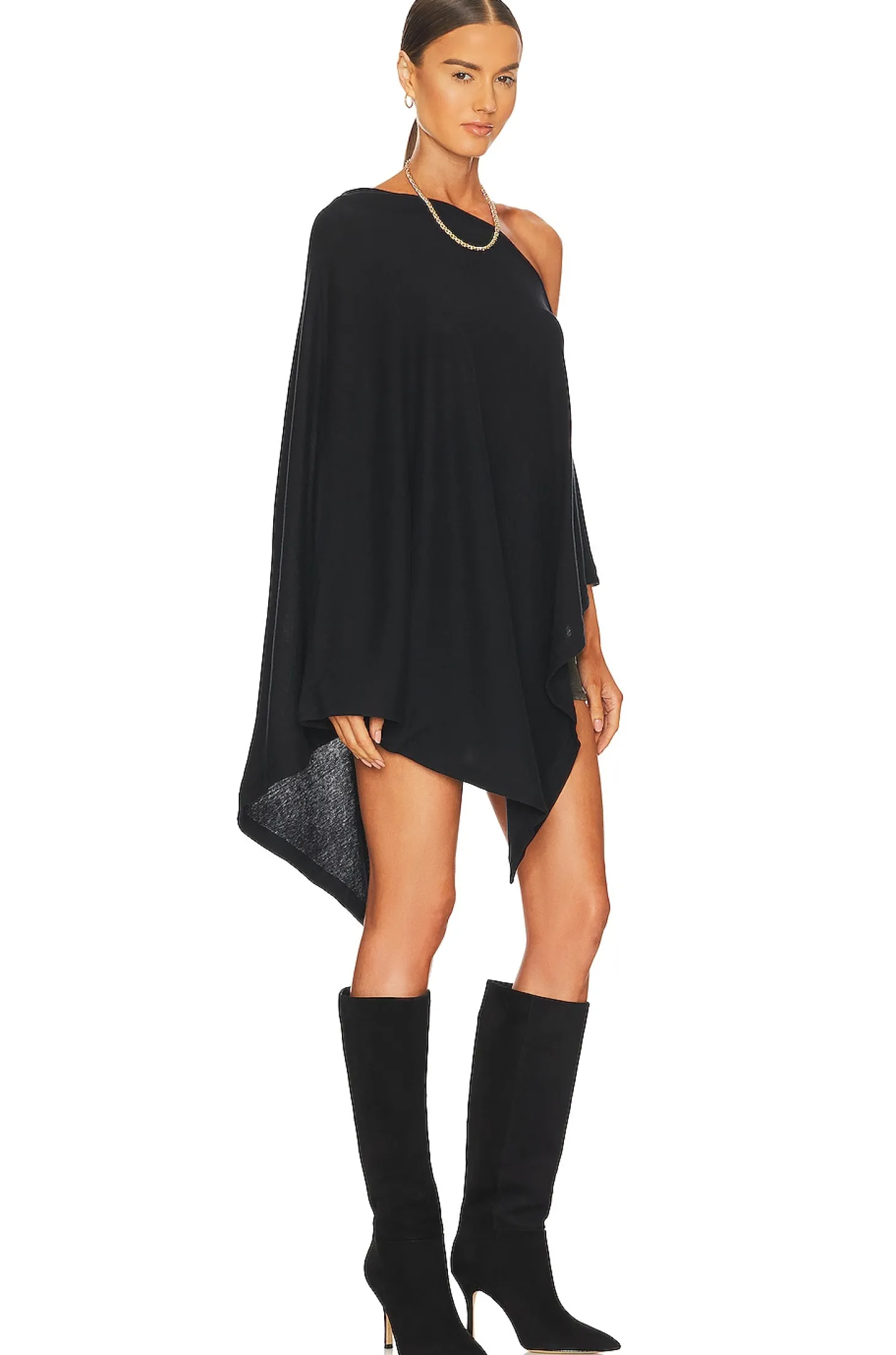 85% cotton 15% cashmere.Made in USA.Hand wash.Off shoulder styling.Soft knit fabric with kerchief hem