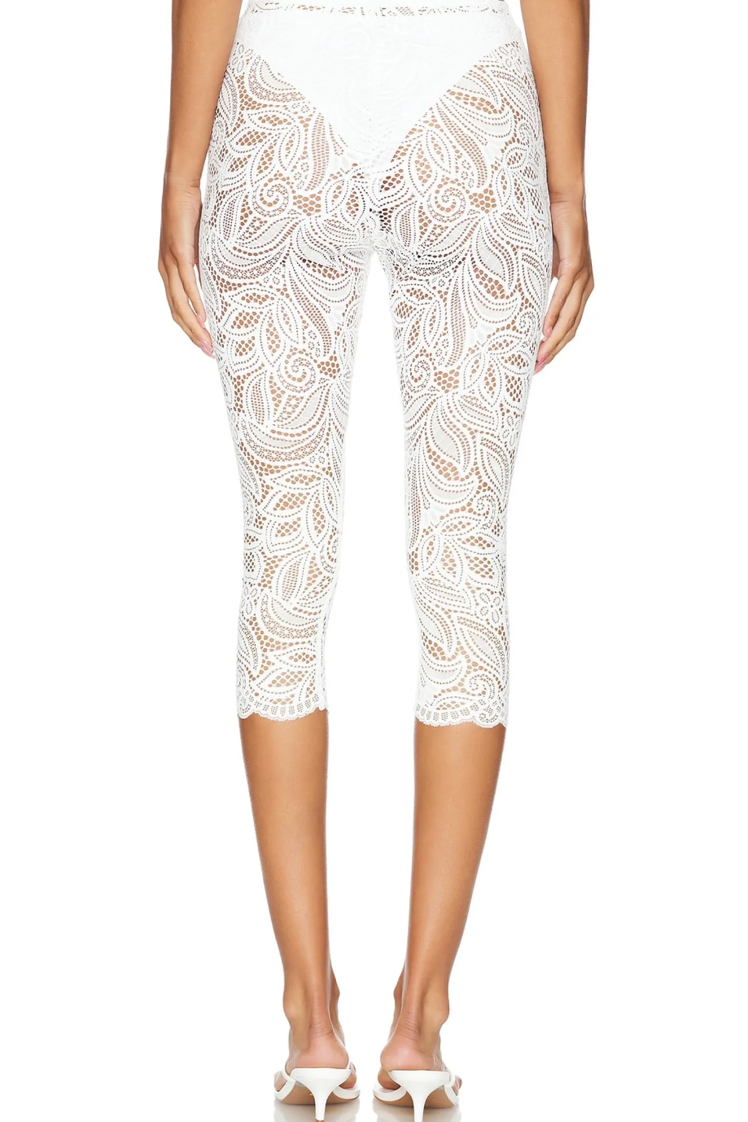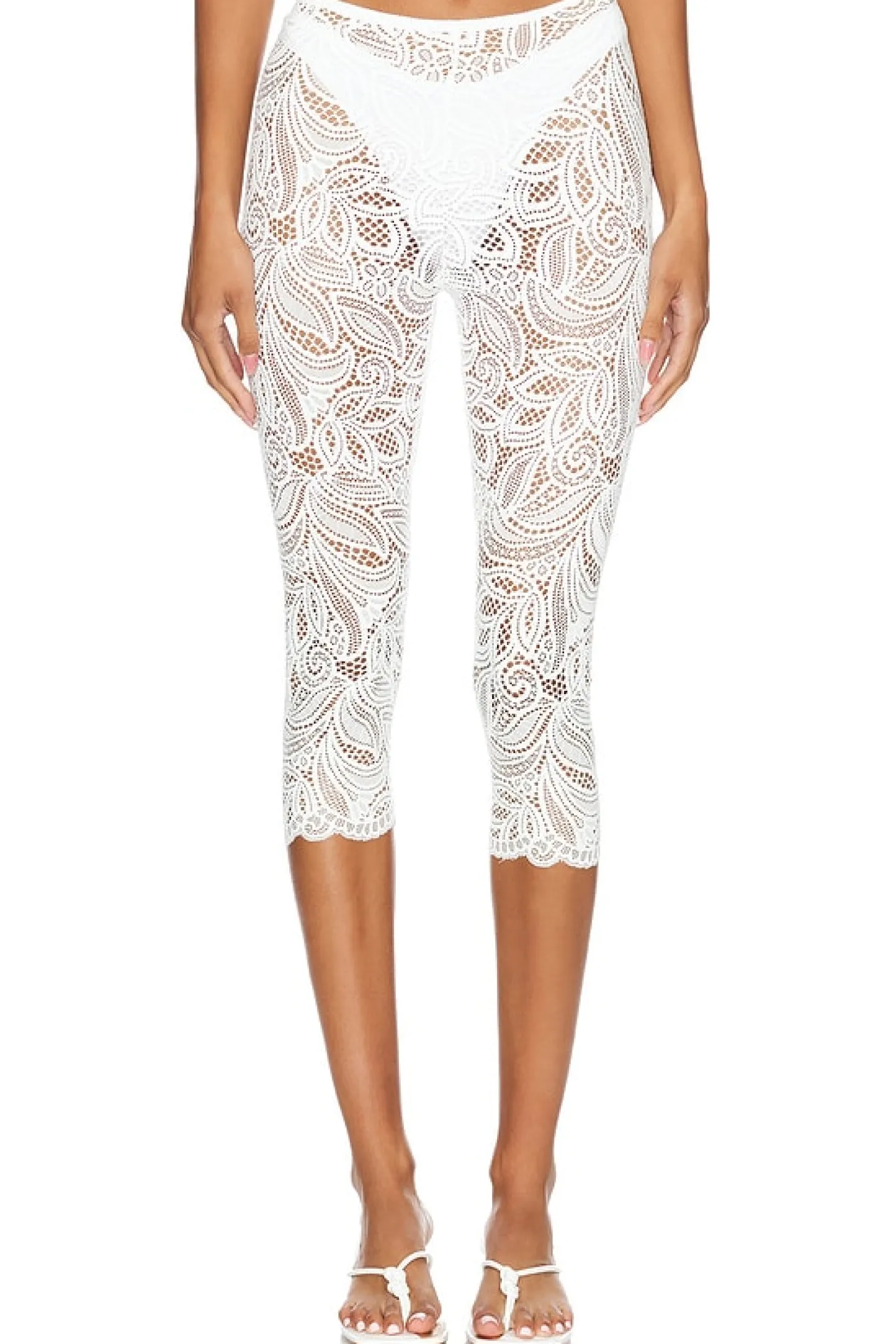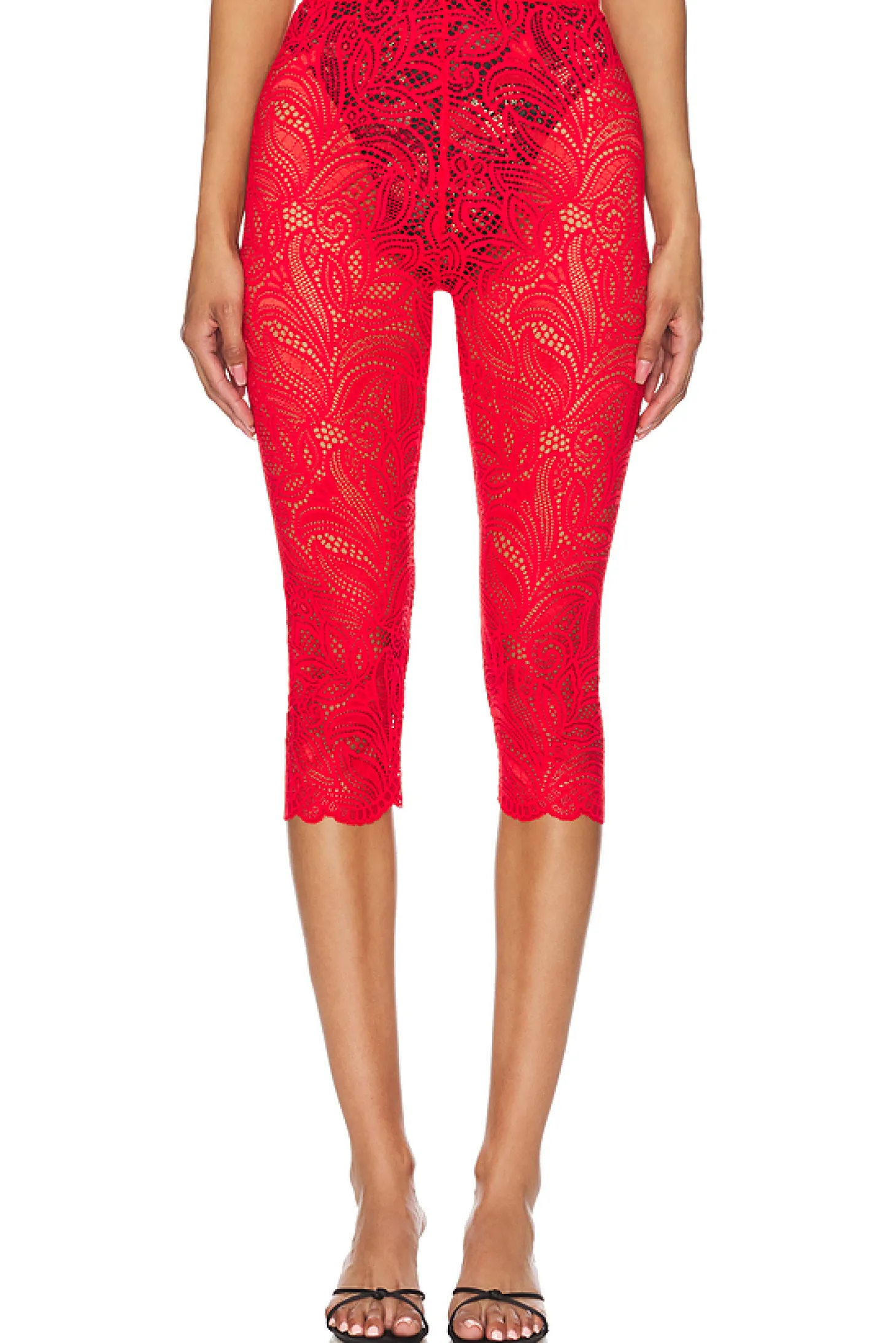 90% nylon 8% spandex 2% rayon.Made in Portugal.Hand wash.Stretch lace fabric.Item not sold as a set.Garment is intentionally sheer, undergarments will show through. Please note undergarment not included.Leggings measure approx 30" in length
