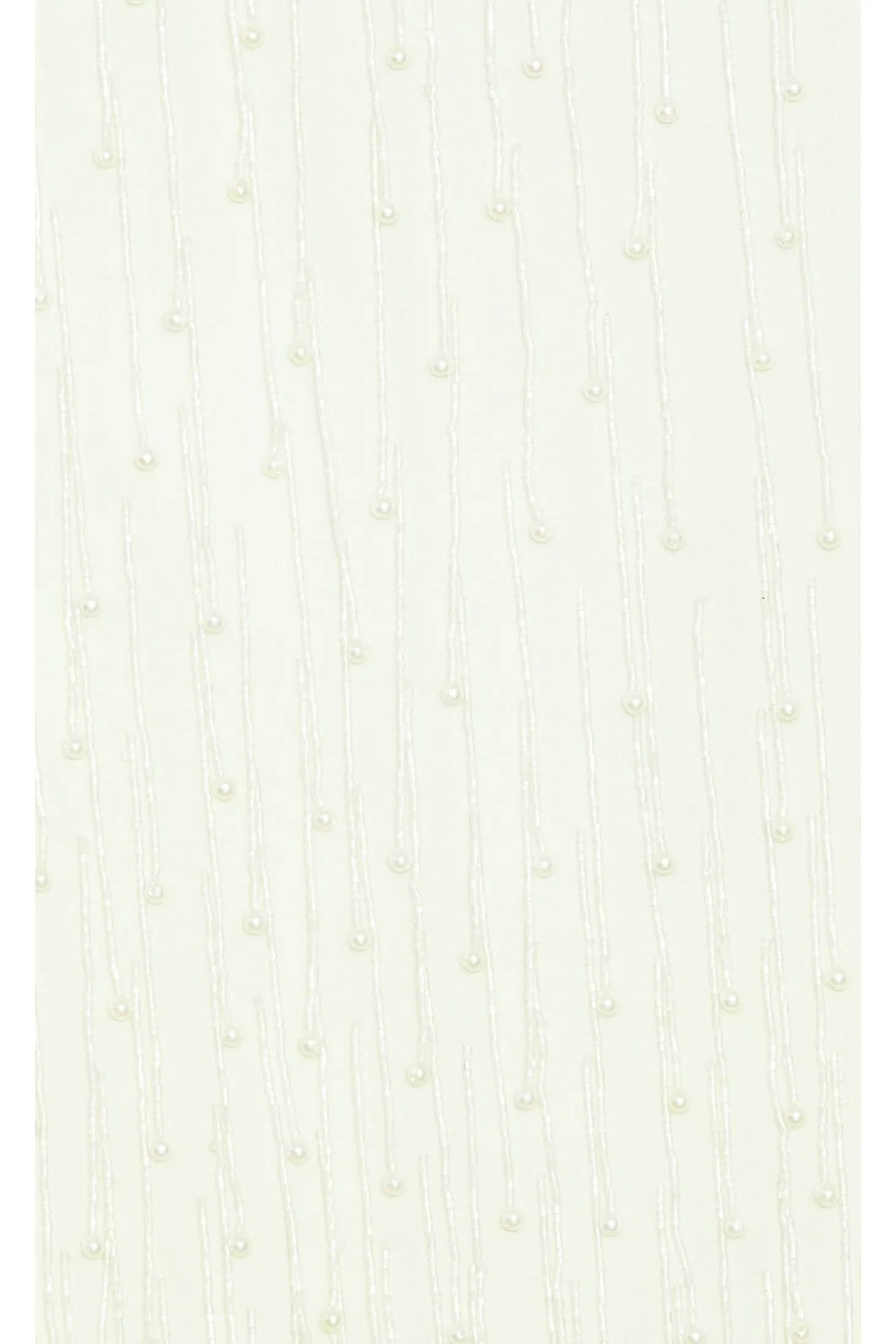 Lightweight crepe textile with beaded and pearl fringe Shell: 1; 100% viscose Shell: 2; 100% viscose .Made in India.Dry clean recommended.Fully lined.Hidden side zipper closure.Adjustable shoulder straps