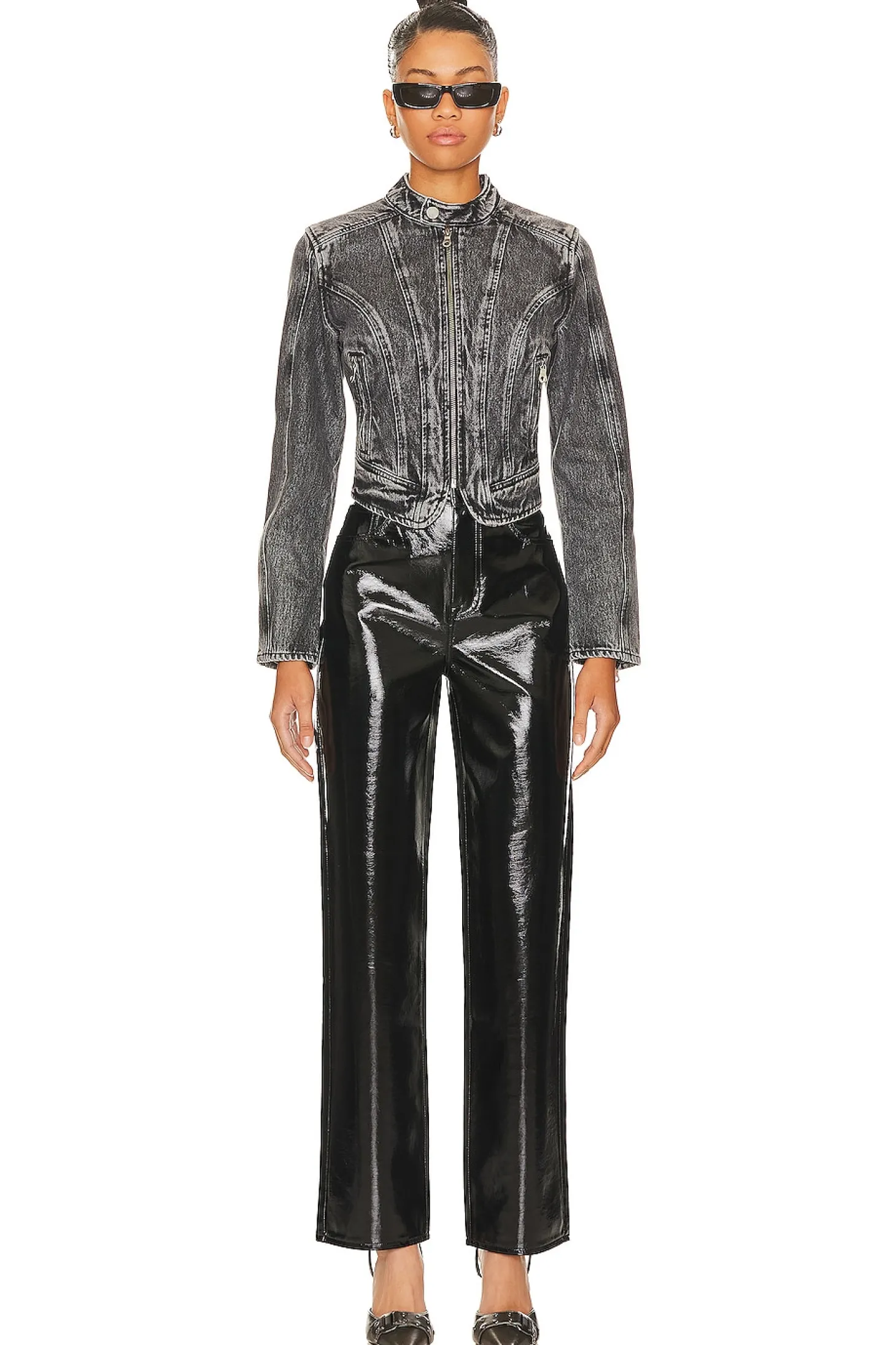 100% polyurethane.Made in China.Machine wash.Zip fly with button closure.5-pocket styling.Faux leather fabric.17" at the knee narrows to 16" at the leg opening