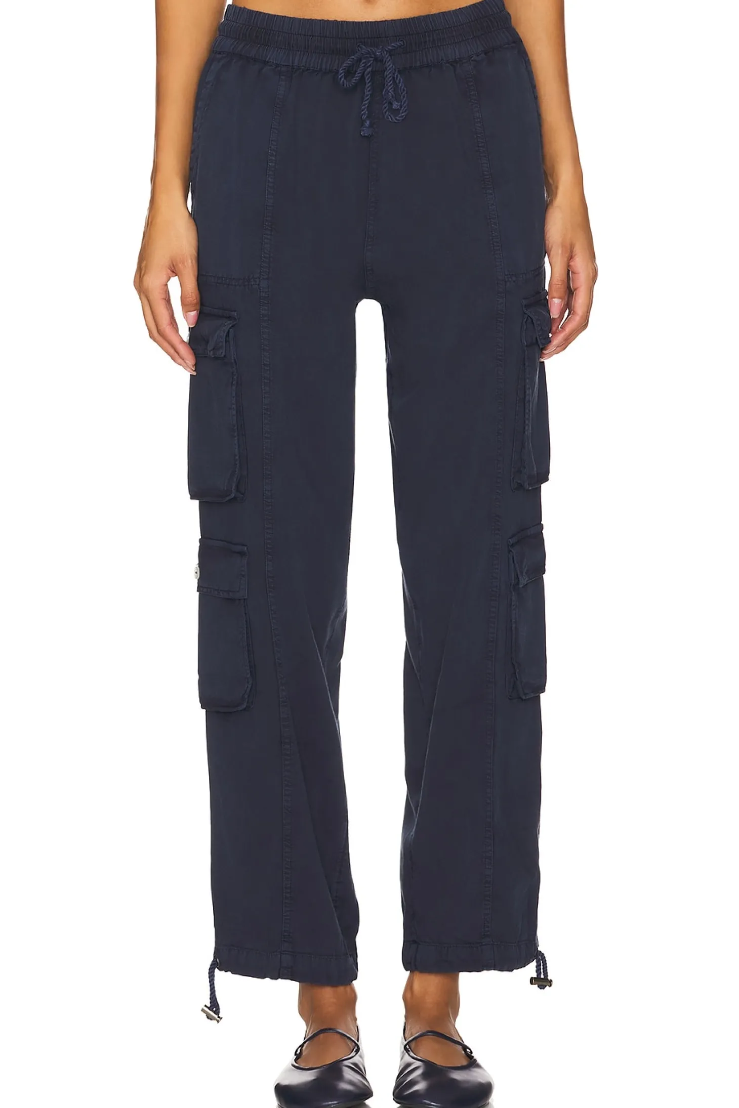 55% cotton 45% viscose.Made in India.Hand wash.Drawstring closure.4-pocket design.Cargo pockets Drawstring cuffs.Lightweight twill fabric Item not sold as a set.19" at the knee narrows to 14" at the leg opening