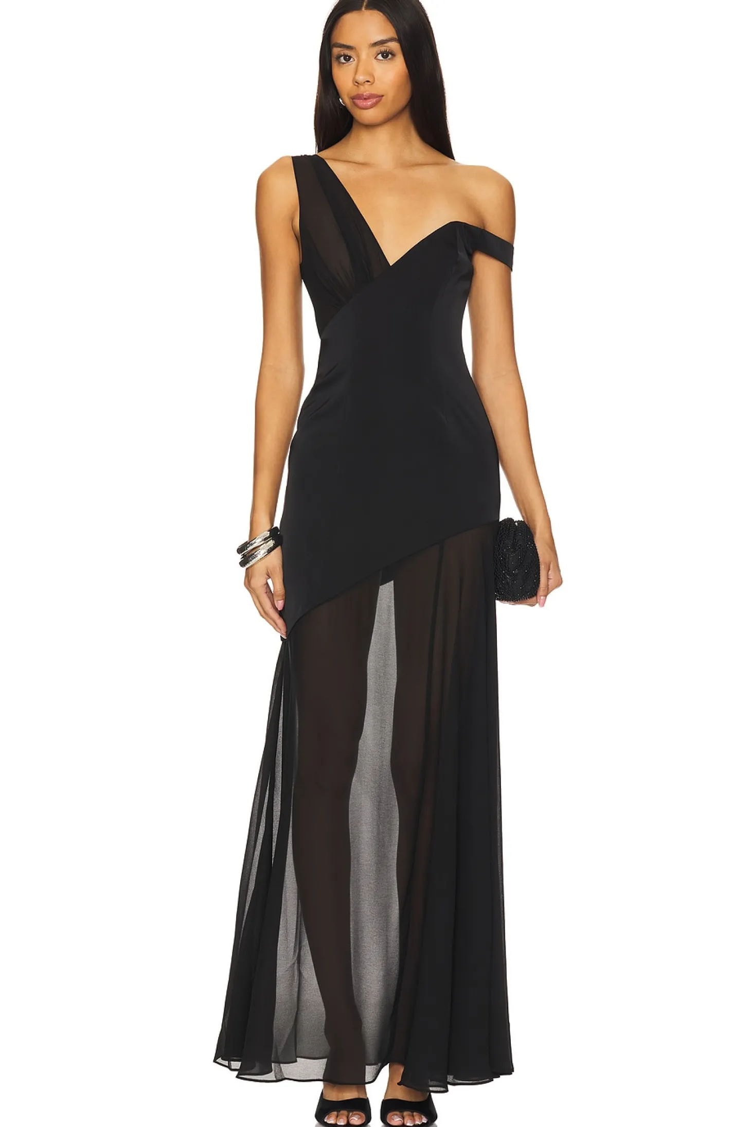 Self: 96% polyester 4% elastane Contrast Fabric: 100% polyester.Made in China.Dry clean only.Partially lined.Hidden back zip closure.One shoulder styling.Midweight satin fabric with mesh cut outs