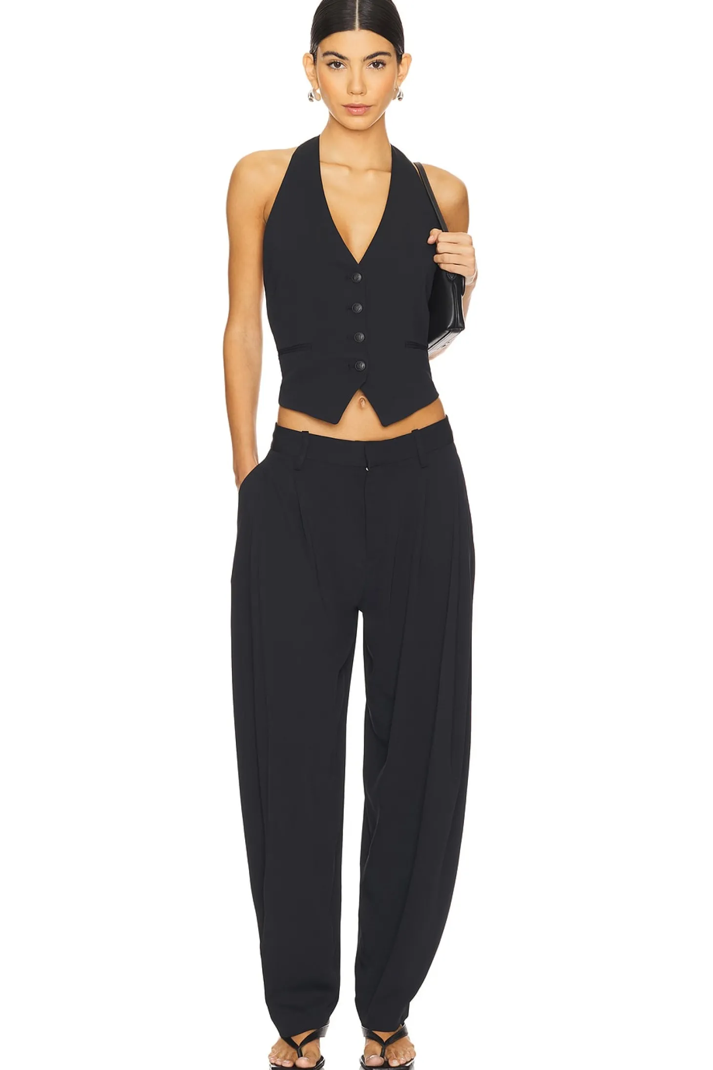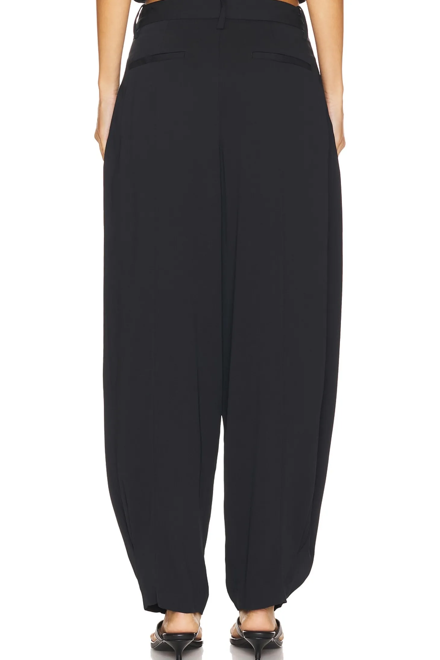 Self: 97% viscose 3% elastane Pocket Lining: 60% polyester 40% cotton.Made in Vietnam.Dry clean only.Zip fly with hook and bar closure.4-pocket design.Lightly pleated crepe fabric.Item not sold as set.27" at the knee narrows to 16" at the leg opening
