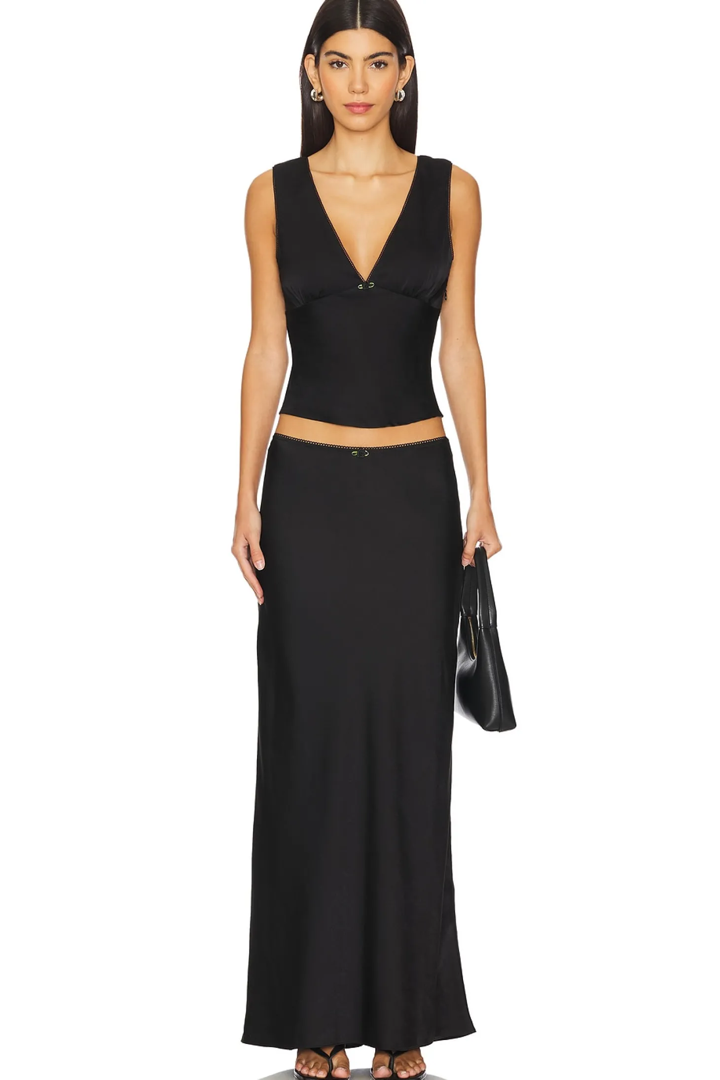 100% polyester.Made in China.Hand wash.Hidden side zipper closure.Back tie closure.Satin fabric with rosette embellishment.Black