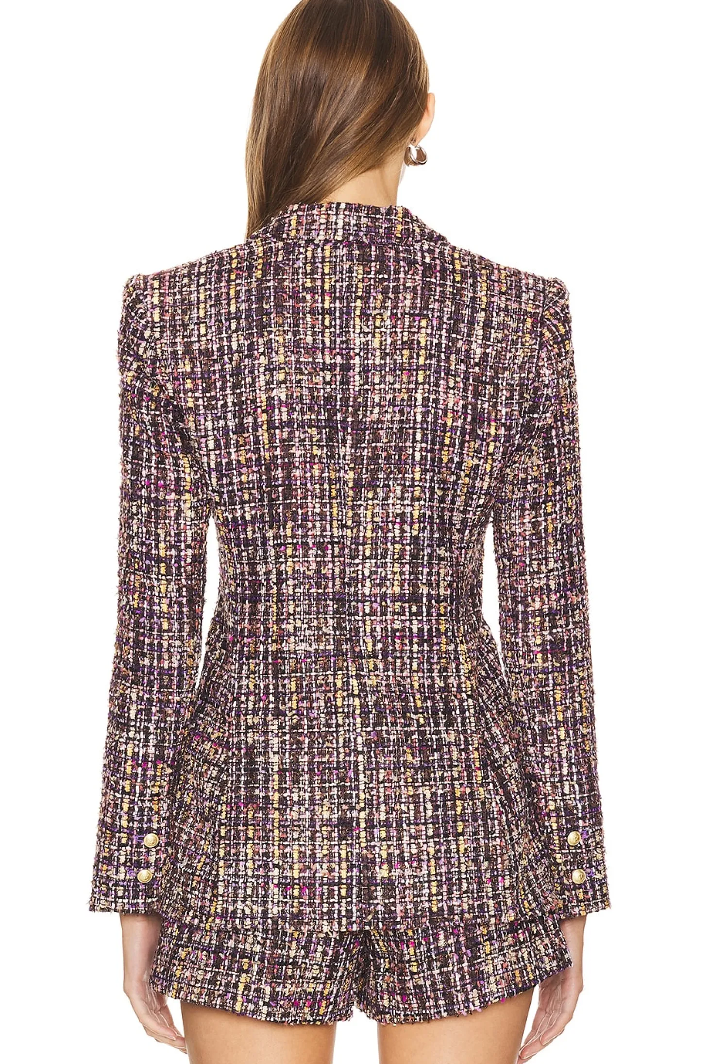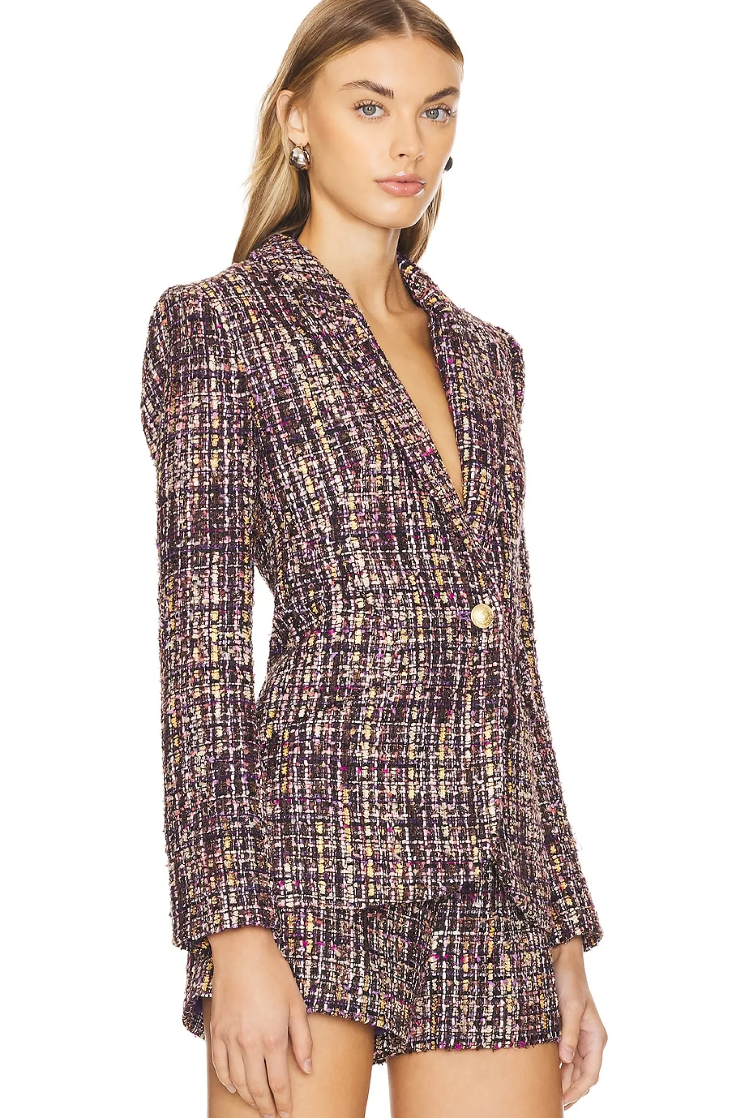 100% polyester.Made in China.Dry clean.Front button closure.Tweed fabric with padded shoulders and flaps mimicking pockets.Item not sold as a set