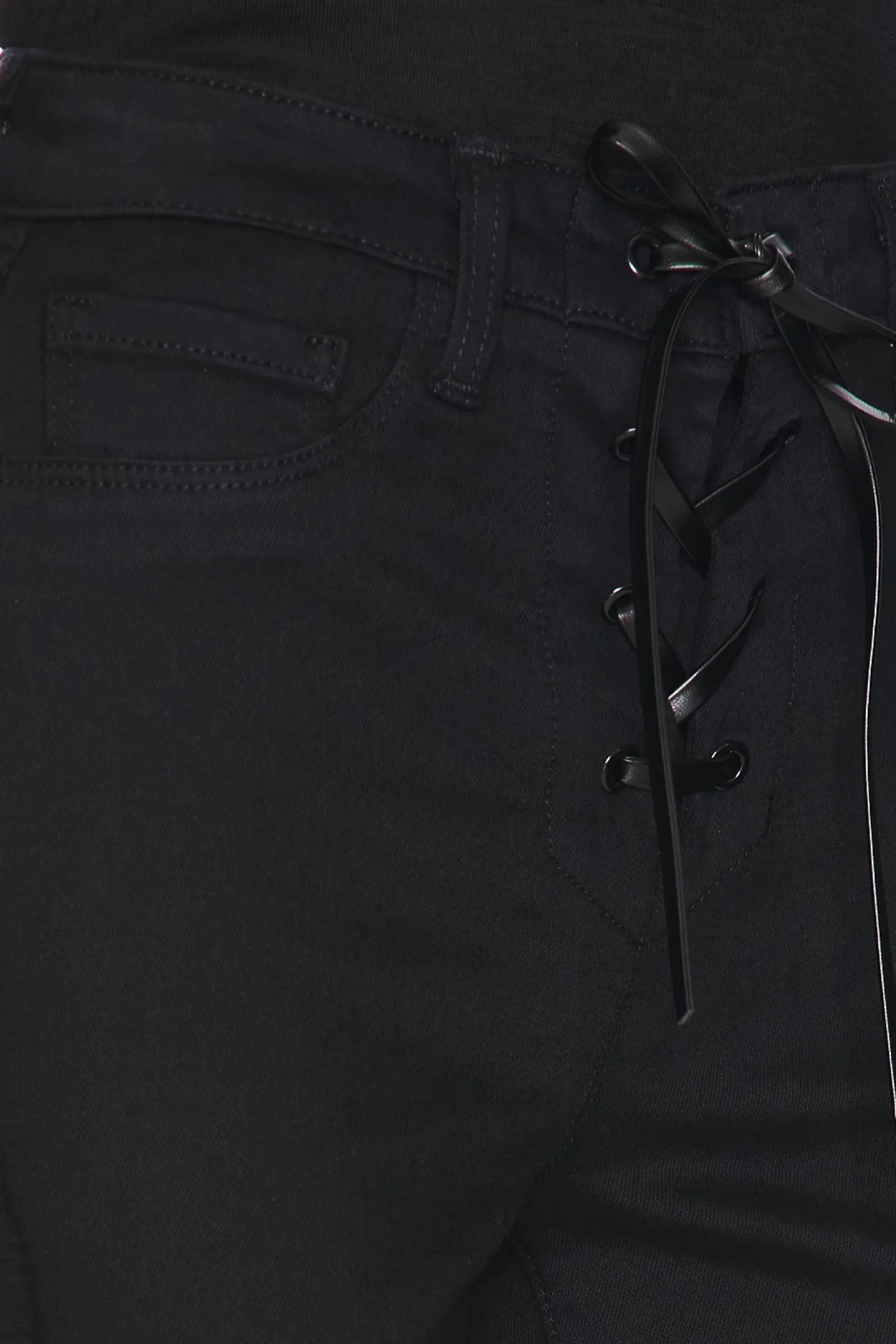 86% cotton 11% elastane 3% spandex.Made in USA.Machine wash.Front lace-up closure.5-pocket styling.Midweight twill fabric.13" at the knee breaks to 19" at the leg opening