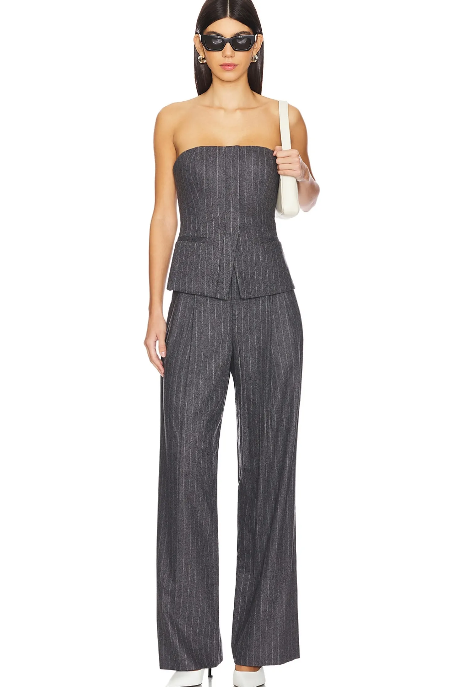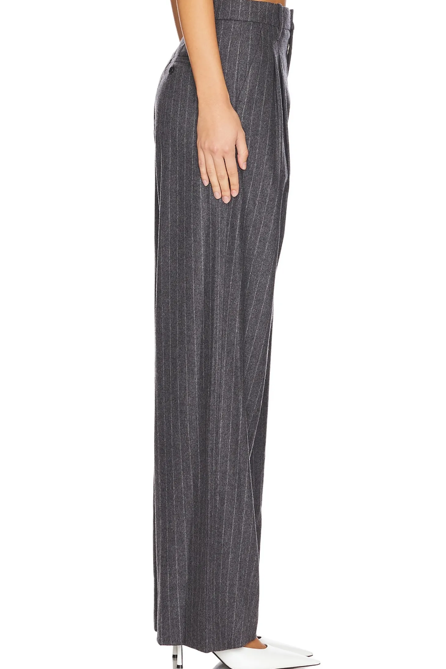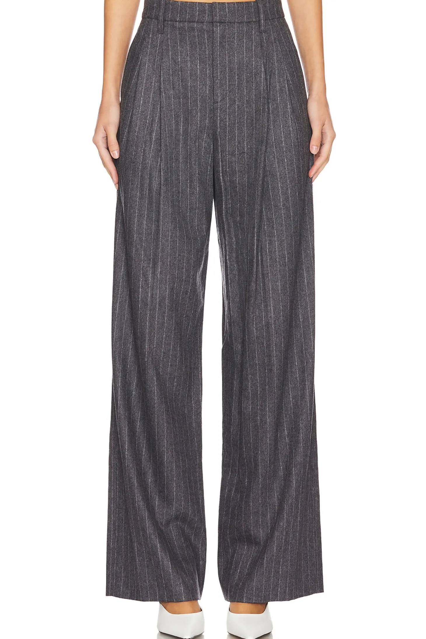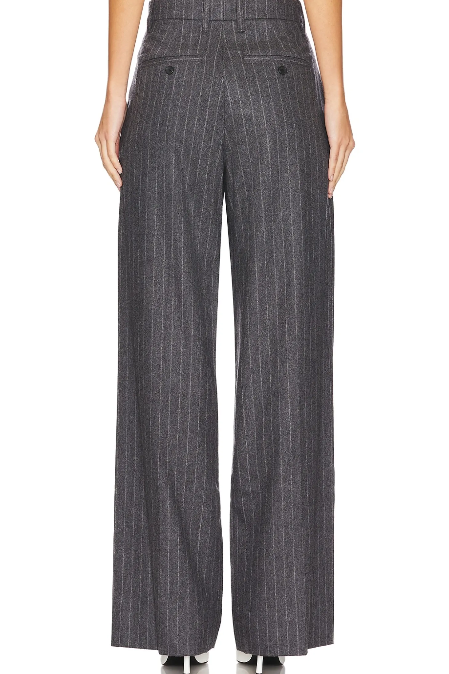 90% wool 8% cashmere 2% elastane.Made in Vietnam.Dry clean only.Zip fly with hook and bar closure.4-pocket design.Twill fabric with pleated detail.Item not sold as set.23" at the knee narrows to 22" at the leg opening