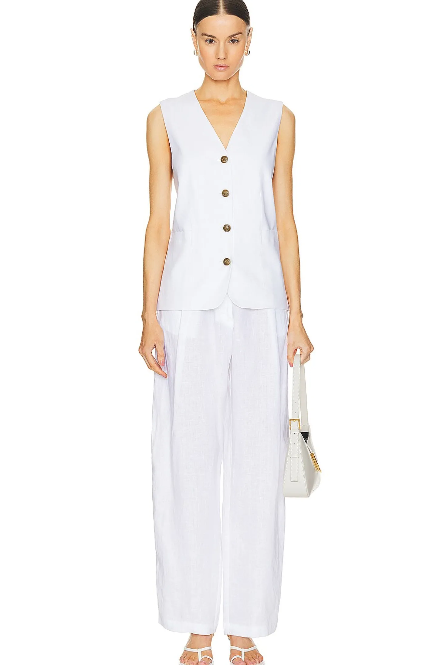 Self: 52% linen 46% rayon 2% spandex Lining: 97% rayon 3% spandex.Made in Vietnam.Dry clean only.Front button closure.Front welt pockets.Back adjustable strap.Lightweight linen fabric.Item not sold as a set