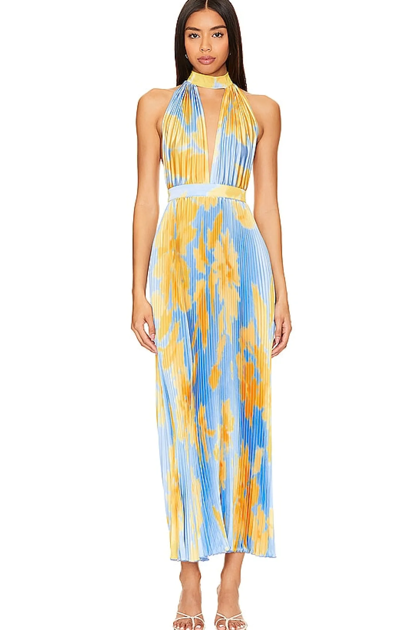 100% polyester.Made in Indonesia.Hand wash.Unlined.Halterneck styling with hidden back zipper closure.Front cut-out.Plisse fabric
