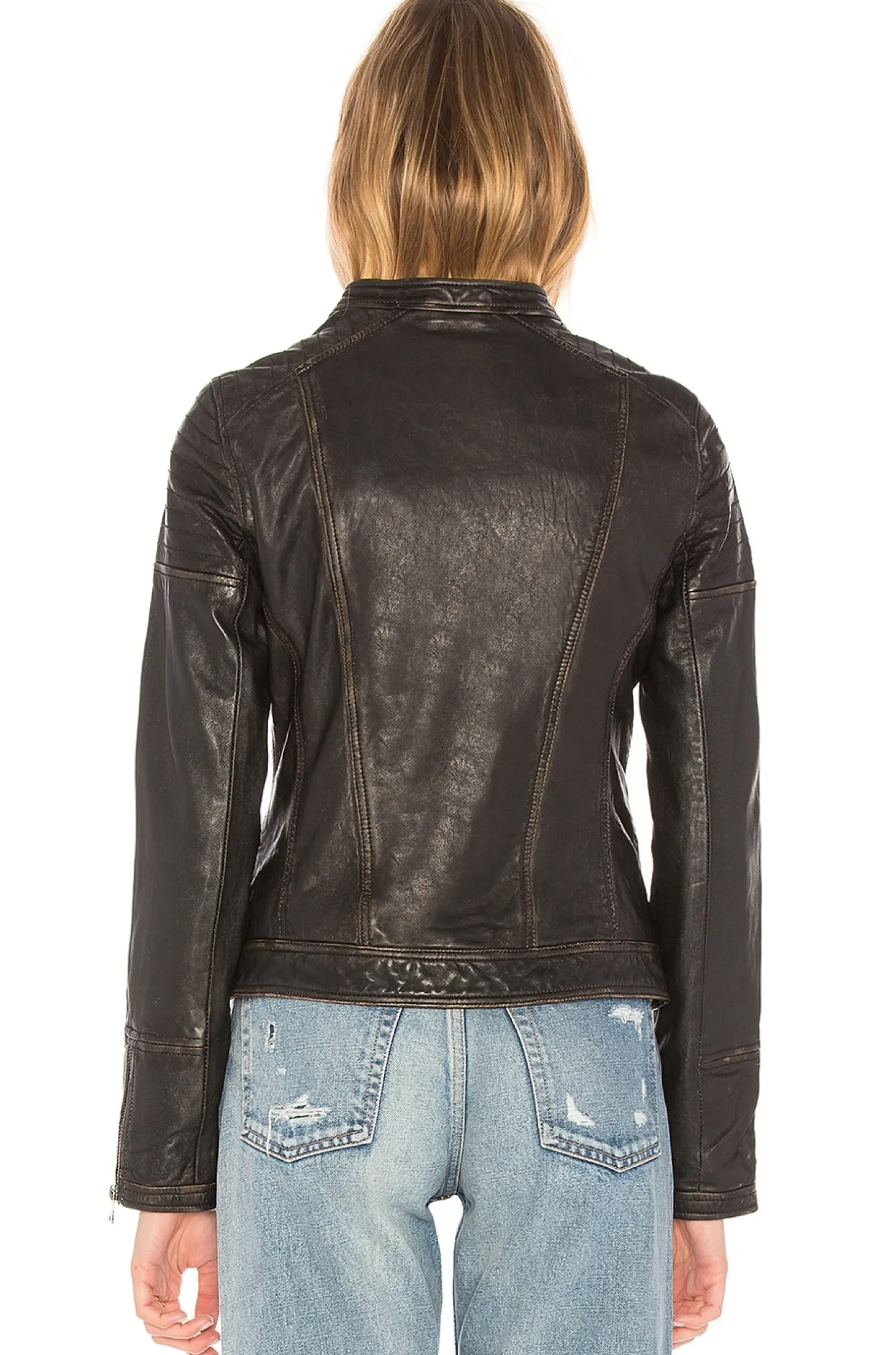 Self: 100% leather Lining: 97% poly 3% spandex.Made in India.Professional leather cleaning recommended.Front zipper pockets.Ribbed panels.Zipper closure gussets on sleeves.Zipper front closure.Please note: Due to the unique leather treatment, each garment will vary in color
