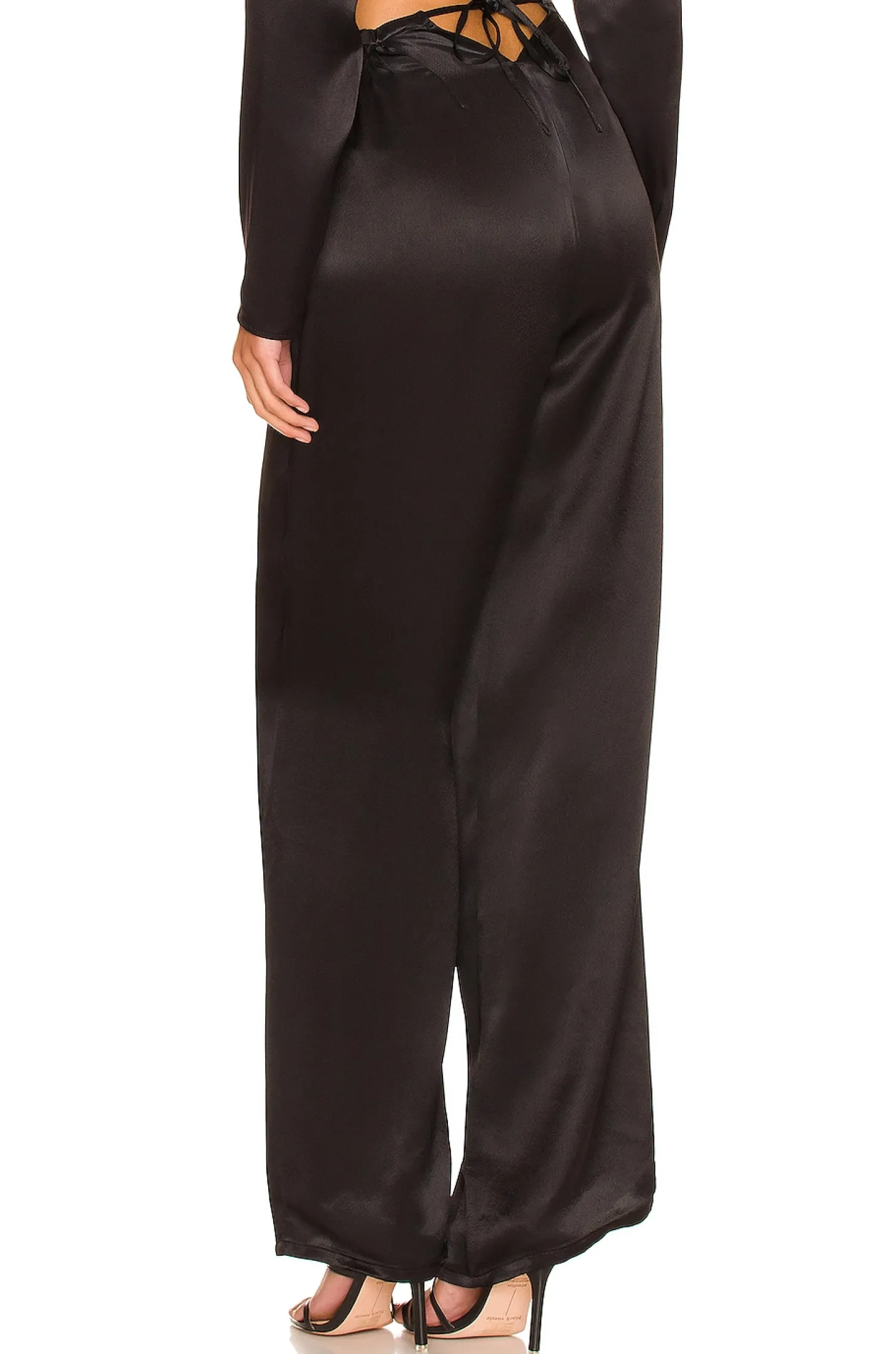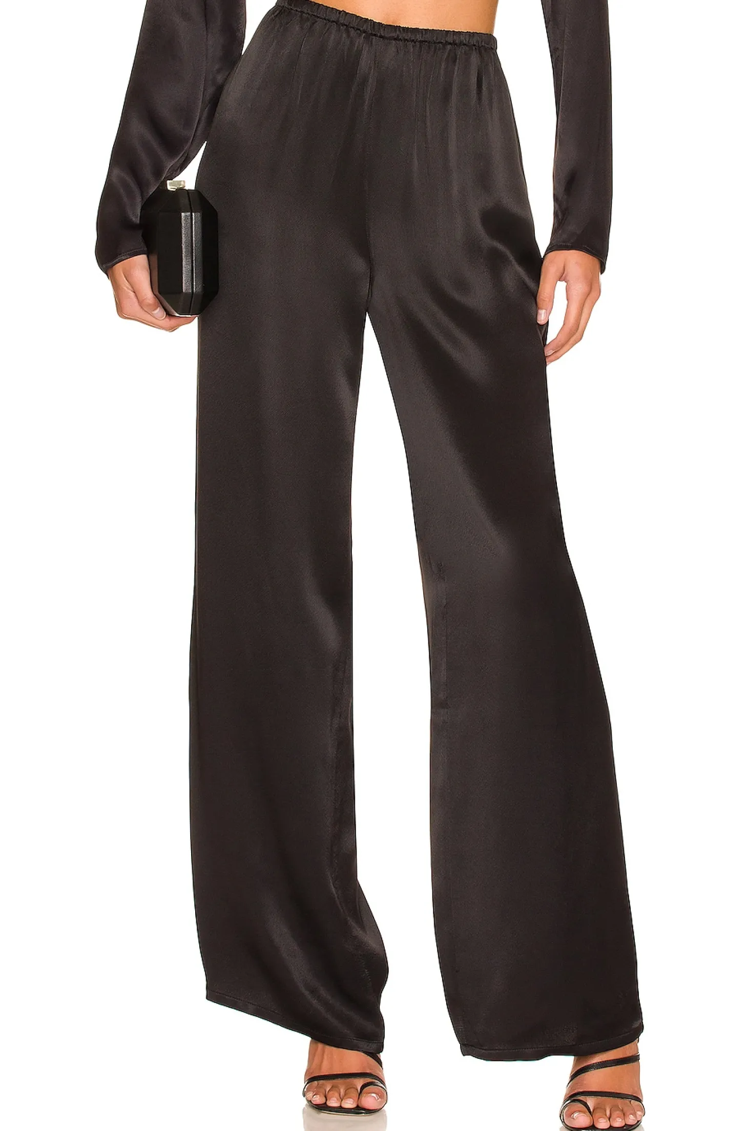 100% viscose.Made in China.Dry clean only.Elastic waistband with back tie closure.Satin fabric.22" at the knee and 22" at the leg opening