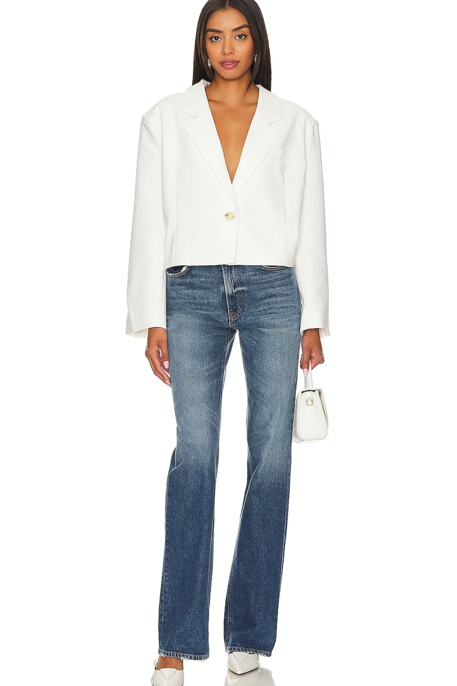 Self: 70% polyester 28% rayon 2% spandex Lining: 100% polyester.Made in China.Hand wash.Singular front button closure.Padded shoulders.Breast slip pocket.Buttoned cuffs.Midweight crepe fabric