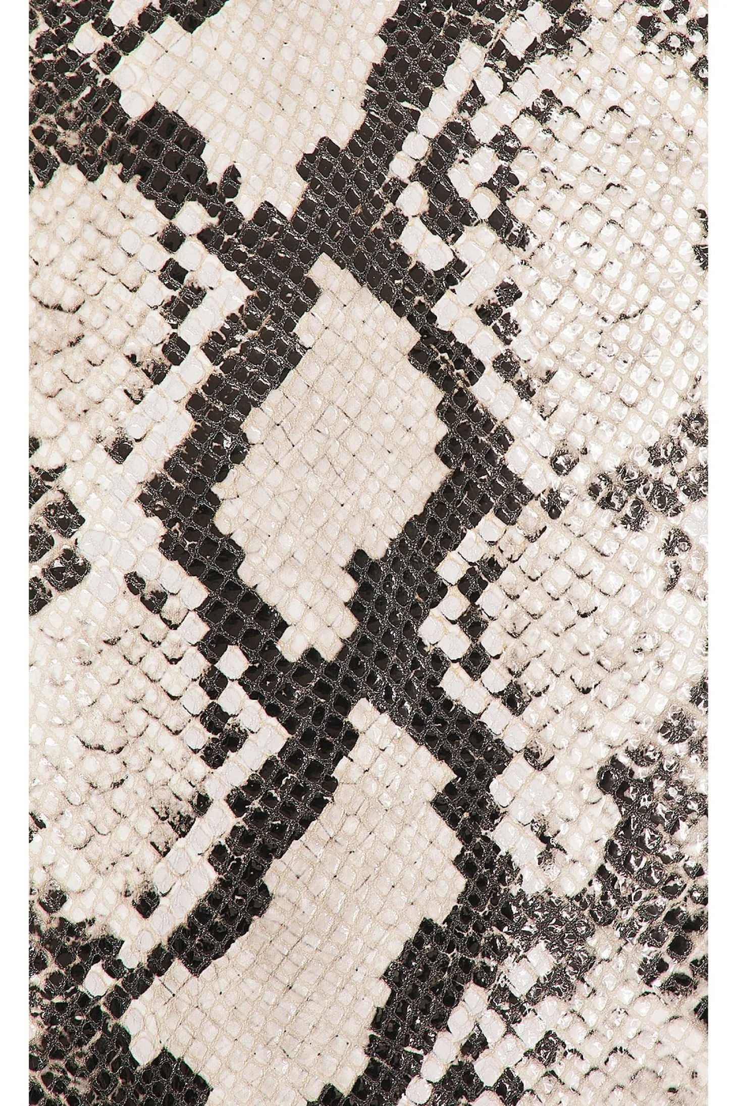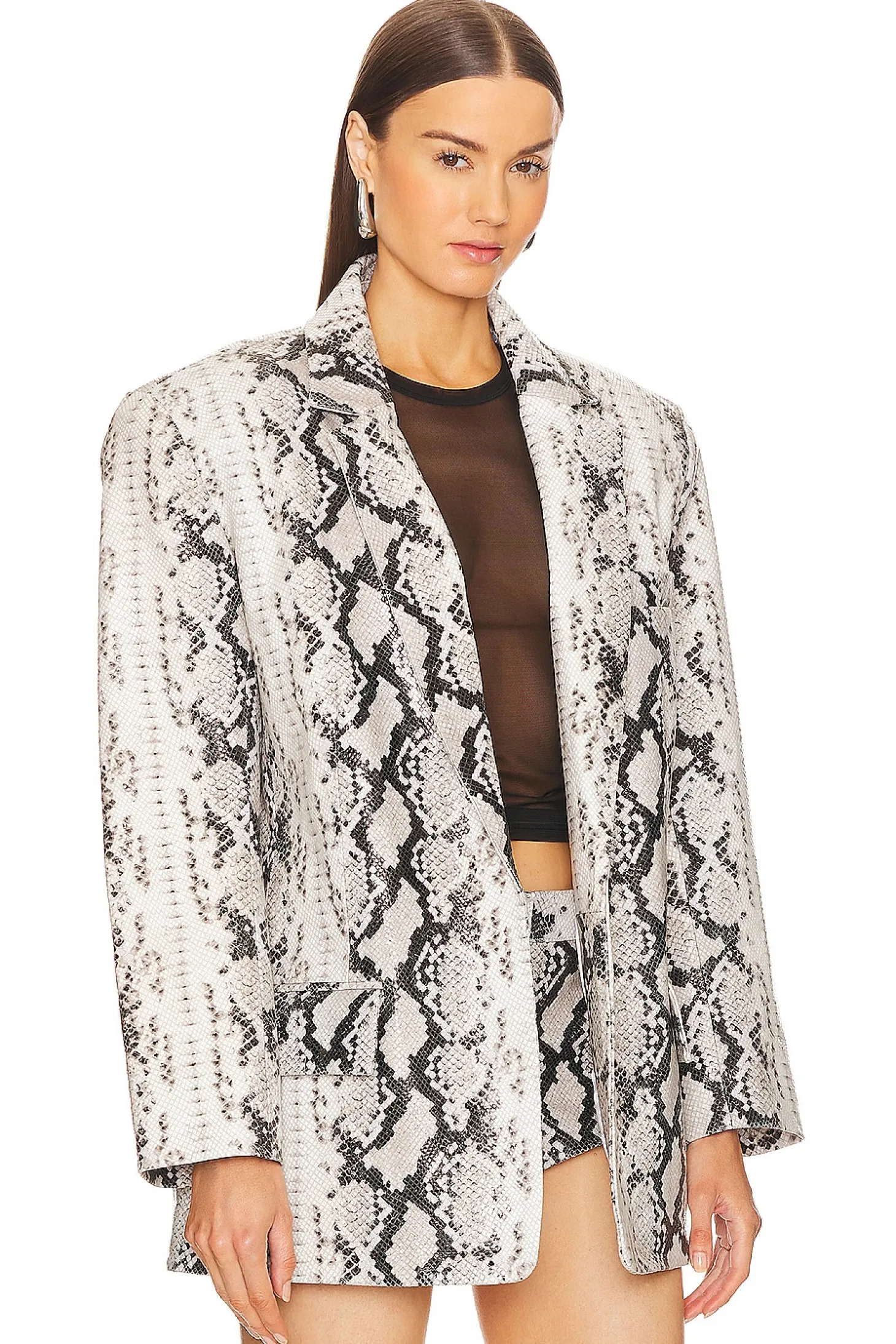 Self: 100% leather Lining: 95% polyester 5% elastane.Made in India.Professional leather clean only.Open front.3-pocket design.Padded shoulders.Midweight snake embossed patent leather fabric.Item not sold as a set