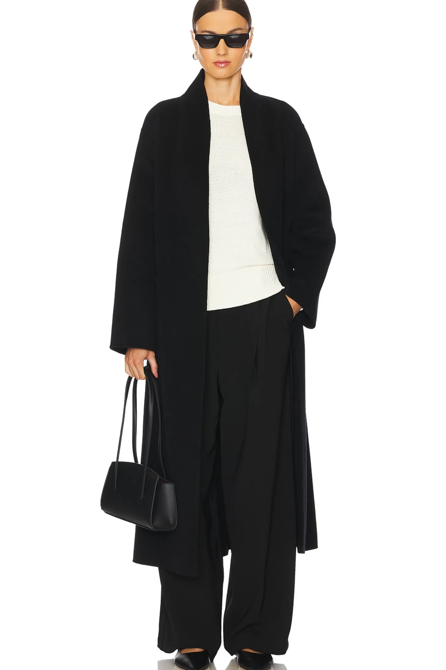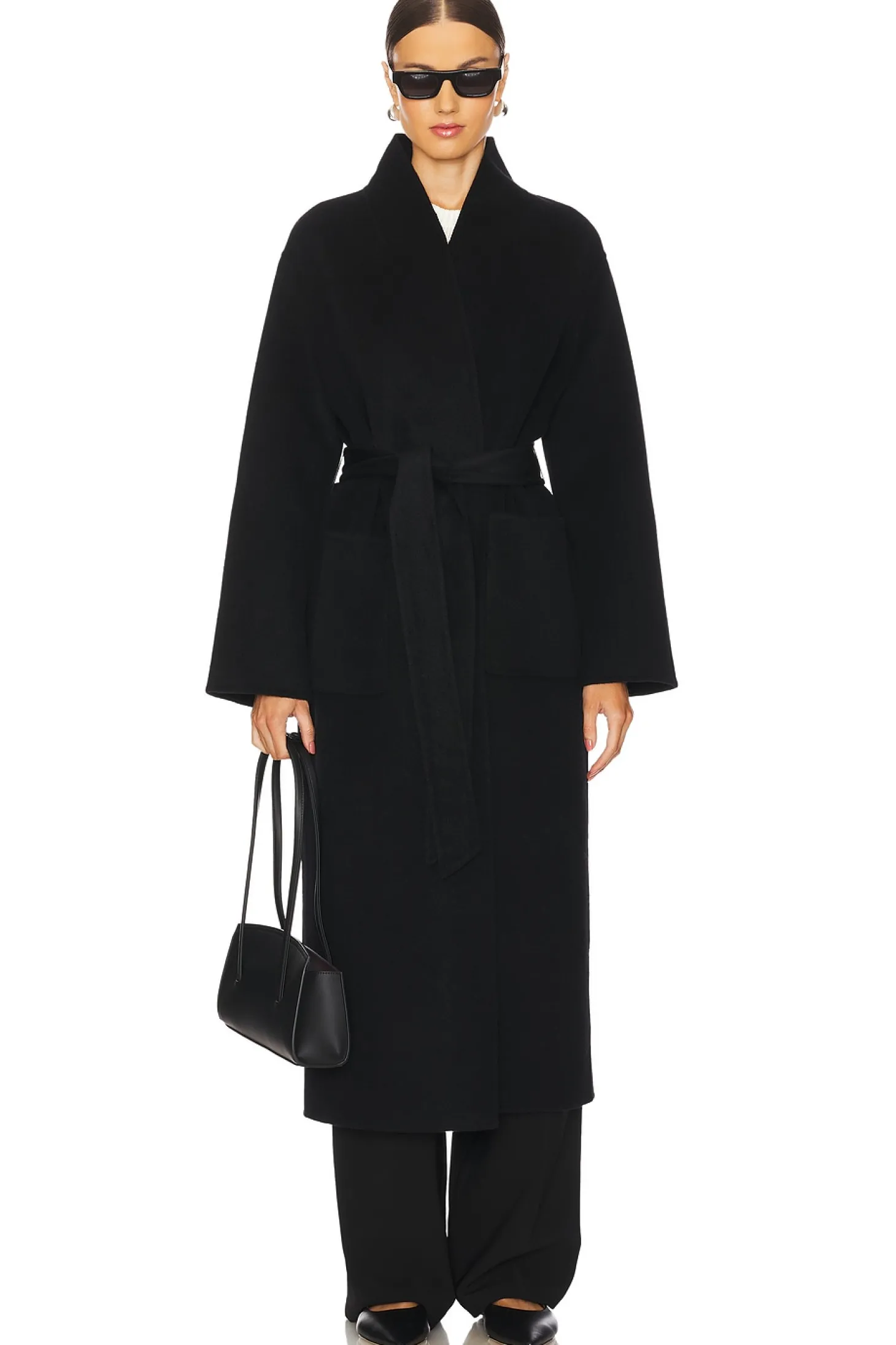 Melton textile.Imported.Dry clean recommended.Wrap tie closure.Front slip pockets.Midweight fabric