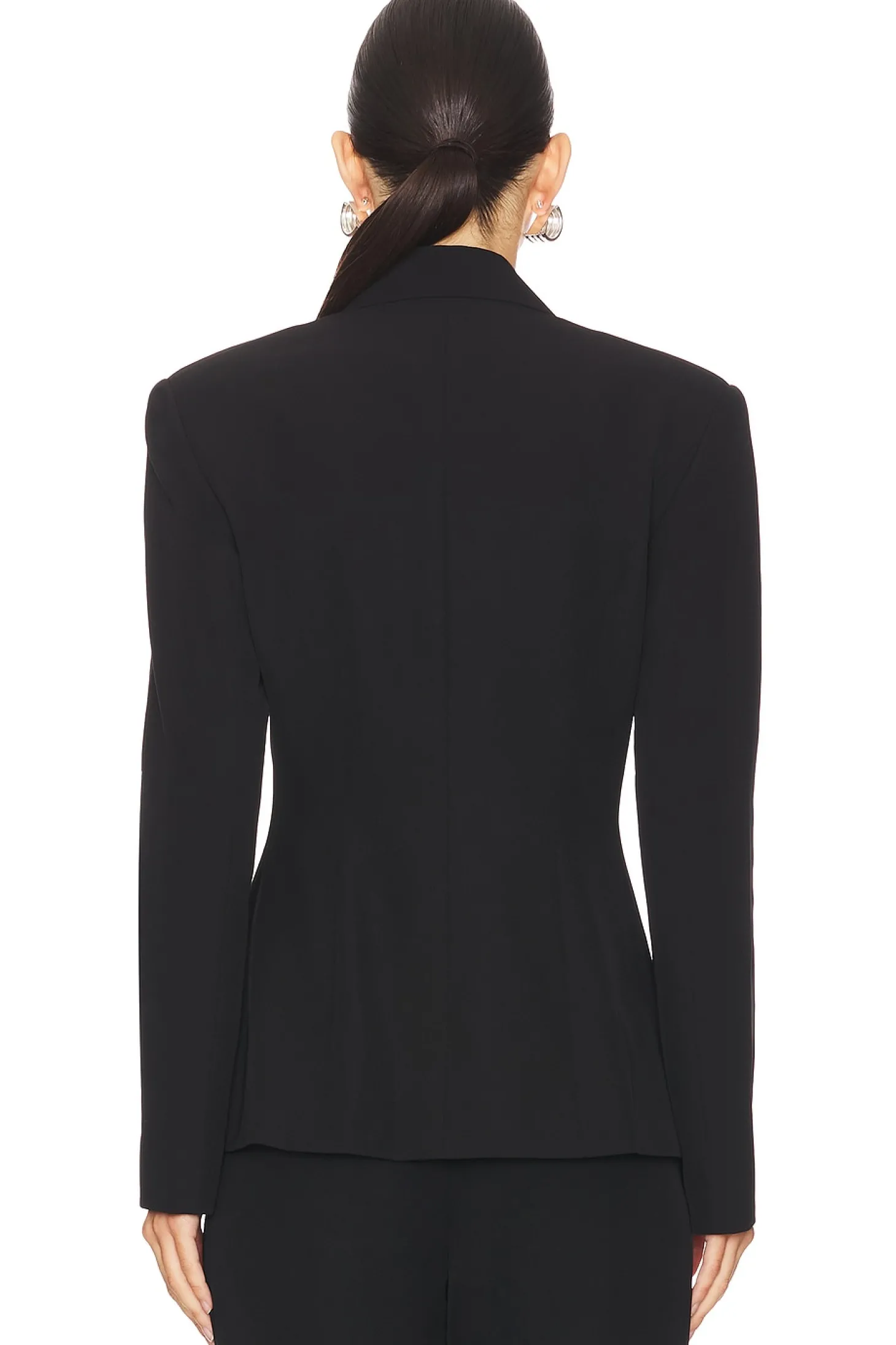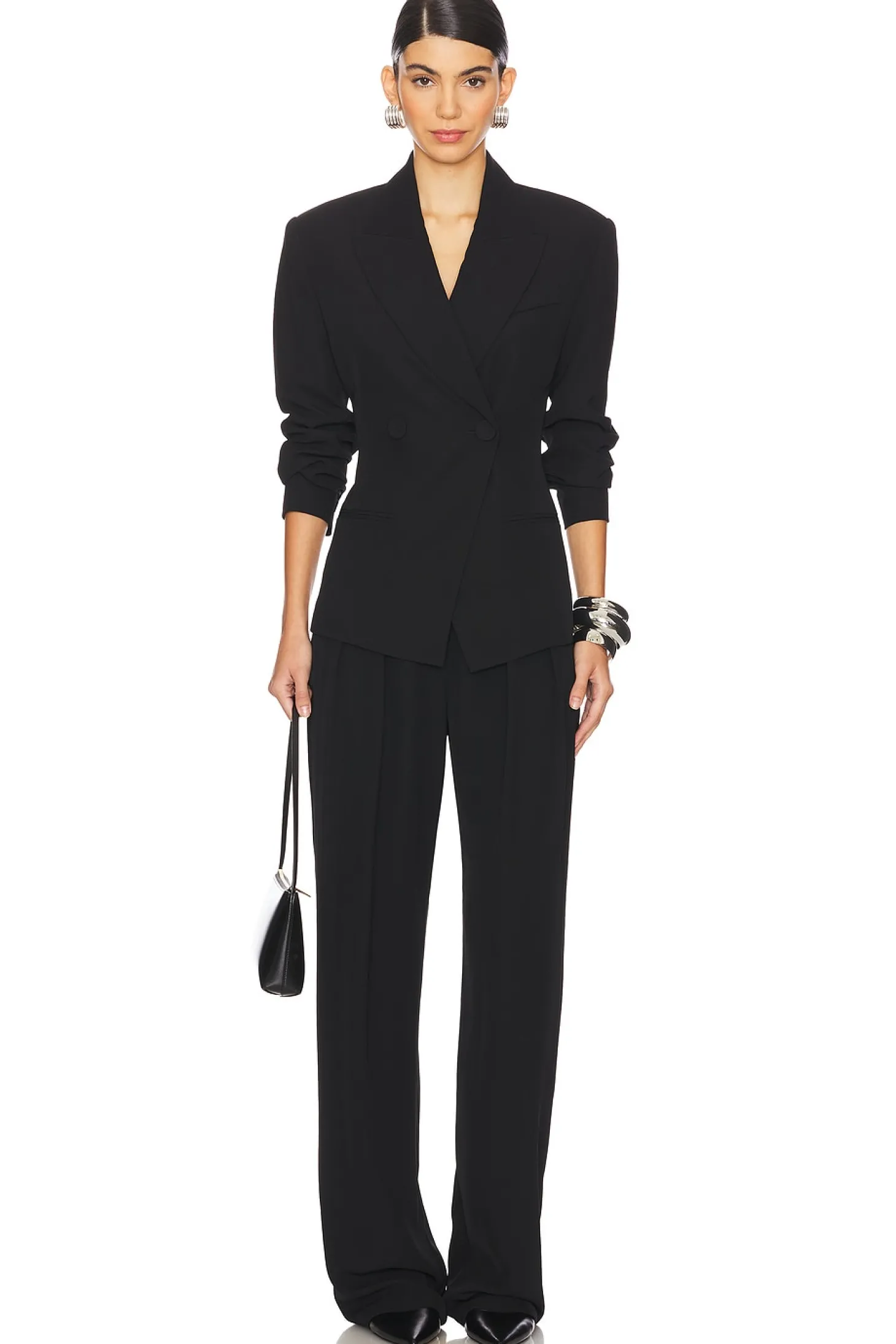 92% polyester 8% elastane Lining: 96% polyester 4% elastane.Made in China.Dry clean only.Front double-breasted closure.Padding at shoulders.3-pocket design.Crepe fabric