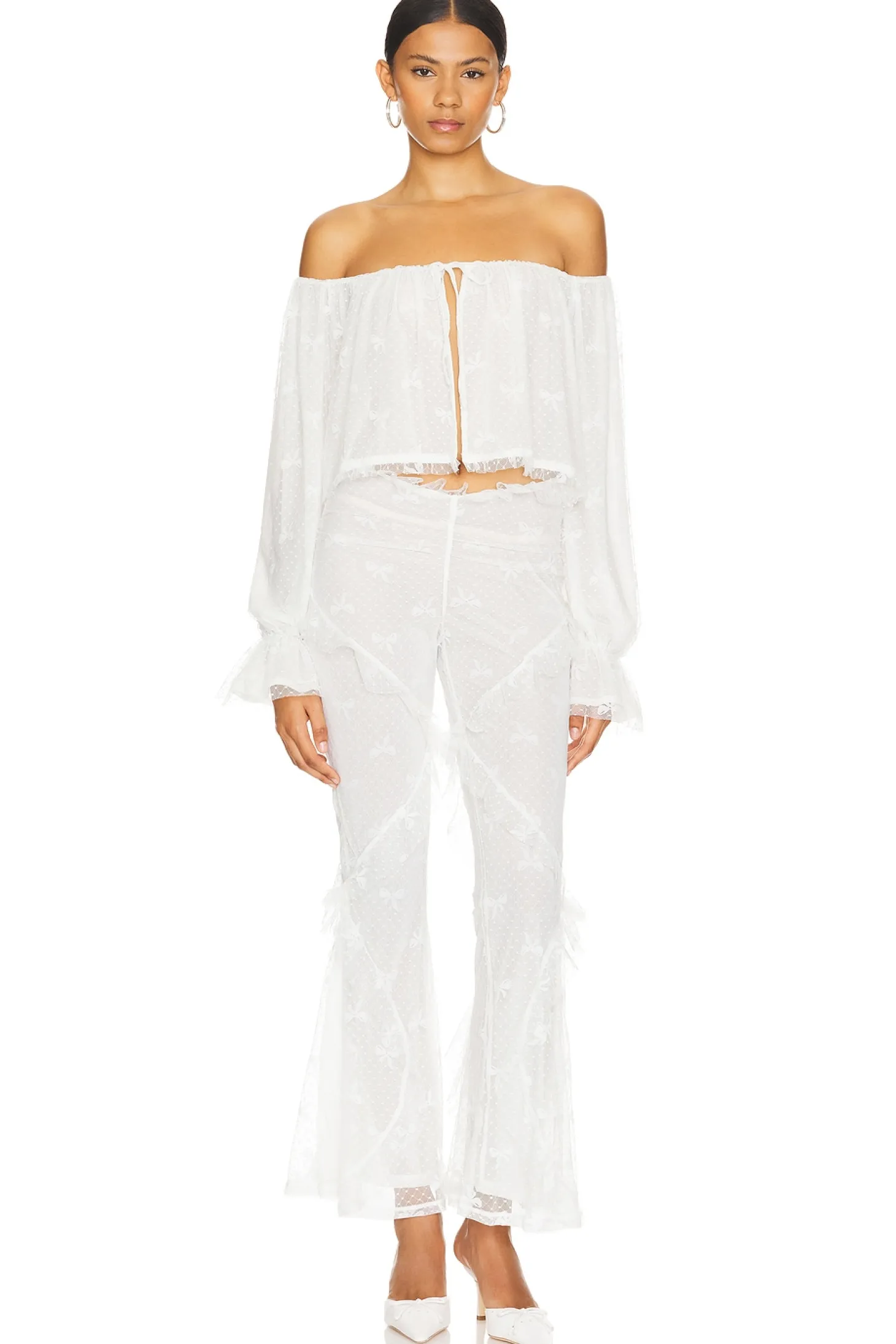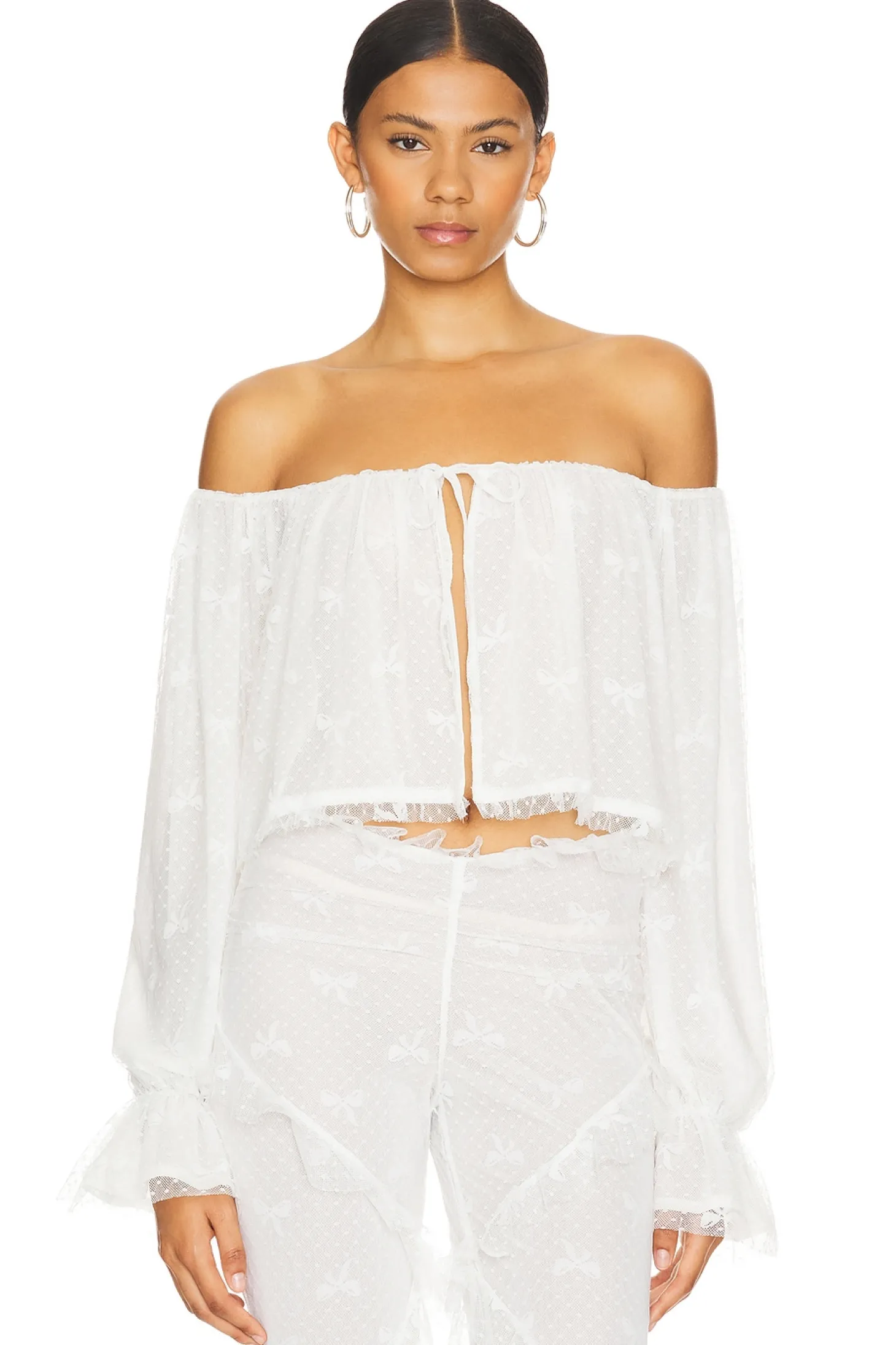 Self: 92% nylon 8% elastane Lining: 94% polyester 6% elastane.Made in China.Hand wash.Open front with single tie closure.Elastic cuffs.Swiss dot fabric with ruffle trim