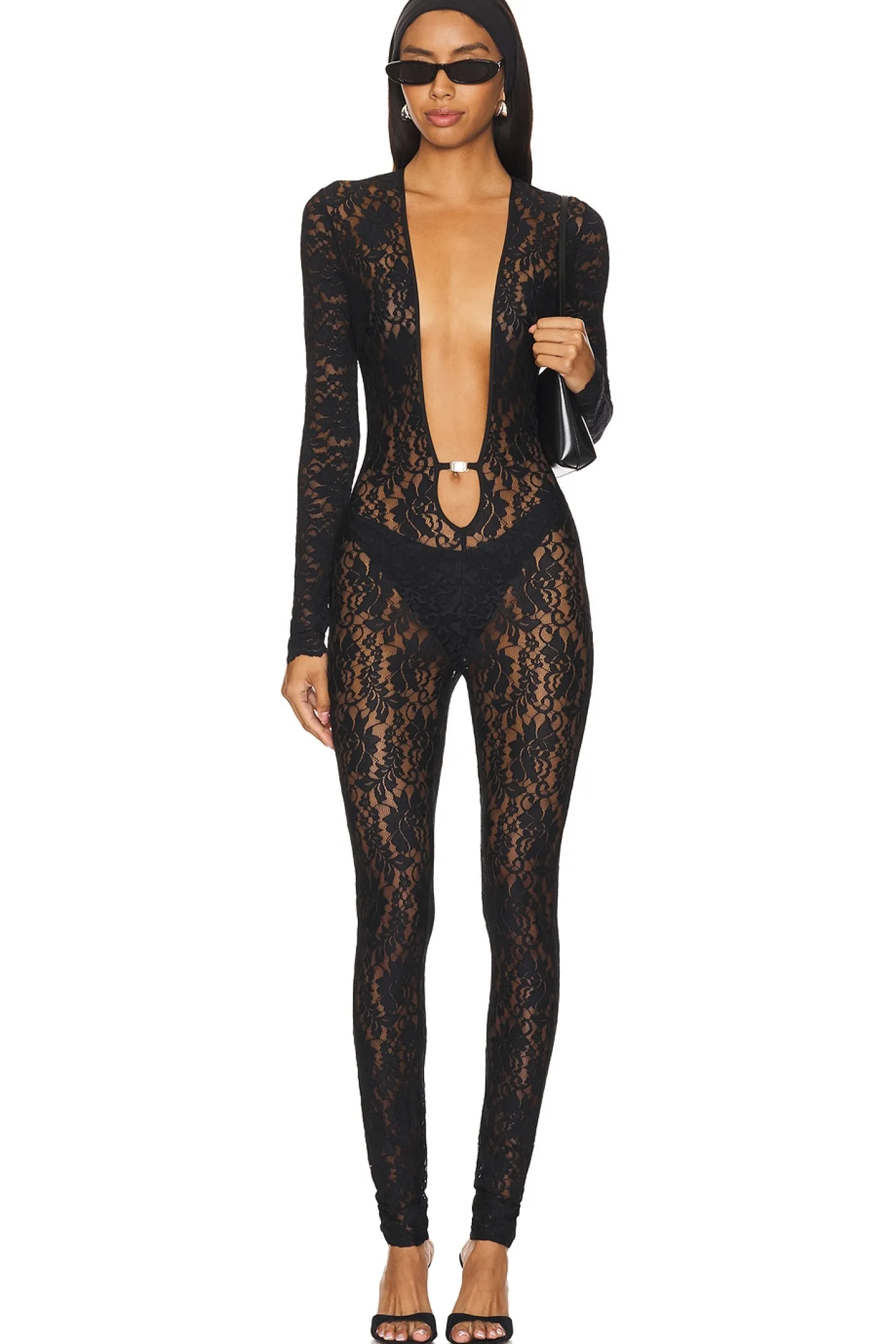 90% nylon 10% elastane.Made in China.Hand wash.Pull-on styling.Deep v-neck with single clasp closure.Floral lace fabric.Garment is intentionally sheer, undergarments will show through. Please note undergarment not included