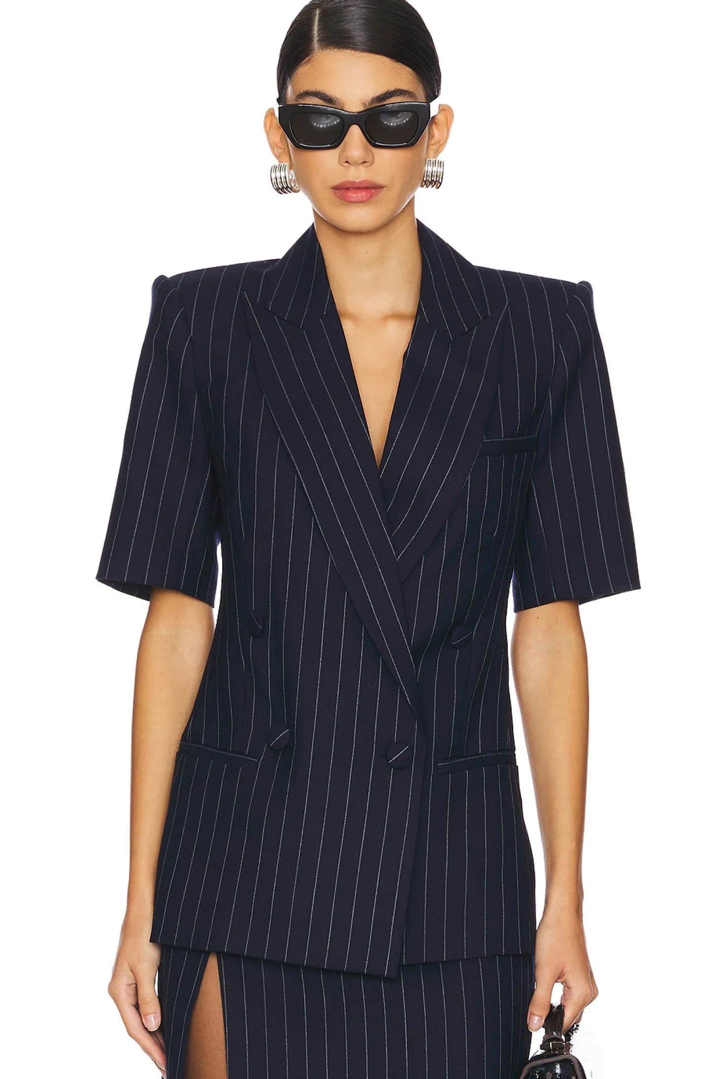 Self: 39% wool 31% polyester 27% viscose Lining: 100% polyester.Made in China.Dry clean only.Front button closure.Front faux welt pockets Padded shoulders.Heavyweight suit material Item not sold as a set