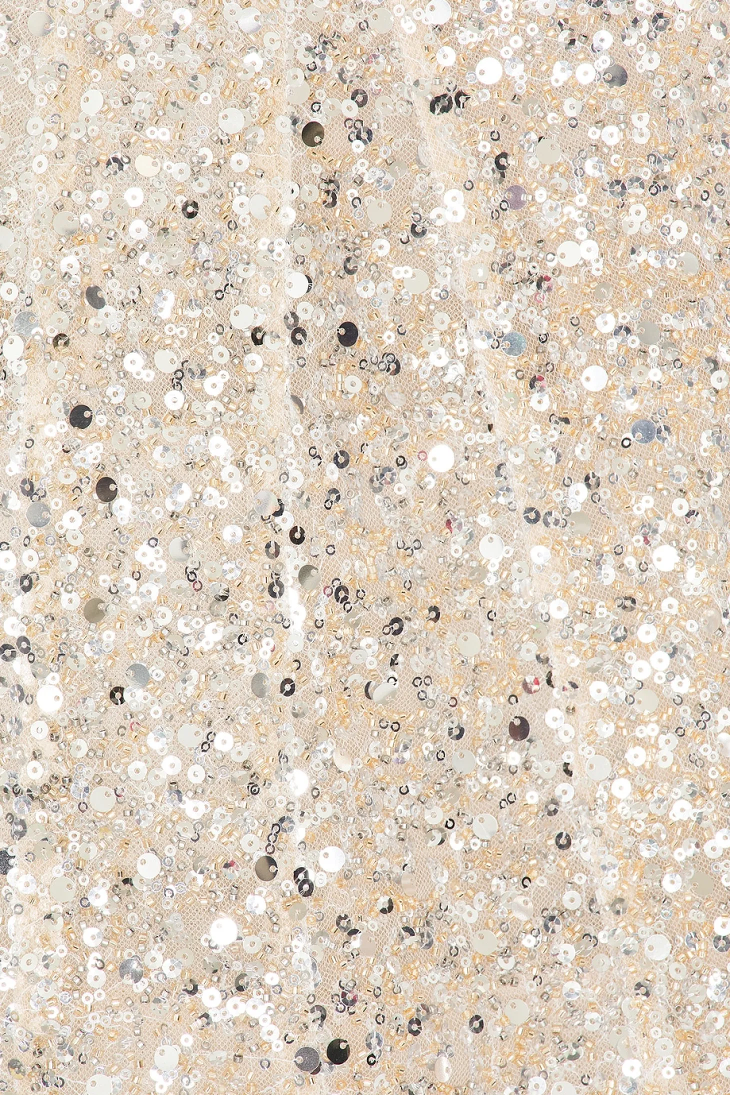 Self: 100% polyester Lining: 95% polyester 5% elastane.Made in China.Dry clean only.Fully lined.Hidden back zipper closure.Cinched waist design with structured skirt.Sequin embellished fabric