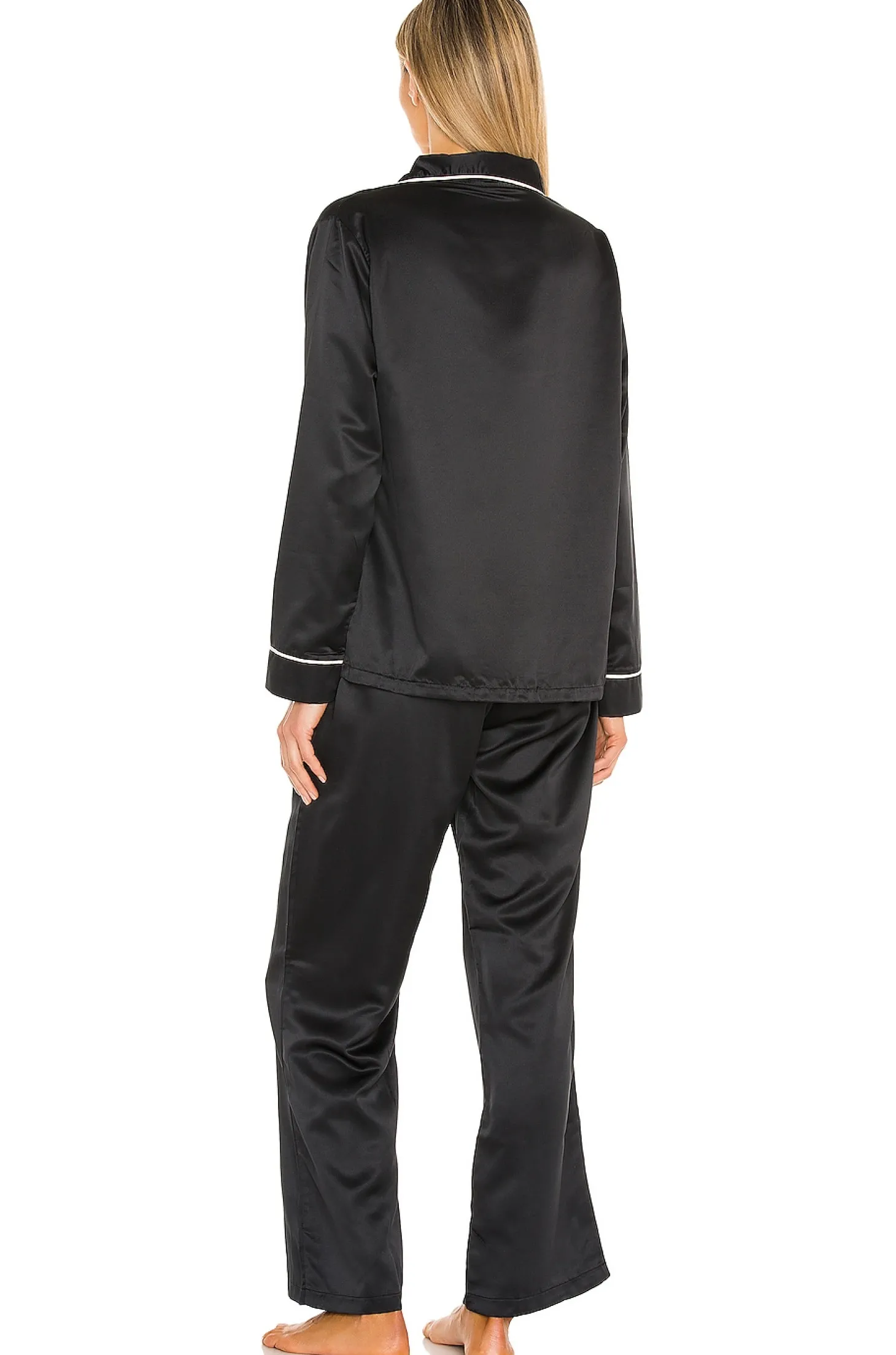 95% poly 5% polyamide.Made in China.Machine wash.Item sold as a set.Front button closure.Breast pocket.Elastic waistband with bow accent.Satin fabric with contrast piping