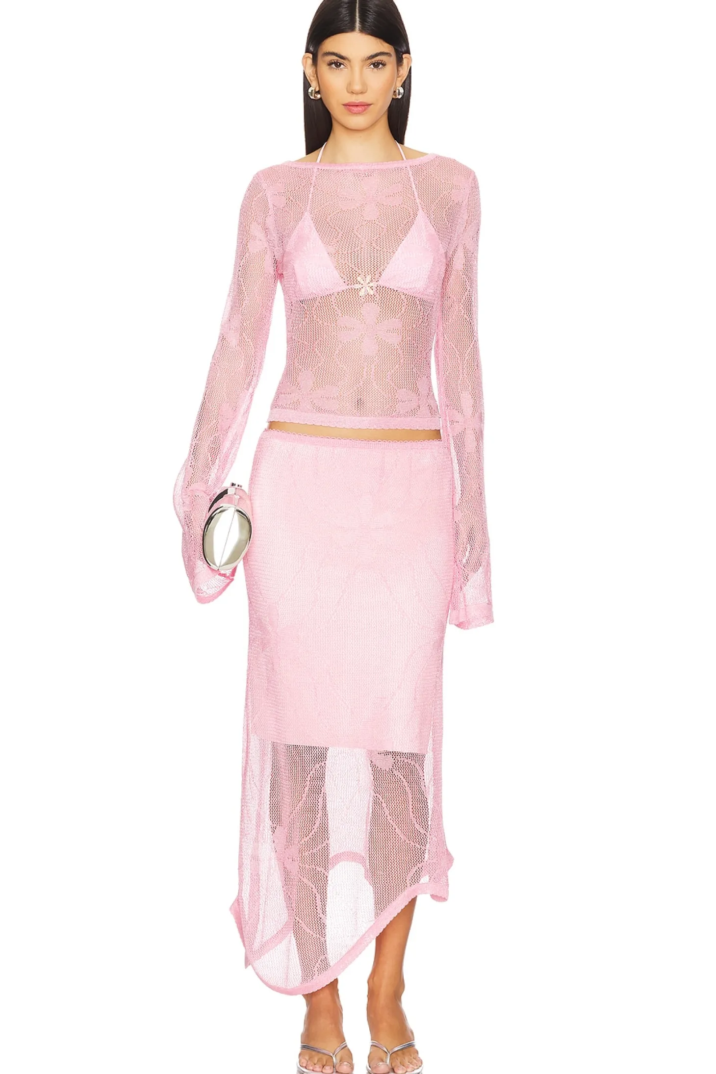 Self: 52% viscose 48% polyester Lining: 60% recycled polyamide 33% polyamide 7% elastane.Made in Portugal.Machine wash.Partially lined.Pull-on styling with elastic waistband.Open knit fabric with lace trim with asymmetric hem.Item not sold as set.Waist to shortest hem measures approx 29" and to longest hem approx 35" in length
