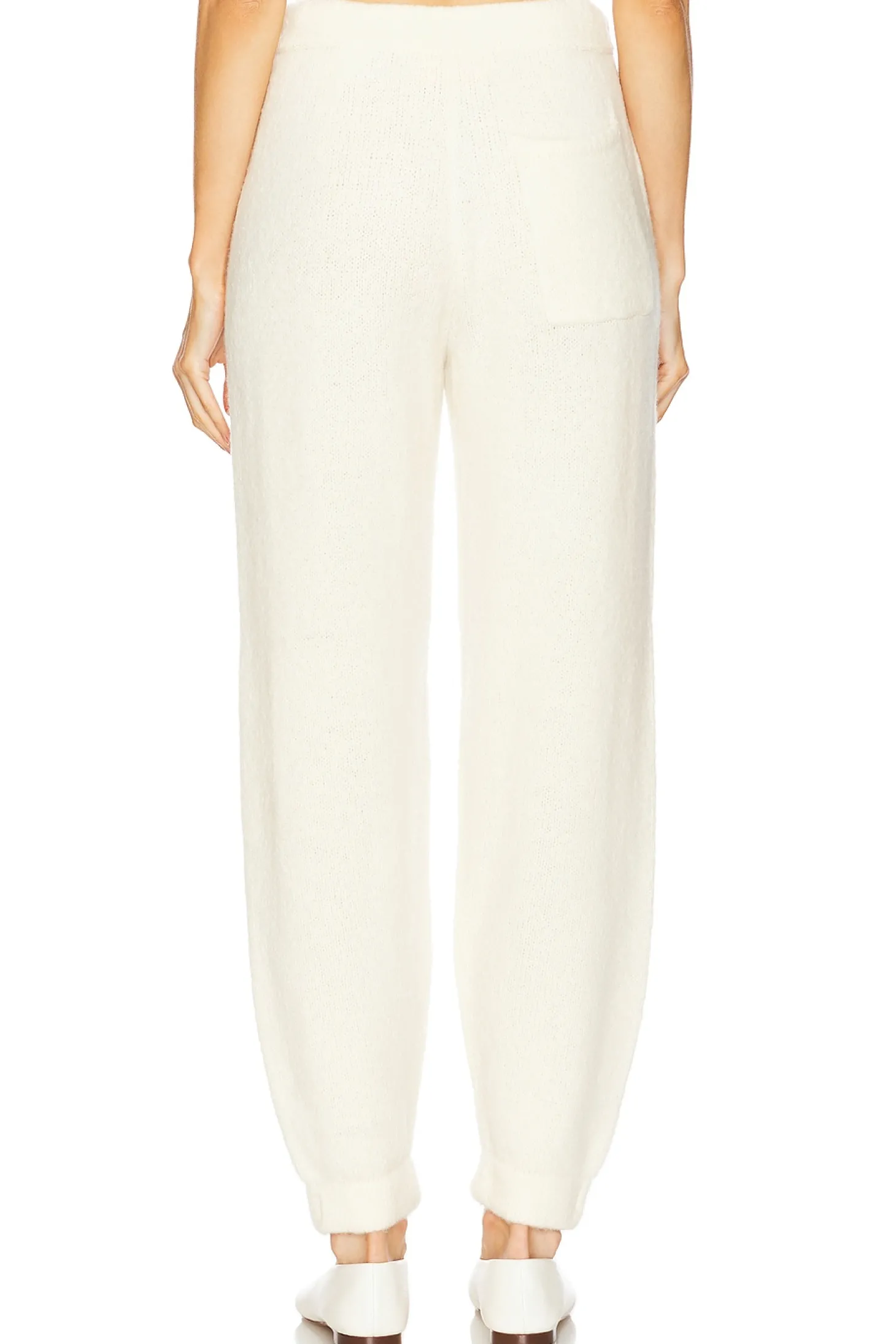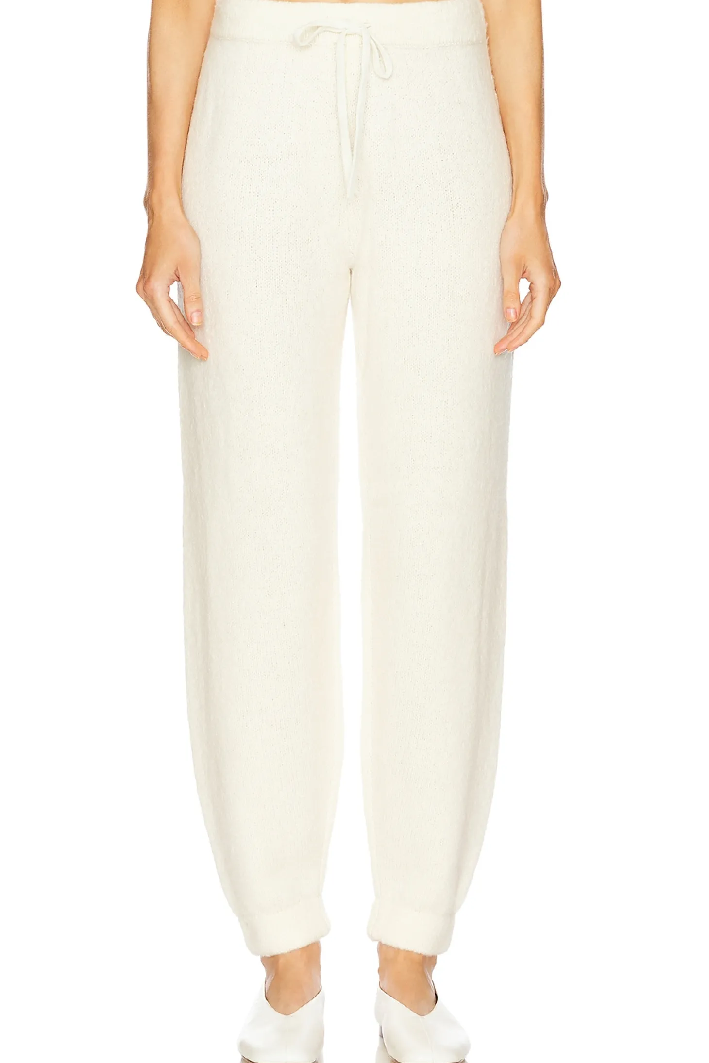 89% wool 9% polyamide 2% cashmere.Made in China.Hand wash.Pull-on styling with drawstring at waist.Singular back pouch pocket.Knit fabric.Item not sold as a set.21" at the knee narrows to 11" at the leg opening