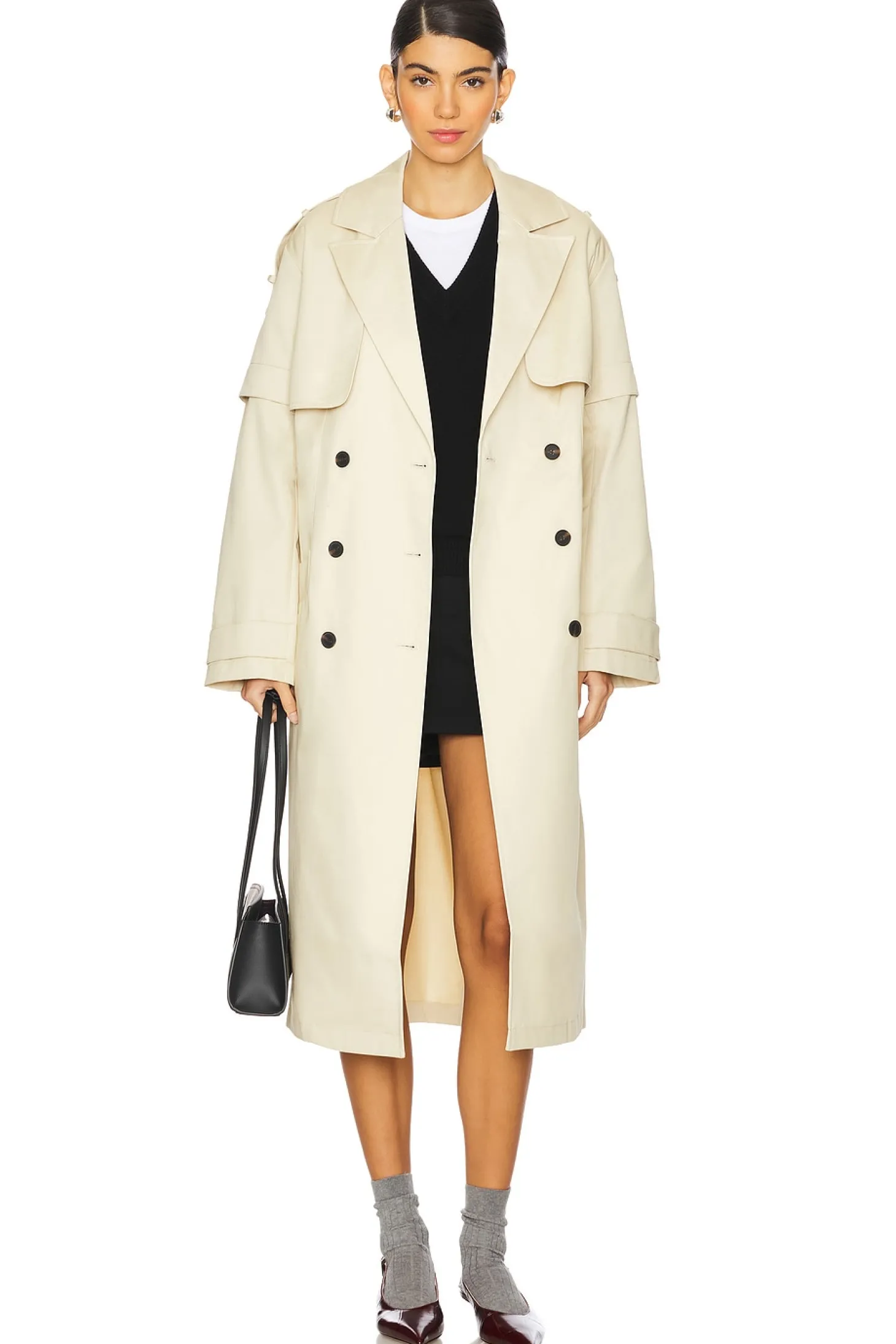 Self: 100% cotton Pocket Lining: 100% polyester.Made in China.Dry clean.Double breasted front button closure.Dual slip pockets.Detachable sleeves with snap buttons.Shoulder epaulettes.Twill fabric with detachable waist tie closure