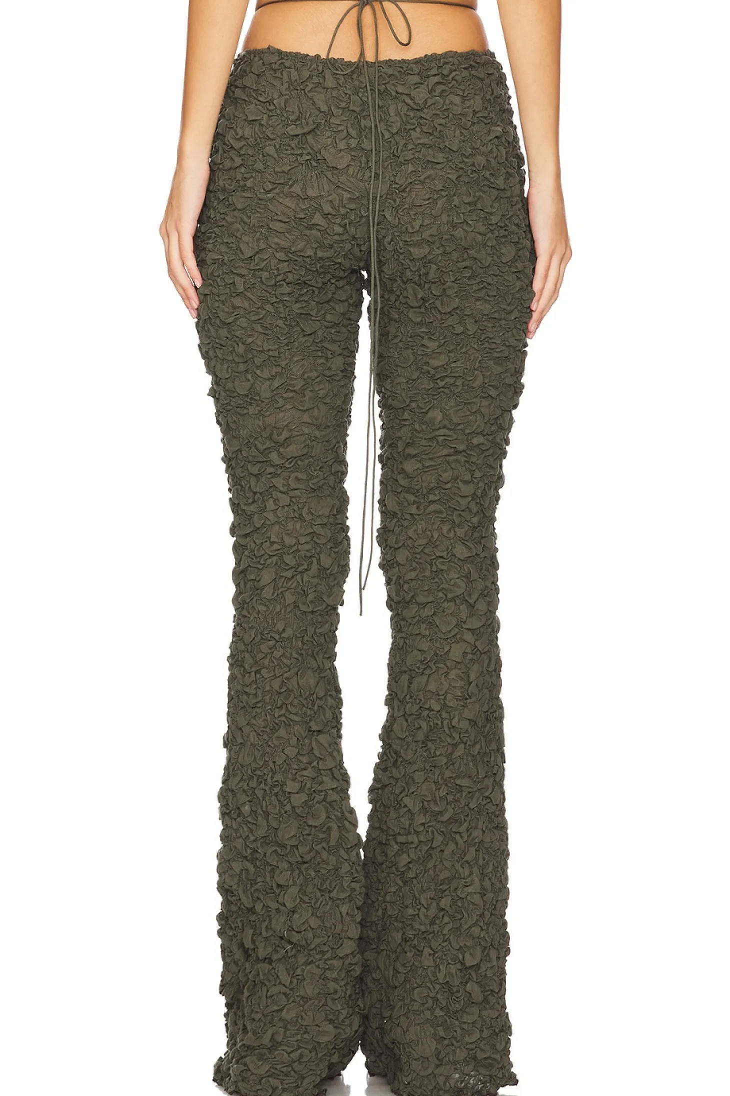 90% cotton 5% nettle 5% linen.Made in Ukraine.Machine wash.Pull-on styling with wrap around drawstring closure.Crinkled texture.Heavyweight fabric Item not sold as set.12" at the knee breaks to 20" at the leg opening