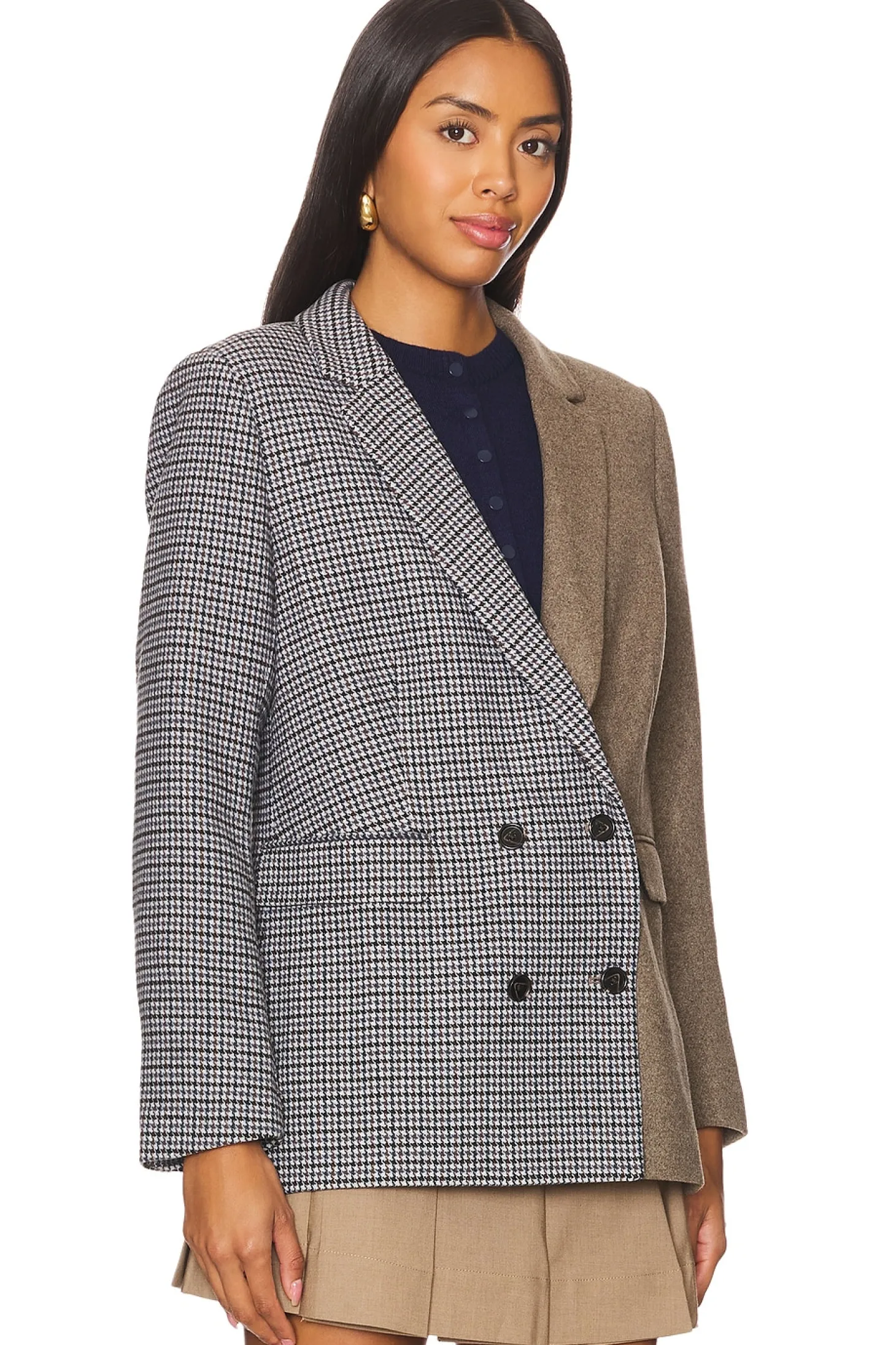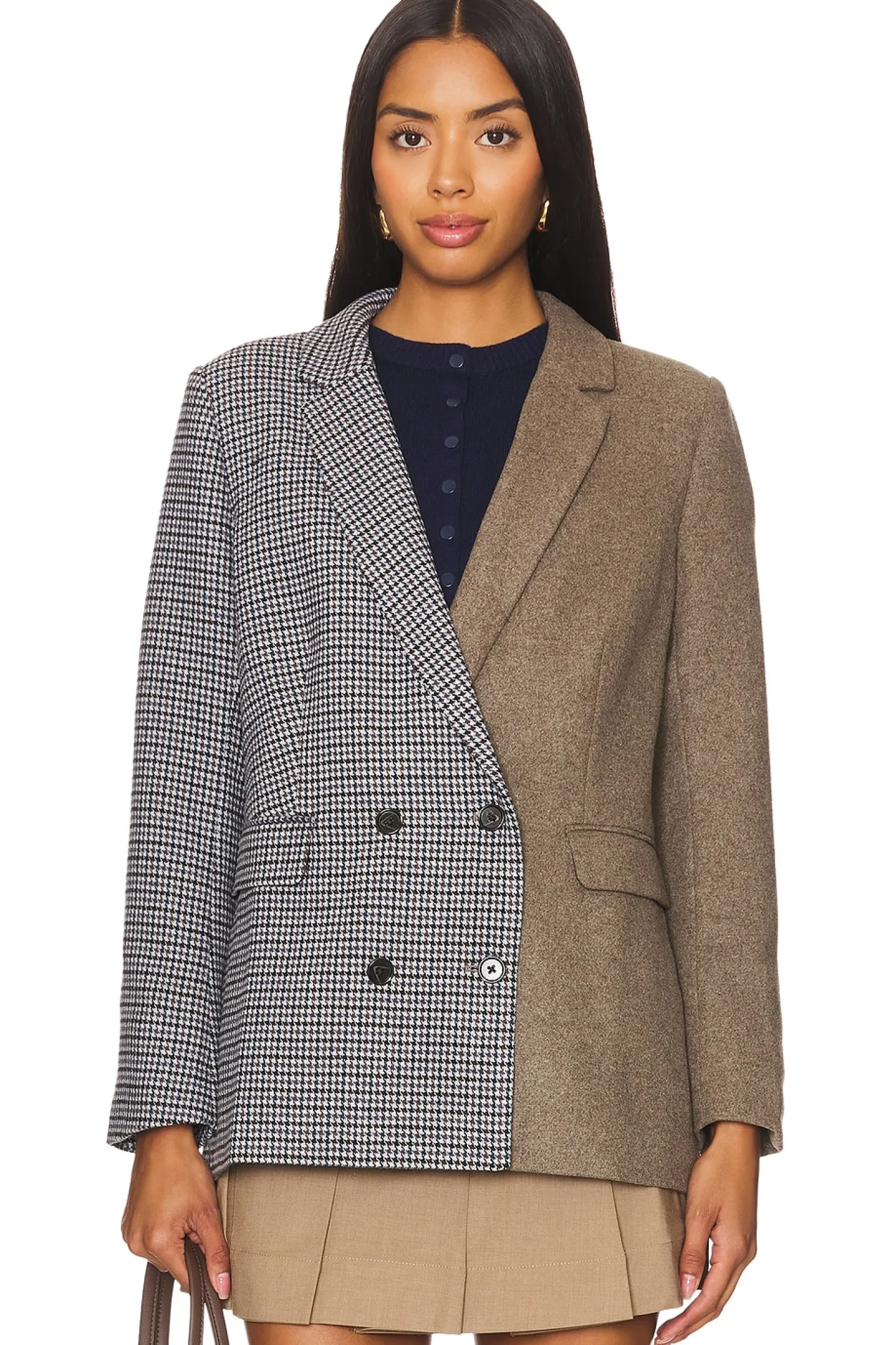 Self: 90% polyester 10% wool Lining: 100% polyester.Made in China.Dry clean only.Double breasted closure.Front flap pockets.Buttoned cuffs.Melton fabric with lightly padded shoulders