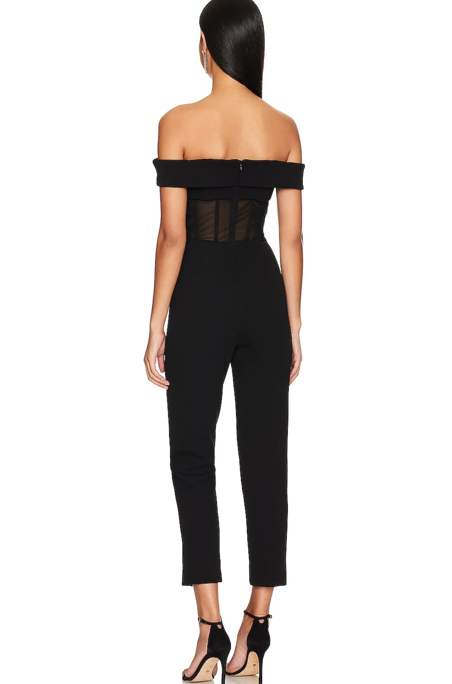 Polyester blend.Imported.Dry clean recommended.Hidden back zipper closure.Off the shoulder styling.Mesh boned bodice.Midweight ponte fabric