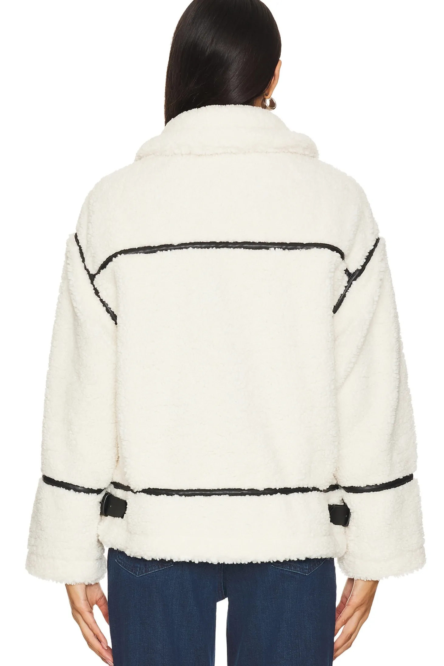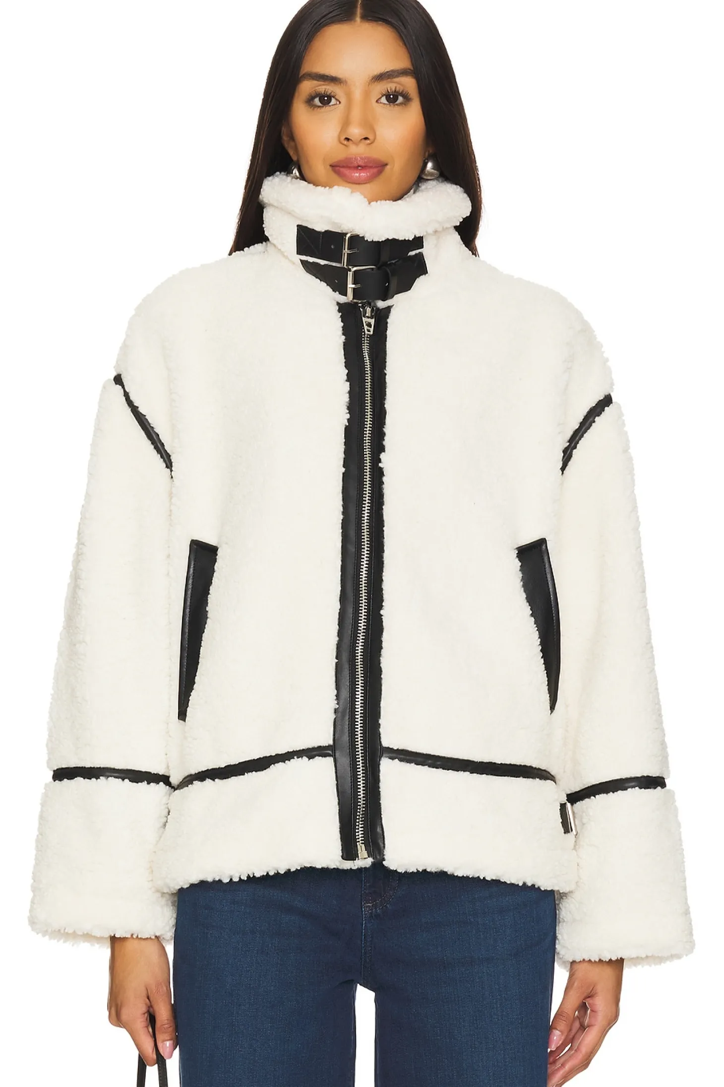 Self 1: 100% polyester Self 2: 55% polyurethane 45% polyester Lining: 97% polyester 3% spandex.Made in China.Dry clean only.Front zip closure.Front slant welt pockets Turtleneck styling with adjustable buckle closure.Heavyweight faux fur fabric