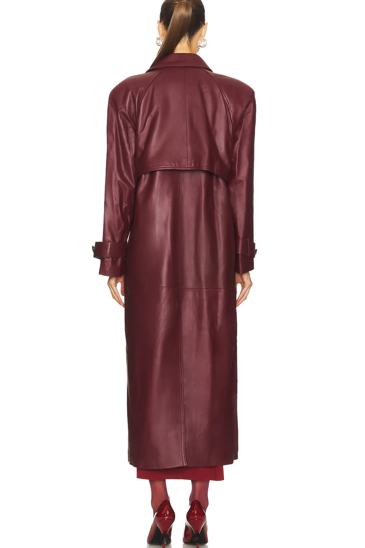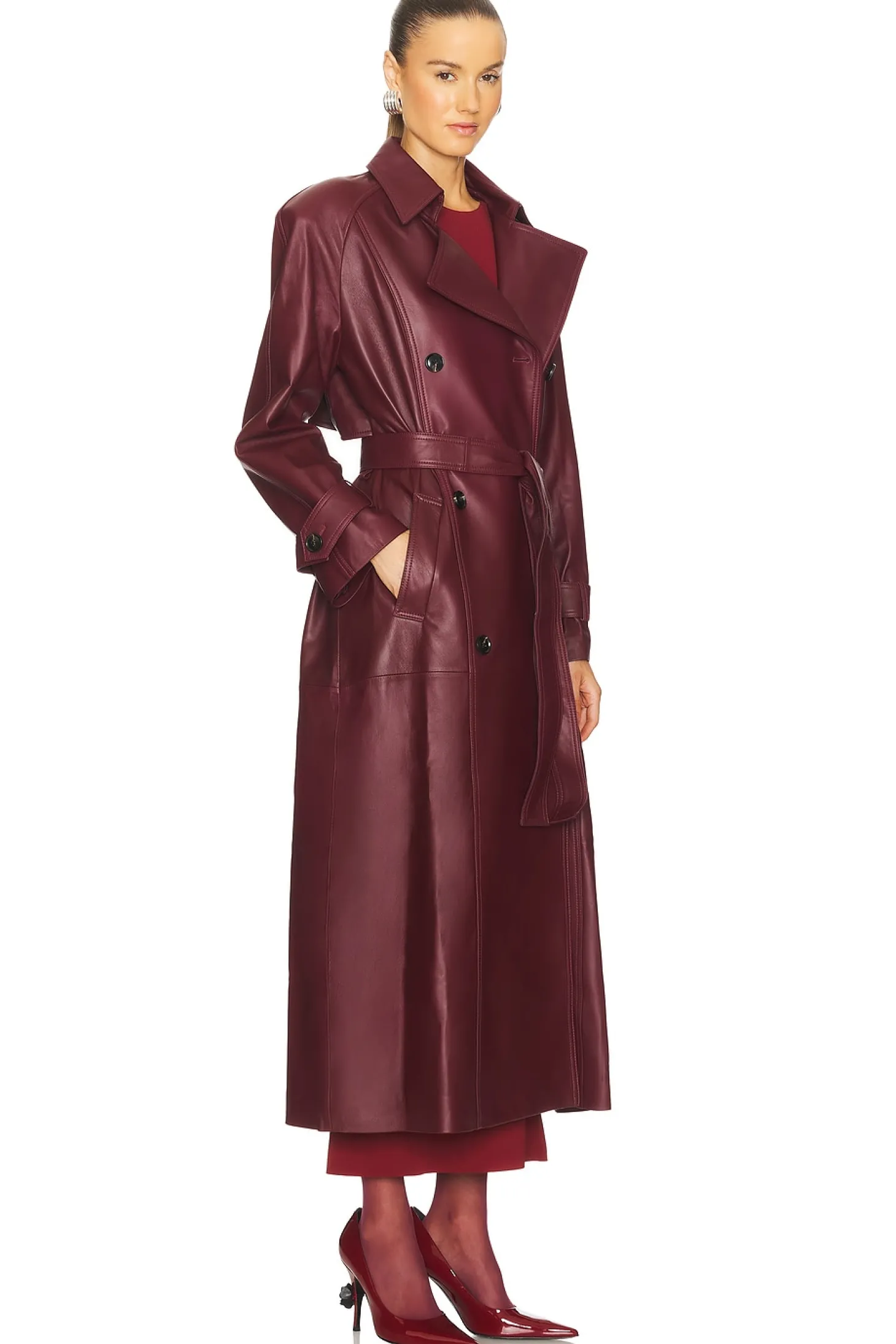 Self: 100% lambskin leather Lining: 100% polyester.Made in China.Professional leather clean recommended.Front button closure.Attached waist tie.Side slant pockets.Button cuffs.Midweight leather fabric