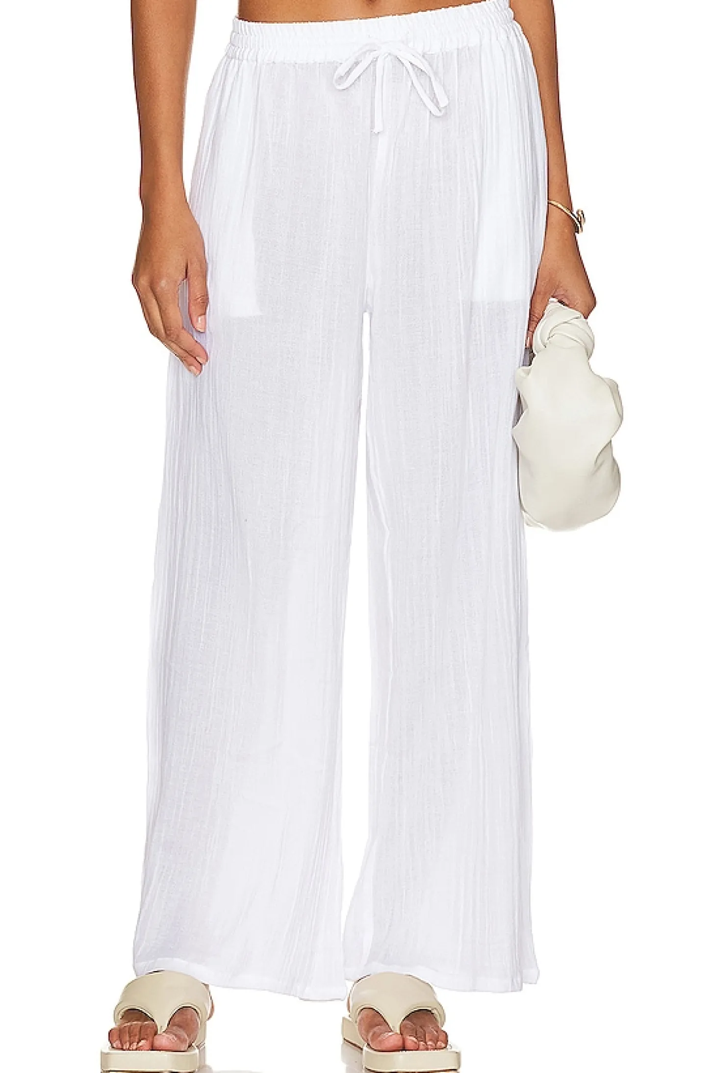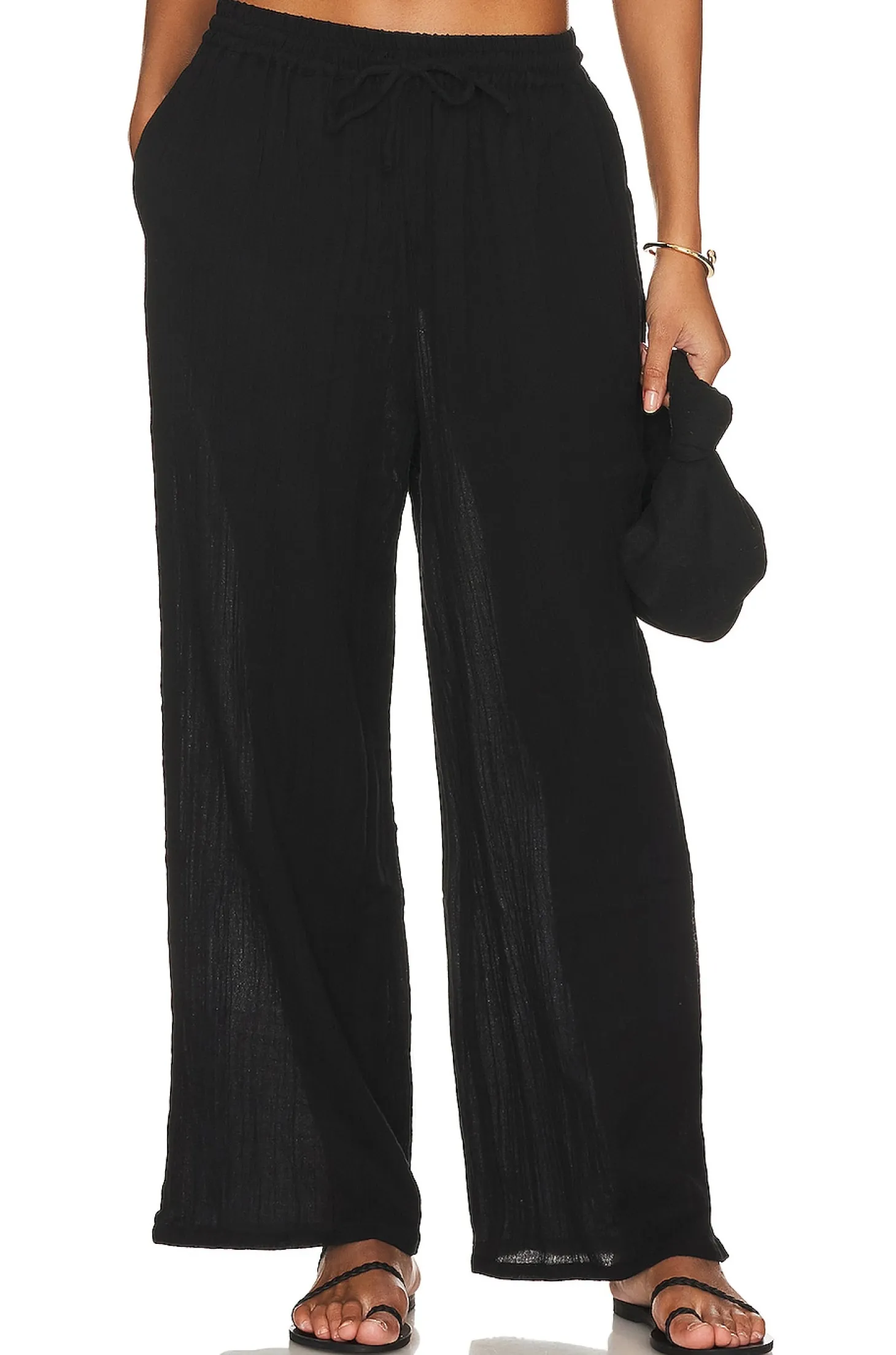 100% cotton.Made in India.Hand wash.Elastic waistband with drawstring tie closure.Side slant pockets.Item not sold as a set.25" at the knee breaks to 26" at the leg opening