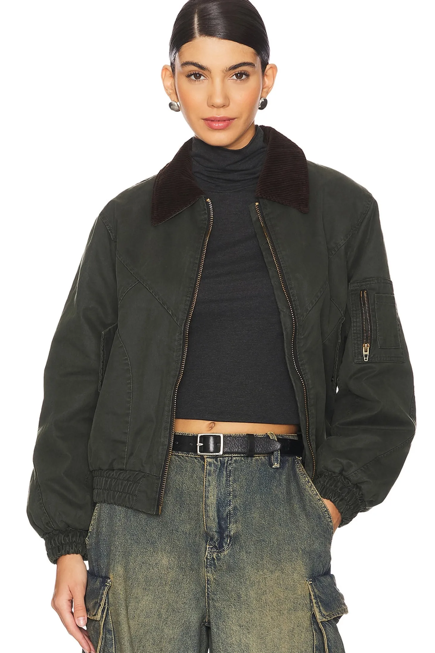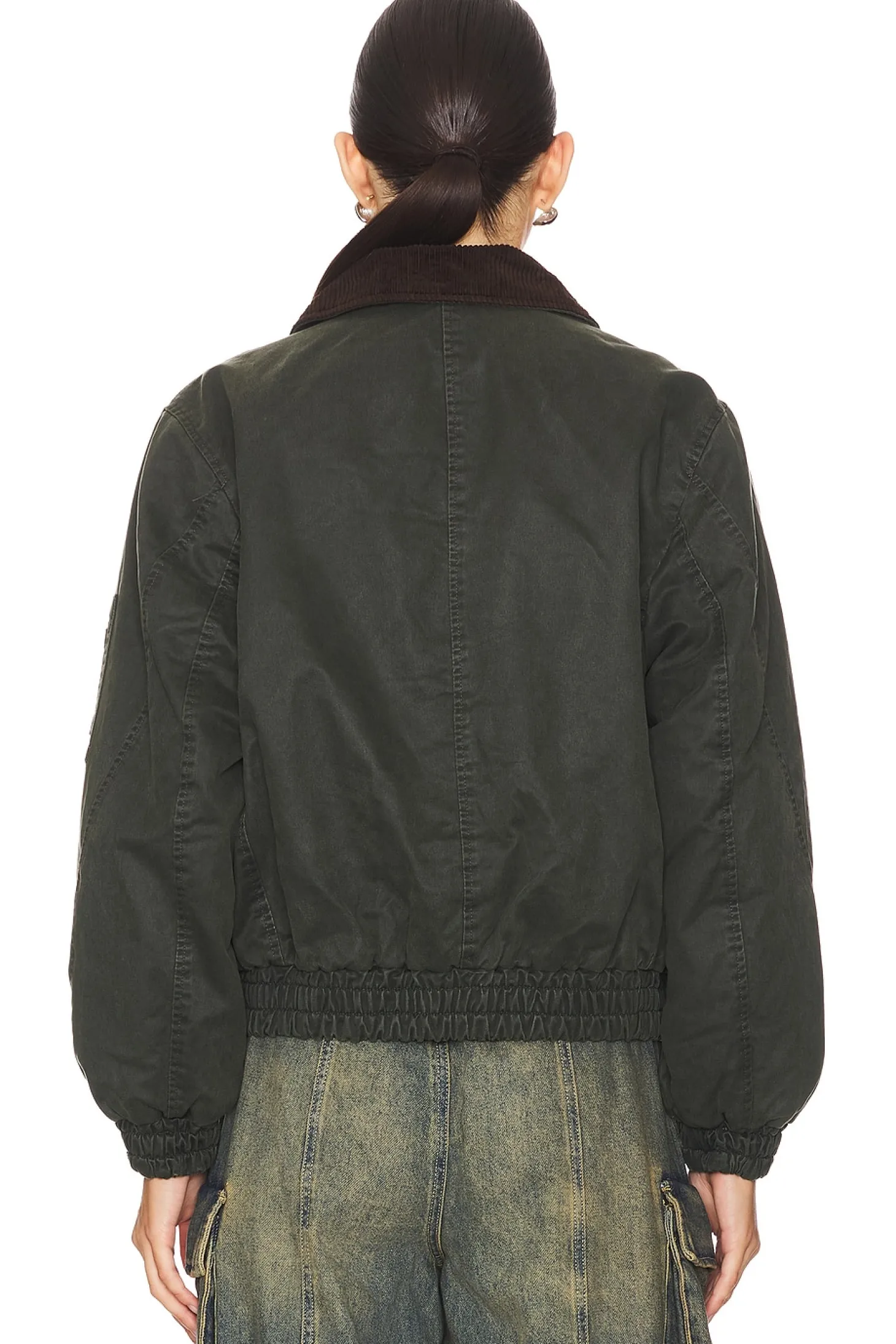 Self 1: 65% cotton 35% polyester Self 2: 100% cotton Lining: 97% polyester 3% spandex.Made in China.Machine wash.Exposed front zipper closure.Side flap pockets with button snap closure.Pocket with zipper closure at left sleeve.Elastic stretch at cuffs and waist Twill fabric with padded lining and corduroy fabric at collar