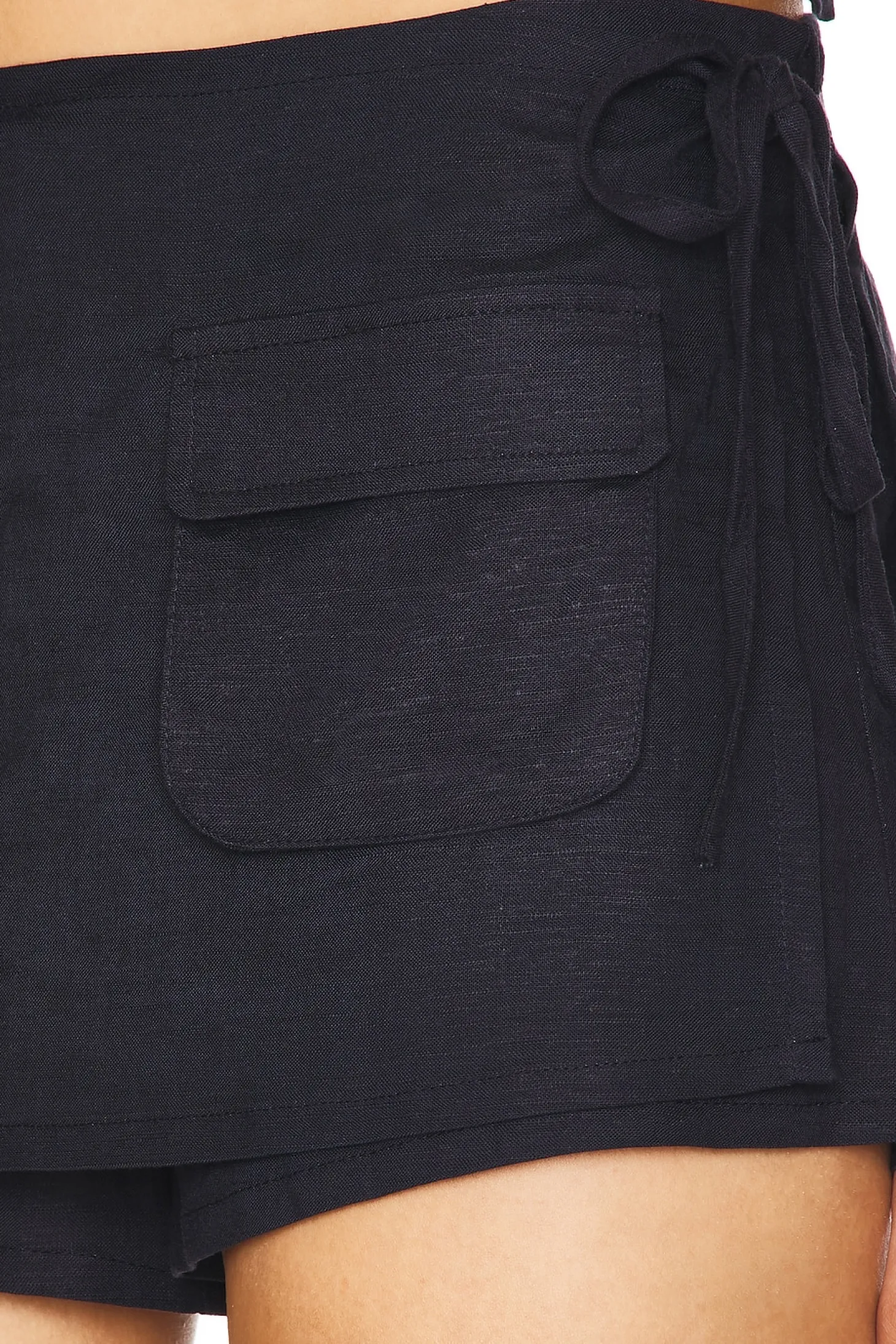 55% linen 45% viscose.Made in China.Hand wash.Concealed front zipper closure.Skirt overlay with side tie closures.Linen fabric with front flap pockets.Item not sold as set.Shorts measure approx 10" in length