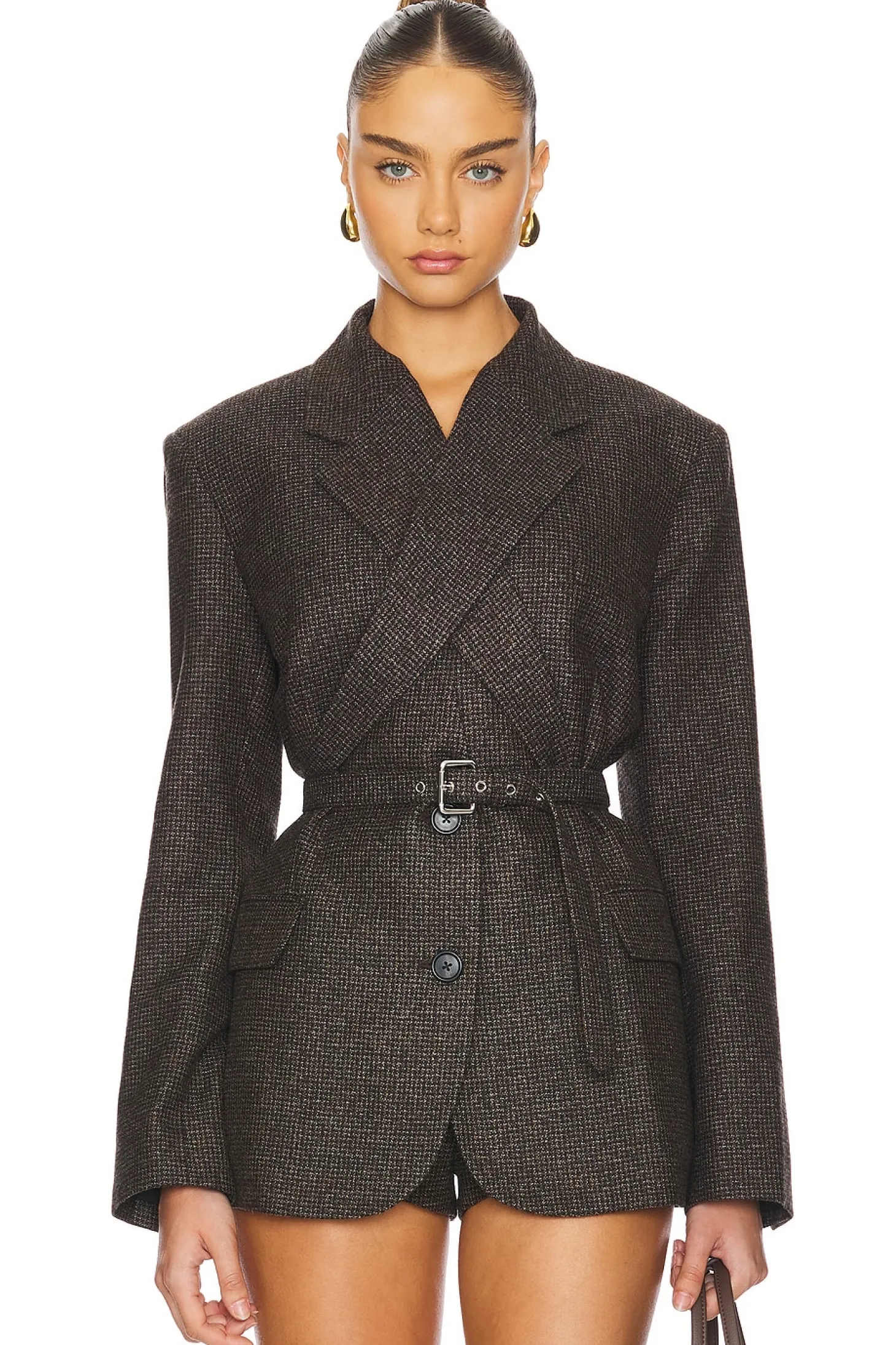 Twill textile.Imported.Dry clean recommended.Single breasted closure.Front flap pockets and single chest pocket.Buttoned cuffs.Wrap around collar with buckle closure.Twill fabric with padded shoulders
