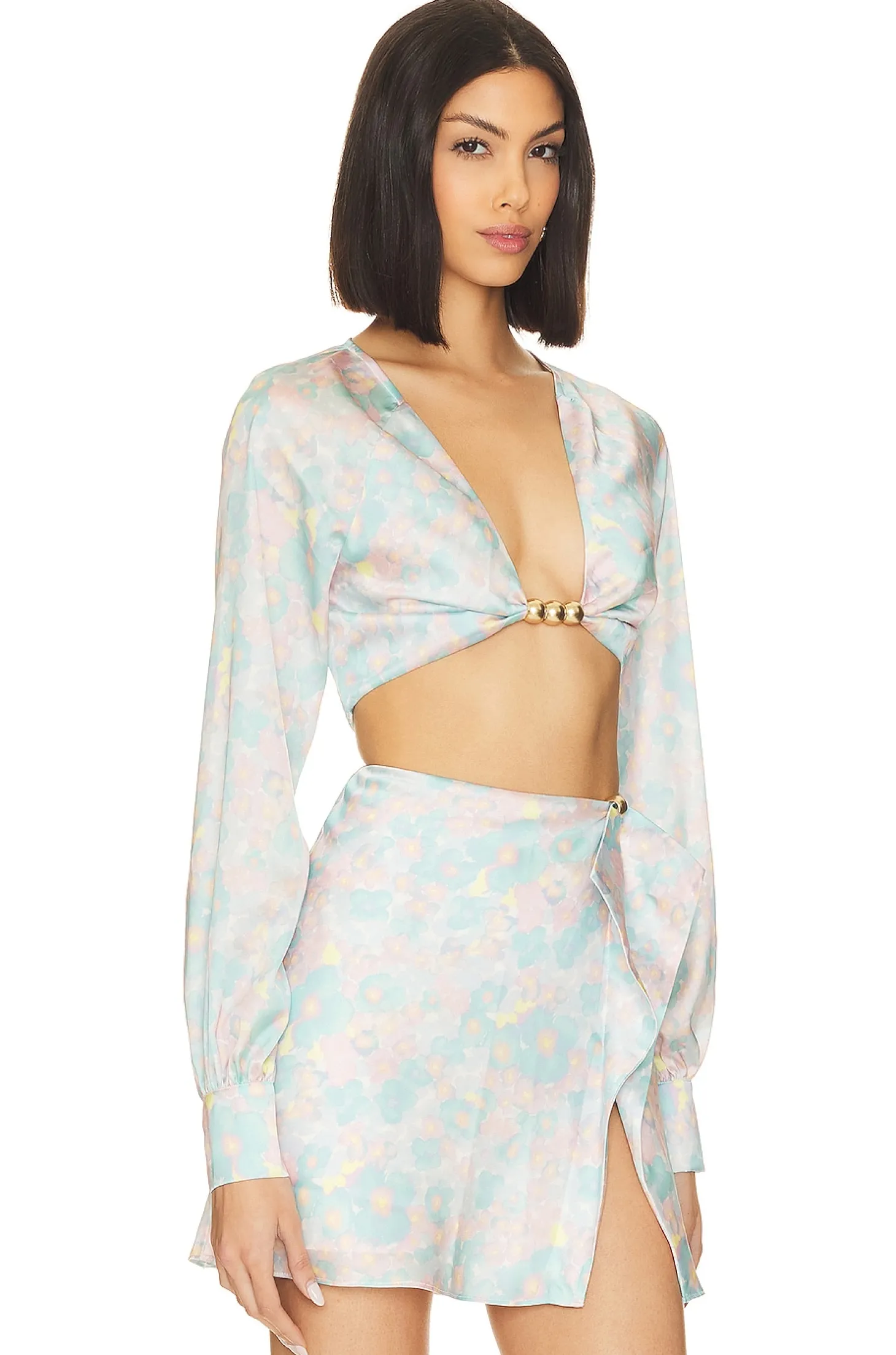 Self: 100% polyester Lining: 97% polyester 3% spandex.Made in China.Hand wash.Back button closure.Low V neckline with gold accent front.Smocked back with cut-out.Button cuff.Item not sold as a set