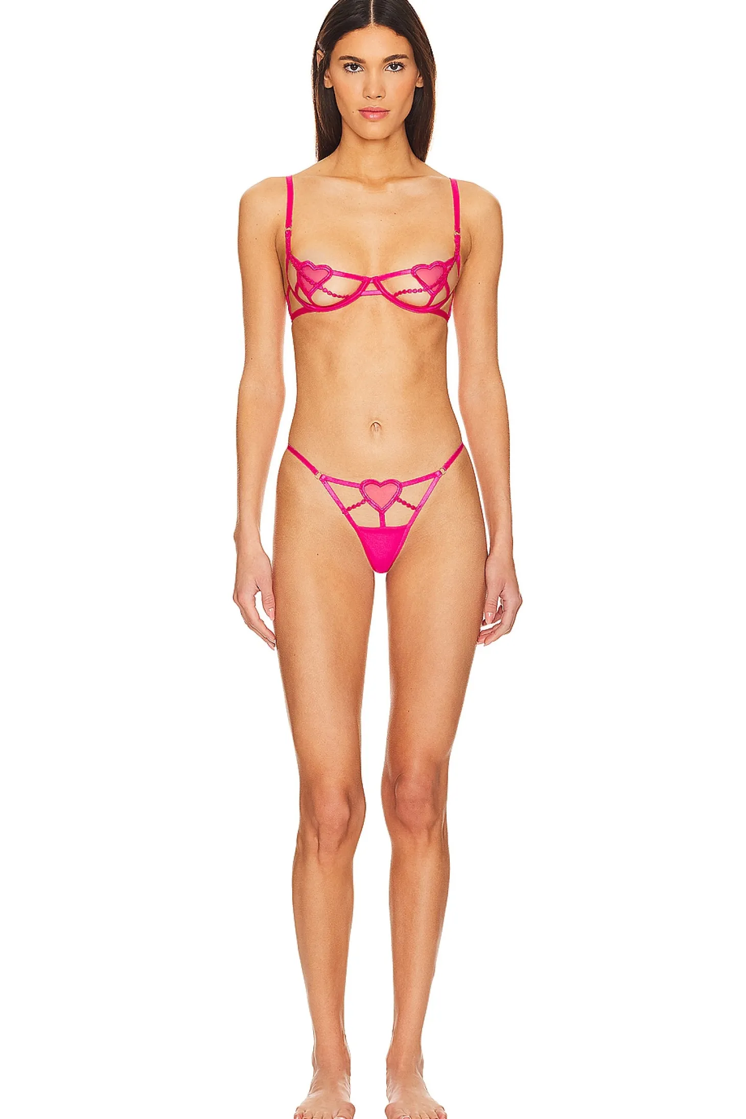 Self 1: 95% polyester 5% elastane Self 2: 100% polyester.Made in China.Hand wash.Unpadded underwire cups.Back hook and eye closure.Open cup design with heart details.Adjustable shoulder straps.Item not sold as a set