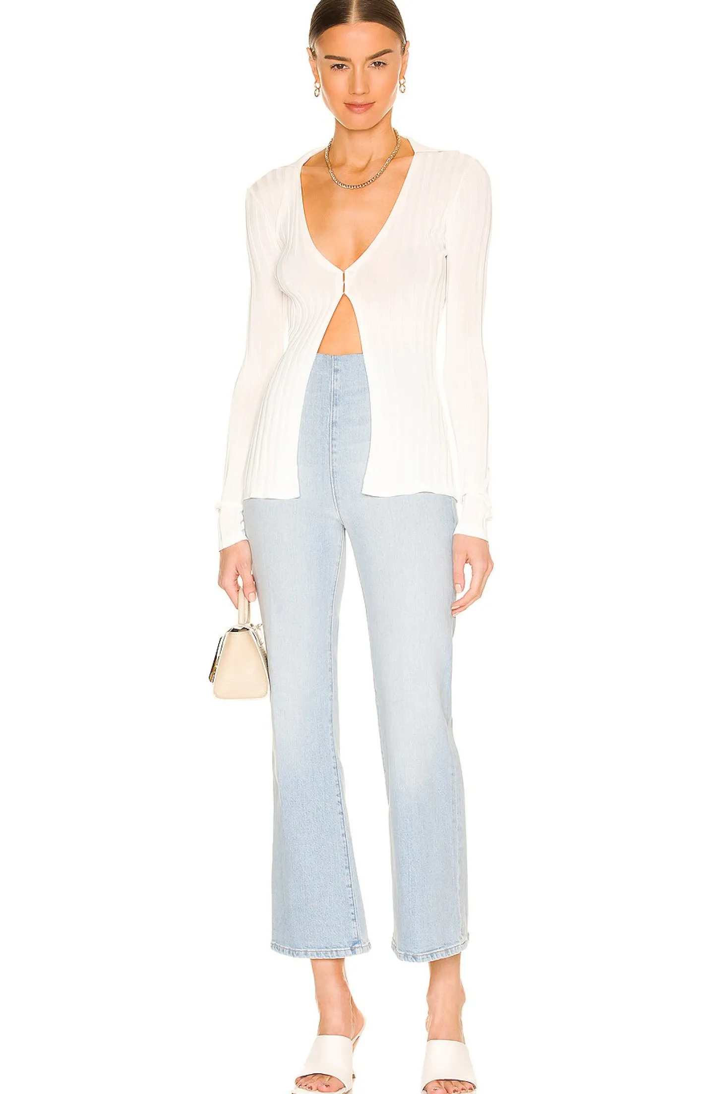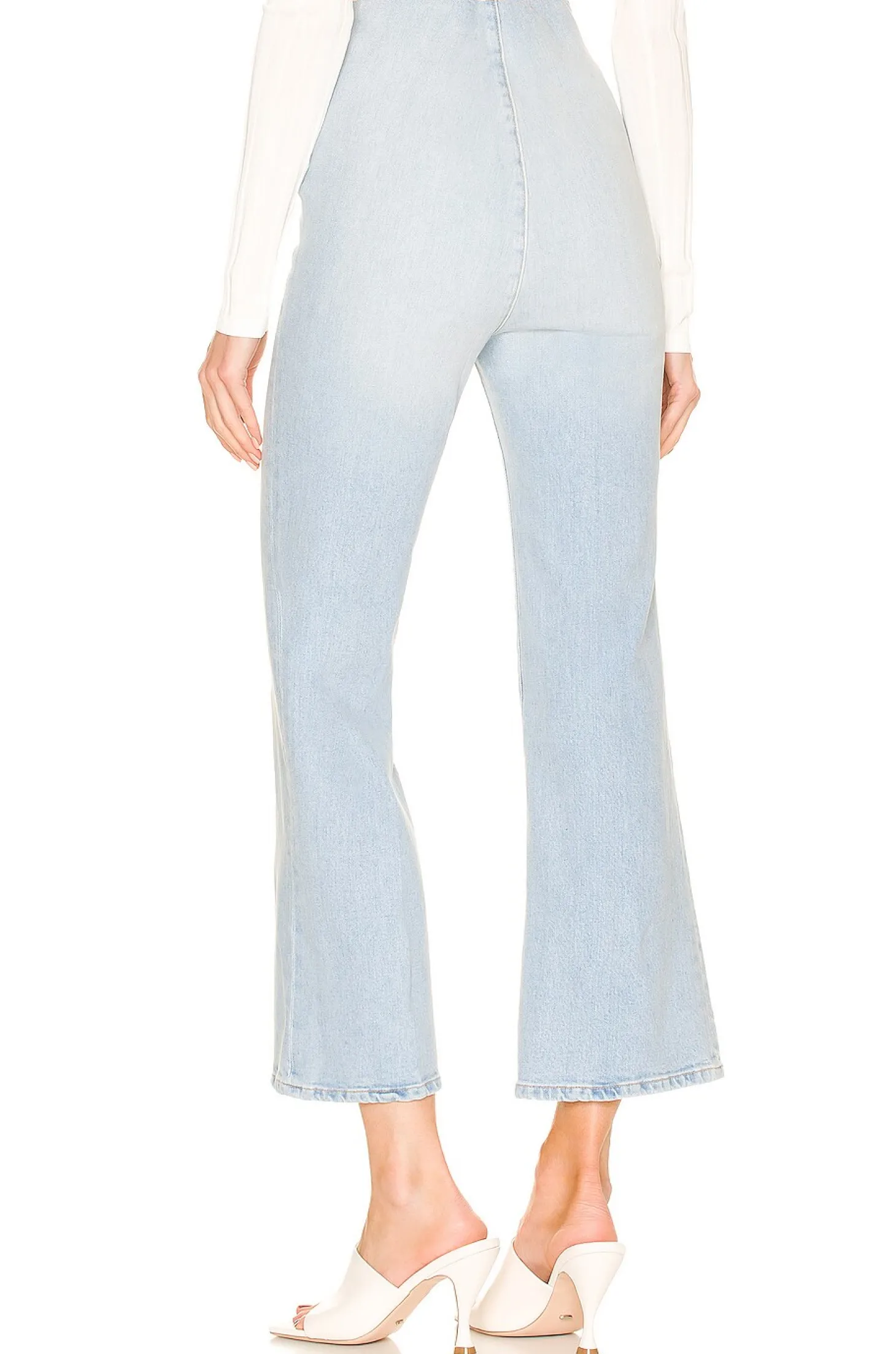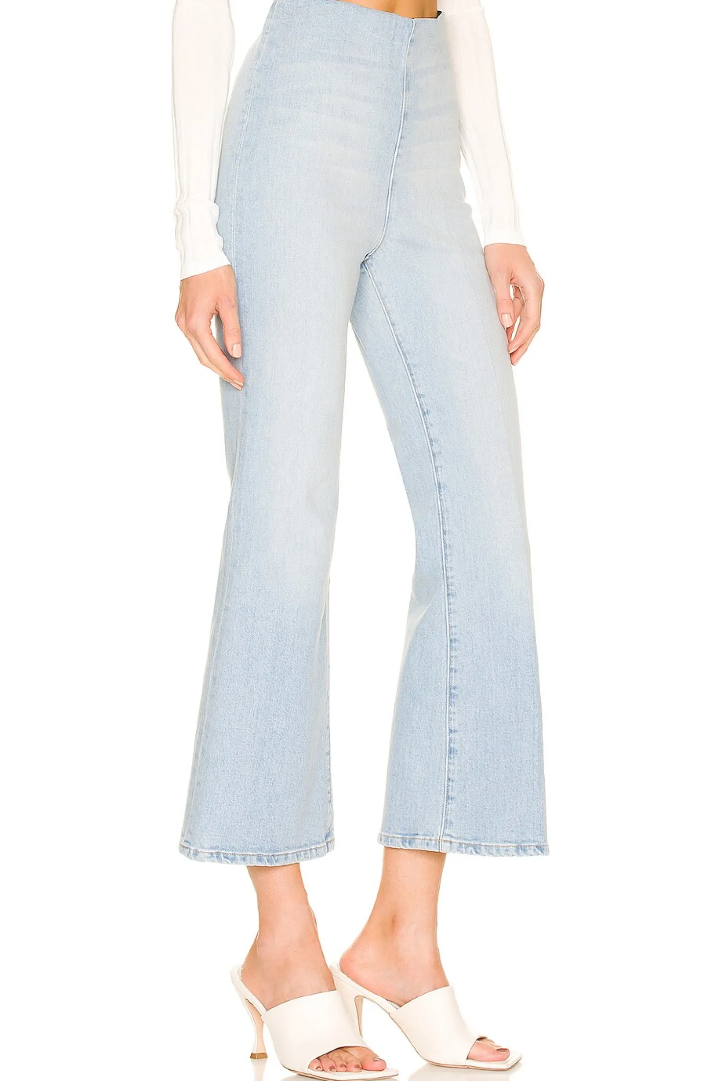 98% cotton 2% elastane.Made in USA.Machine wash.Exposed side zipper closure.Interior elastic waistband.Faded denim fabric.16.5" at the knee breaks to 18.5" at the leg opening