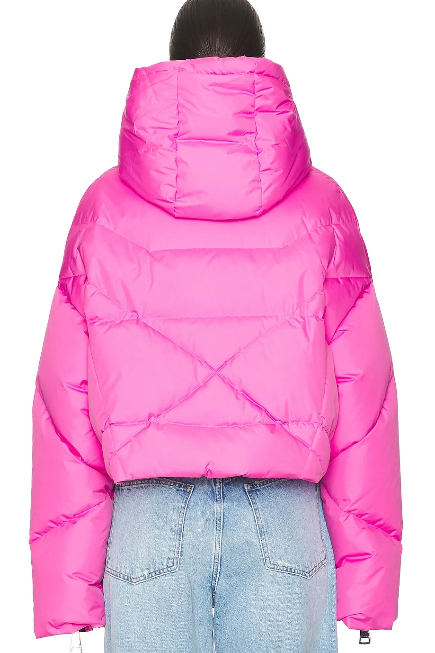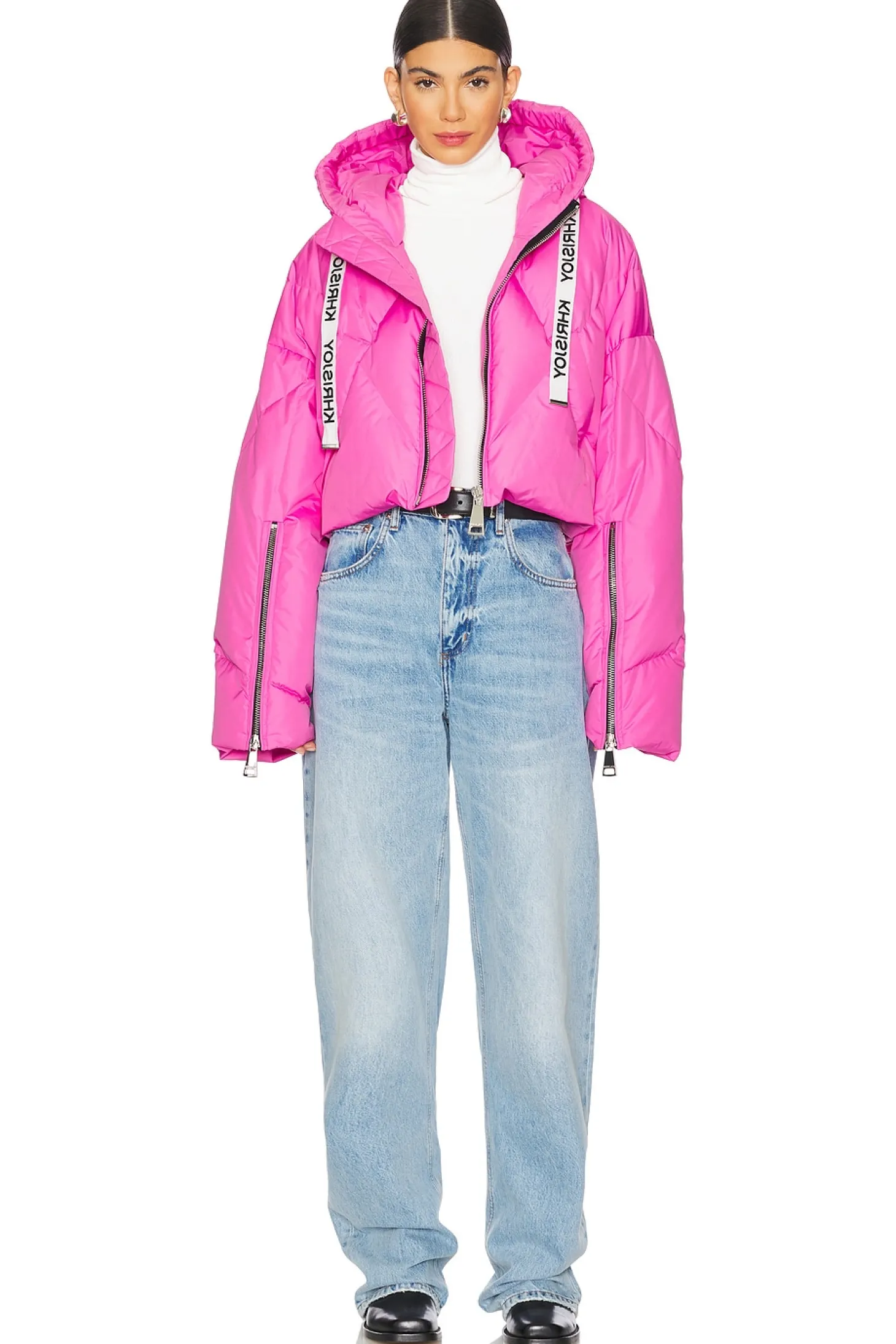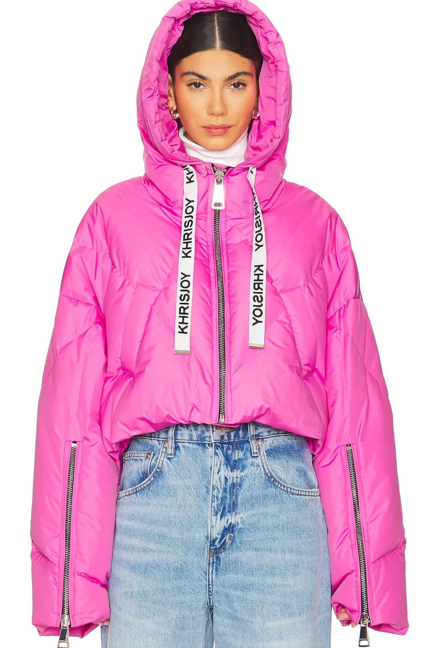 Self: 100% polyester Lining 1: 100% polyester Lining 2: 100% polyester Padding: 80% down 20% feathers.Made in Italy.Hand wash.Exposed front zipper closure.Side pockets.Drawstring hoodie with unique Khrisjoy drawstring.Zip cuffs.Padded ripstop fabric