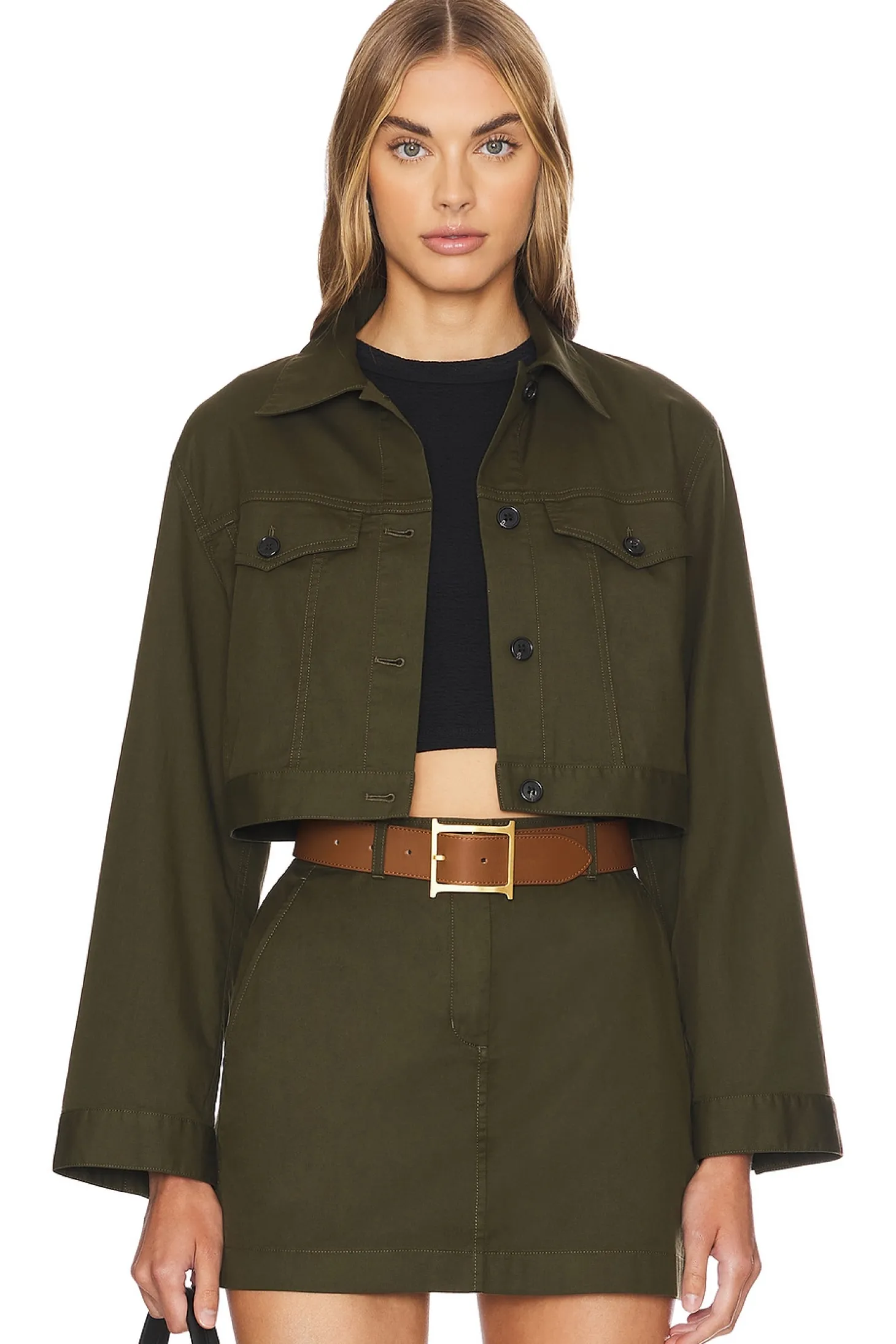 Self 1: 97% cotton 3% elastane Self 2: 100% cotton.Made in Vietnam.Machine wash.Front button closure.Front flap pockets.Buttoned cuffs.Cropped fit design Item not sold as a set