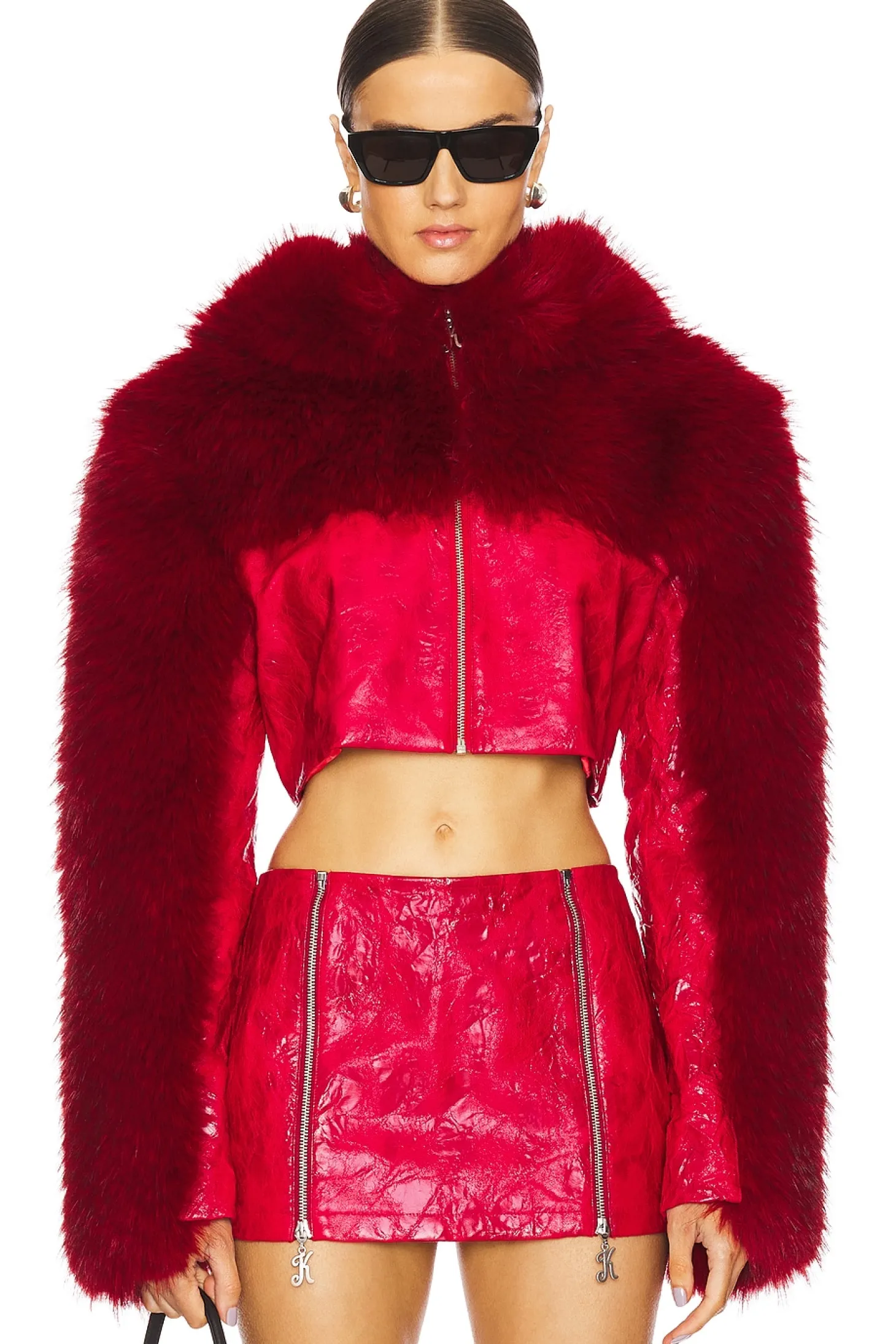 Self: 100% rayon Lining: 100% polyester.Made in China.Dry clean only.Front zip closure.Attached hood.Heavyweight faux leather fabric with faux fur trim