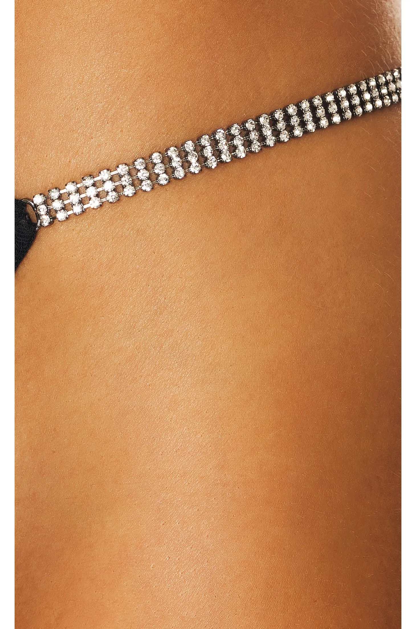 Self: 78% nylon 22% elastane Trim: 92% silk 8% elastane Gusset: 100% cotton.Made in China.Hand wash.Thong back.Crystal embellished hips traps.Mesh fabric with floral embroidery throughout
