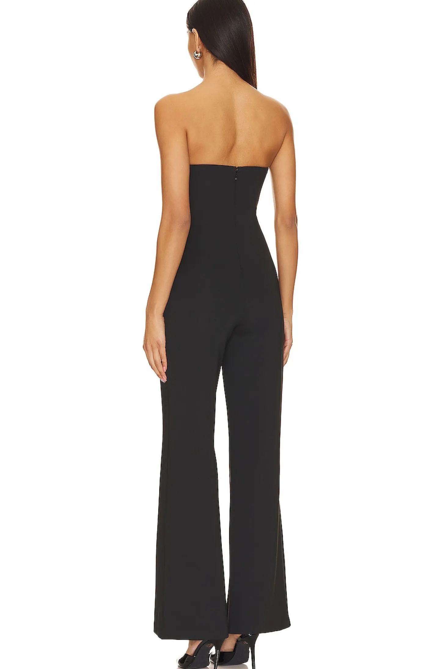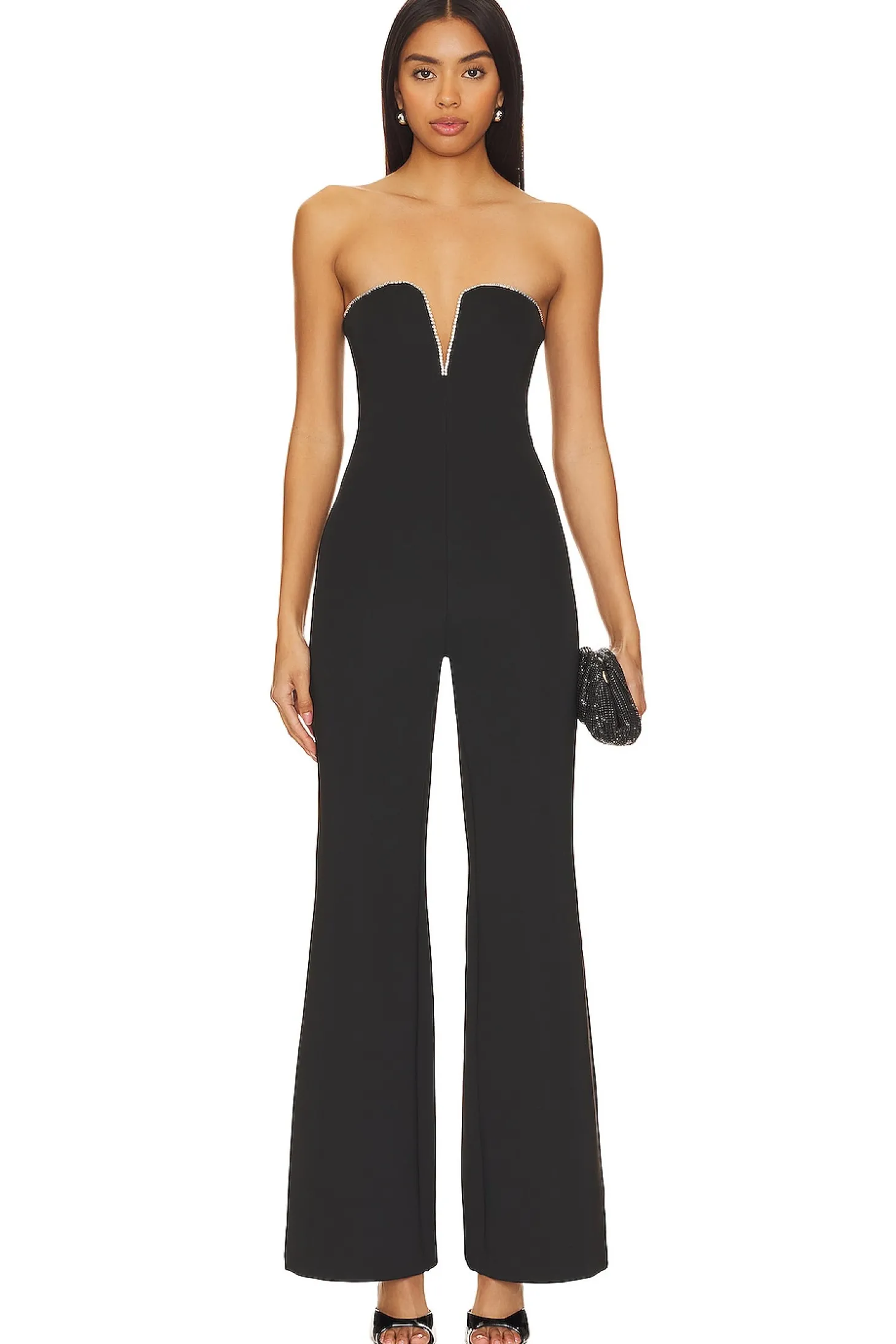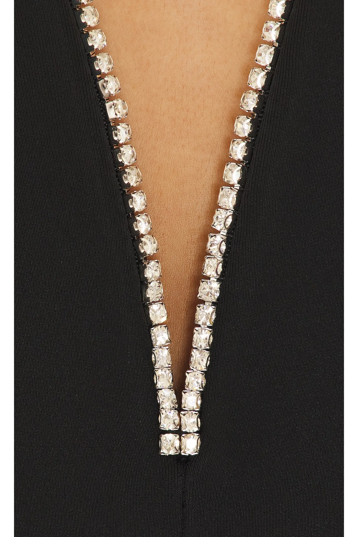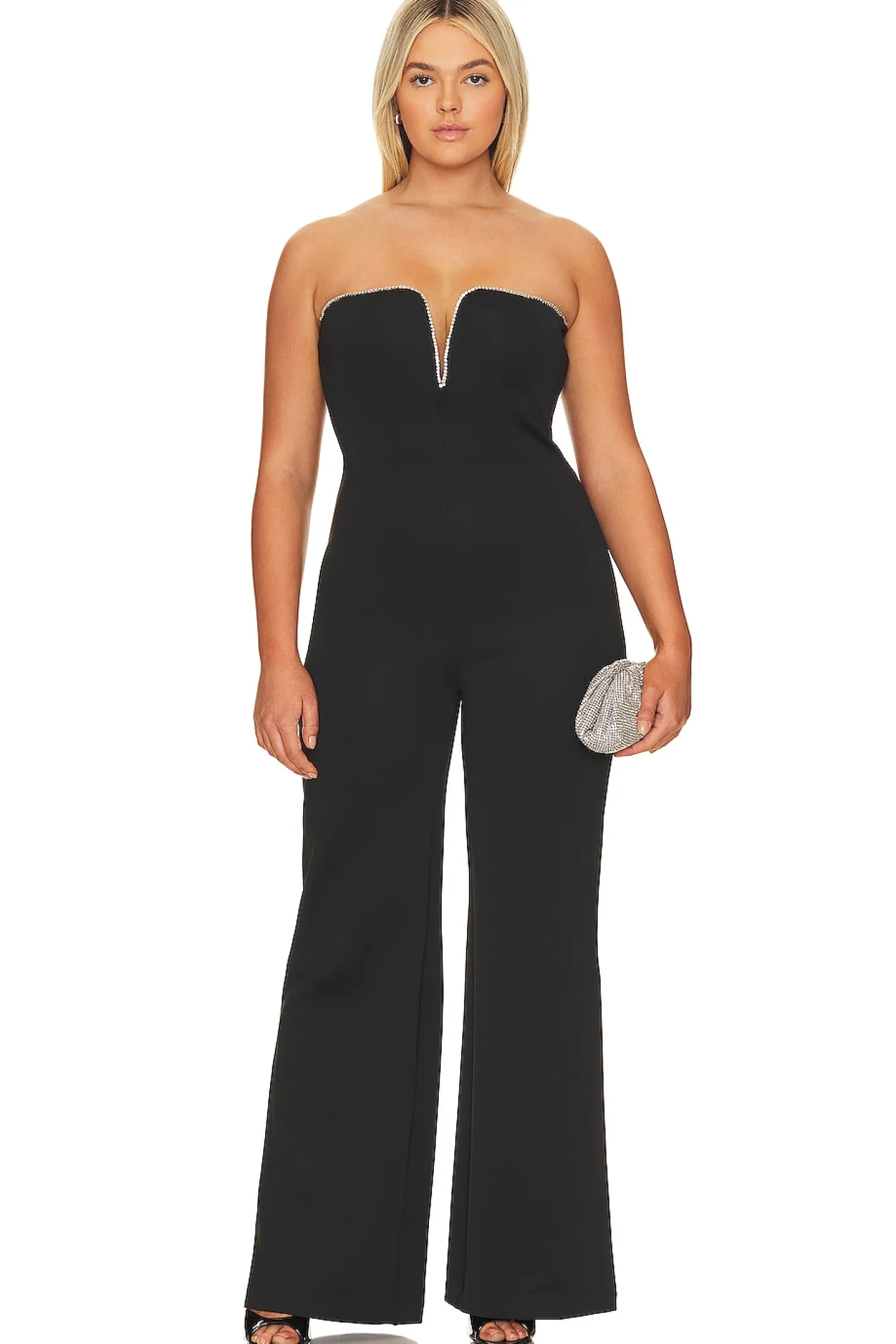 Self: 92% polyester 8% elastane Lining: 95% polyester 5% elastane.Made in China.Hand wash.Hidden back zipper closure.Crystal embellished rhinestone V-wire front.Stretch jersey fabric.Model 1 is wearing size XS Model 2 is wearing size L.The Crystal Scuba Jumpsuit is meticulously crafted from premium curve-hugging scuba fabric with a V-front trimmed in shimmering crystals.