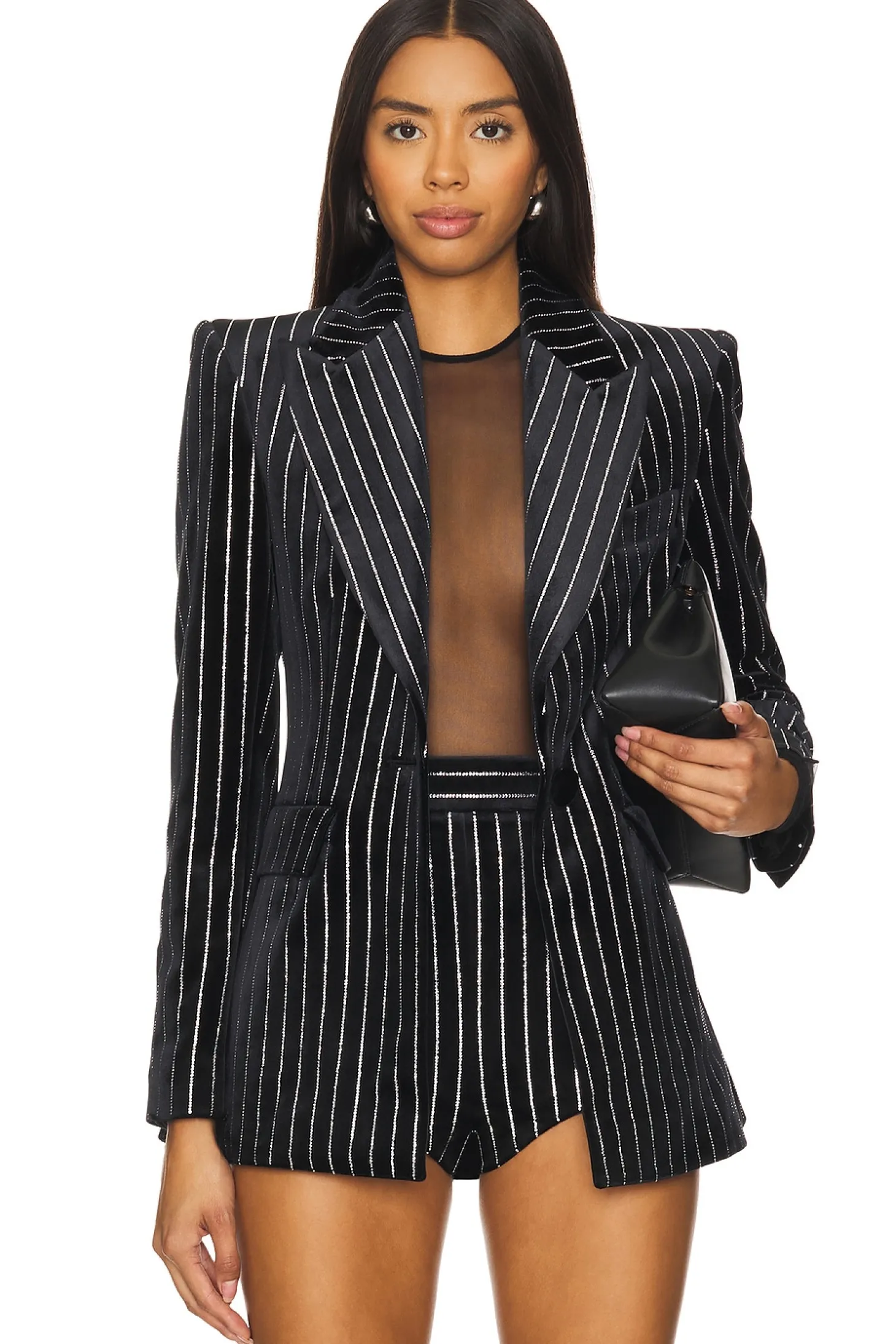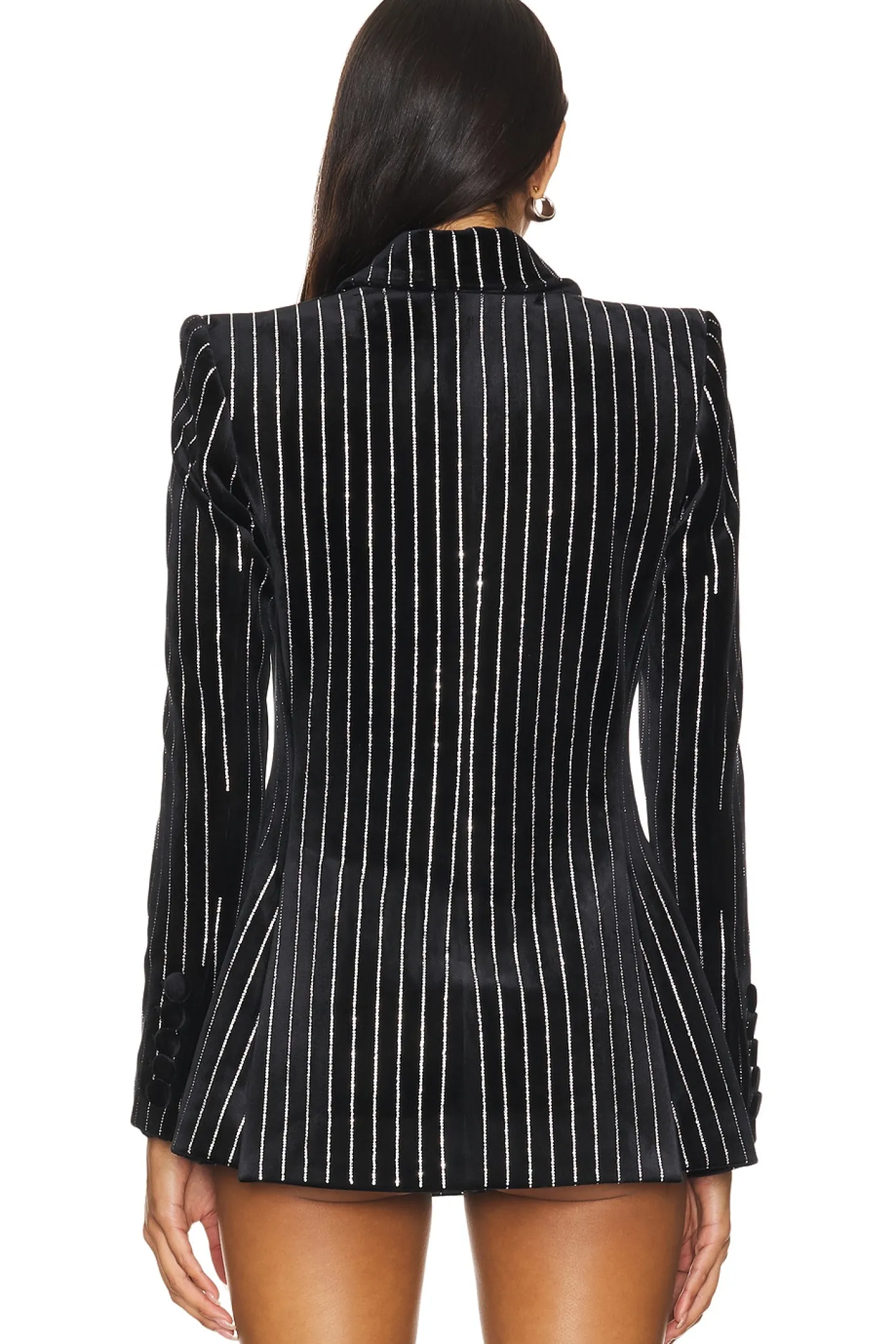Self: 95% polyester 5% elastane Lining: 80% acetate 20% polyester.Made in China.Dry clean only.Singular front button closure.Breast welt pocket and front flap pockets.Padded shoulder with button accent at cuff.Crystal embellished velvet fabric with back vent
