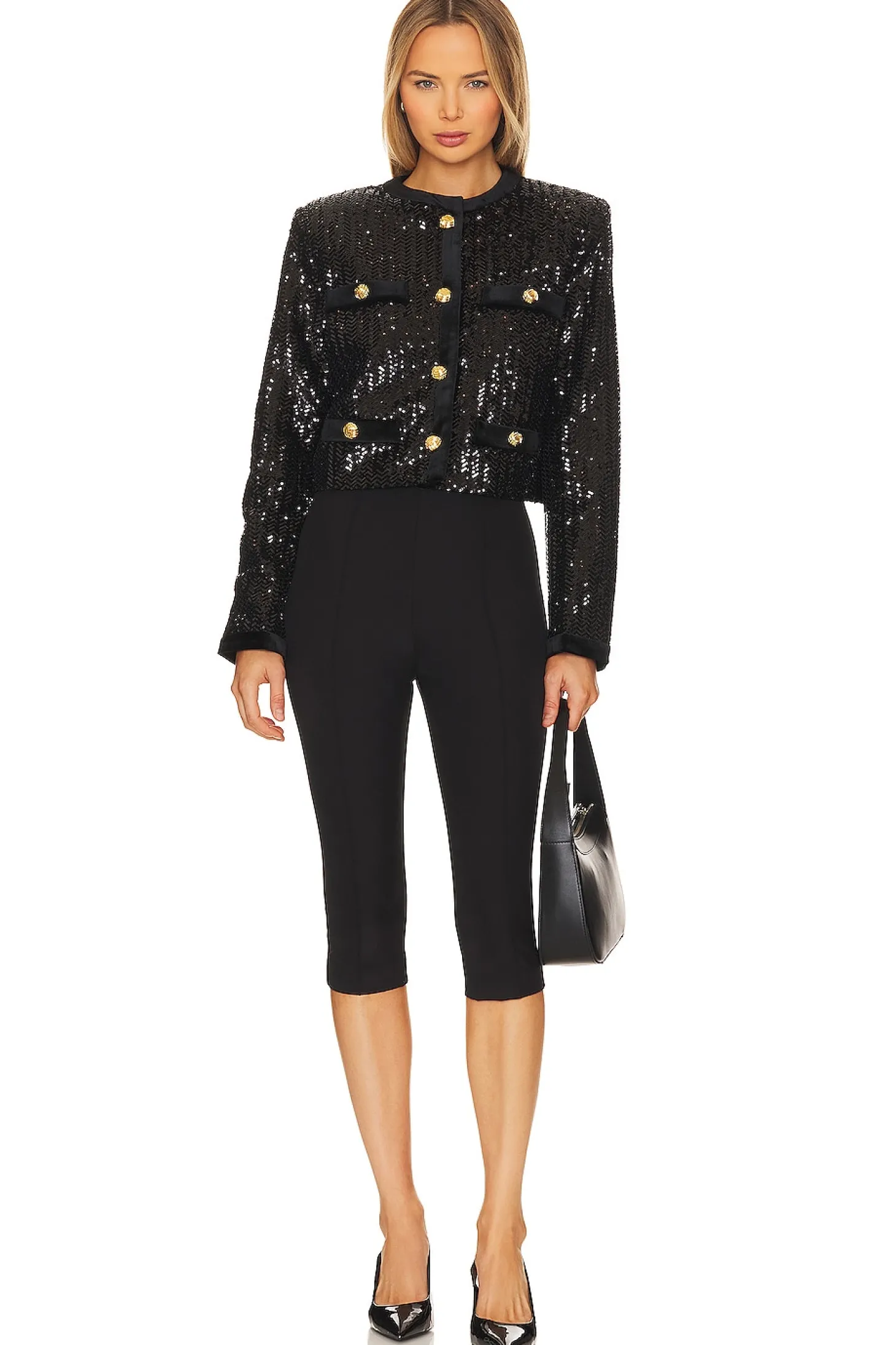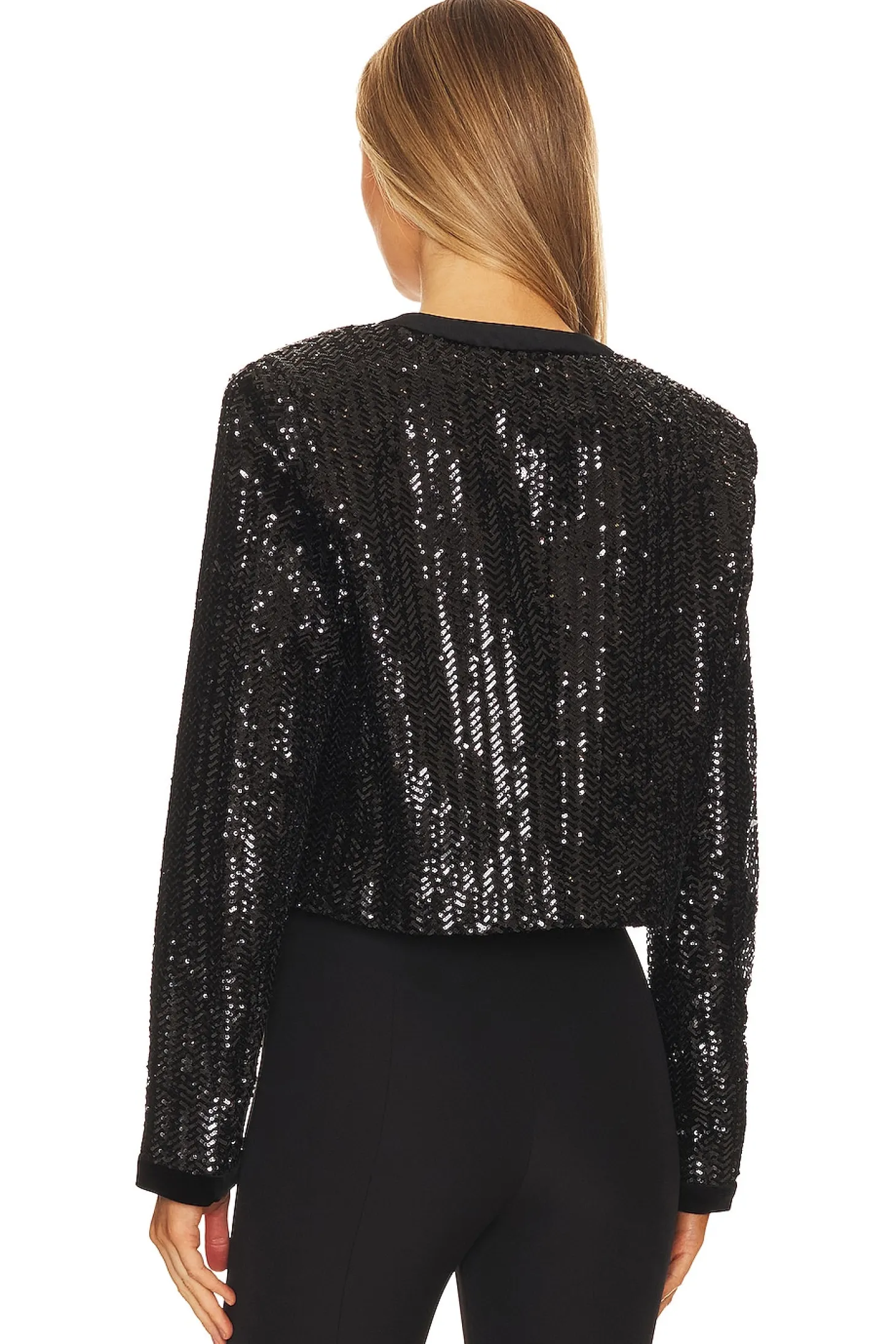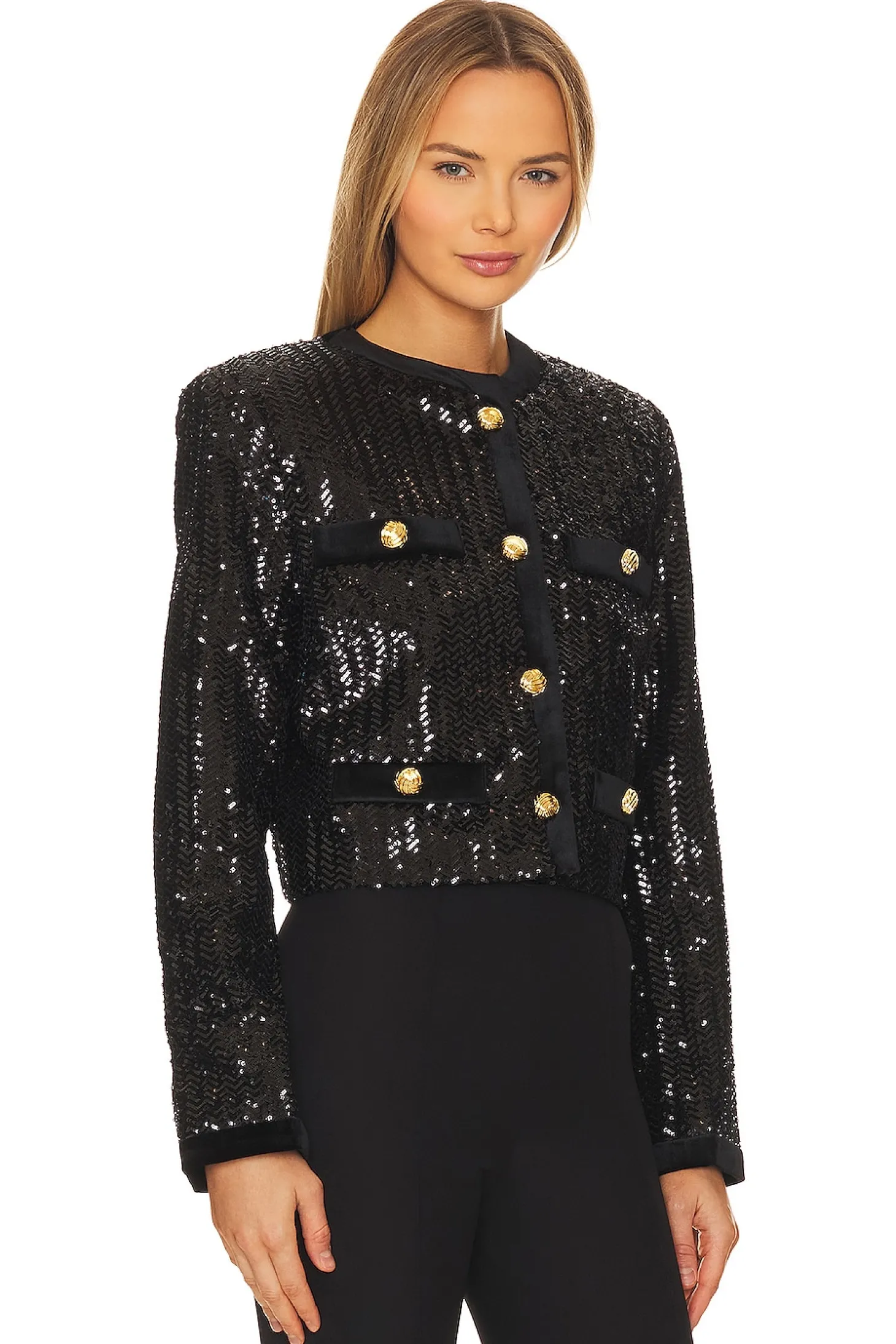 Self: 95% polyester 5% nylon Contrast Fabric: 94% polyester 6% spandex Lining: 55% viscose 45% polyester.Made in China.Dry clean only.Front gold-tone button closures.Padded shoulders.Faux front slip pockets.Velvet trim.Tonal sequin embellishments throughout